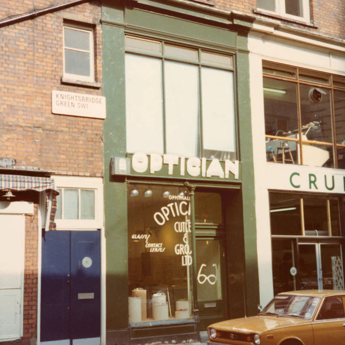 In 1969, Graham Cutler and Tony Gross, both trained opticians, decided that eyewear could carry identity as much as utility. Their first shop opened in 1971 at 16 Knightsbridge Green, a space deliberately staged with Perspex shelves, mahogany counters, and industrial lamps that made the shop feel closer to an art studio than an optician’s office. Upstairs, master framemaker George Smith hand-carved acetate sheets, sanded edges, and polished curves into frames that were as individual as the customers who wore them. This approach broke away from the standardised, hospital-issue glasses common in Britain at the time, quietly reshaping the idea of eyewear from medical function to cultural statement.