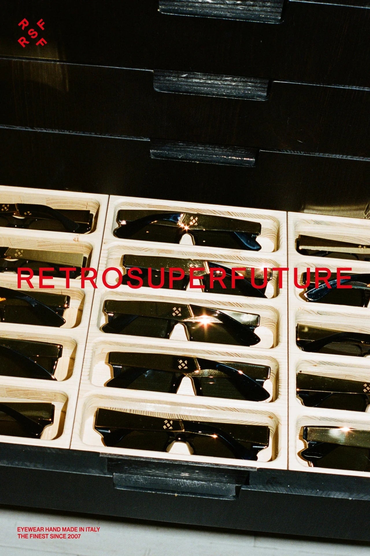 RETROSUPERFUTURE was created in 2007 by Daniel and Simon Beckerman, who were then producing the independent music magazine PIG. Their move into eyewear grew from a simple intuition. The market felt predictable and muted, so they introduced thick Italian acetate in clear and expressive colours. The idea resonated instantly within Milan’s cultural circles. Artists, musicians and designers began wearing the frames not as accessories but as part of a visual identity that felt intelligent and assured. The brand’s rise was driven by this natural alignment rather than by marketing, which remains a defining part of its character today.