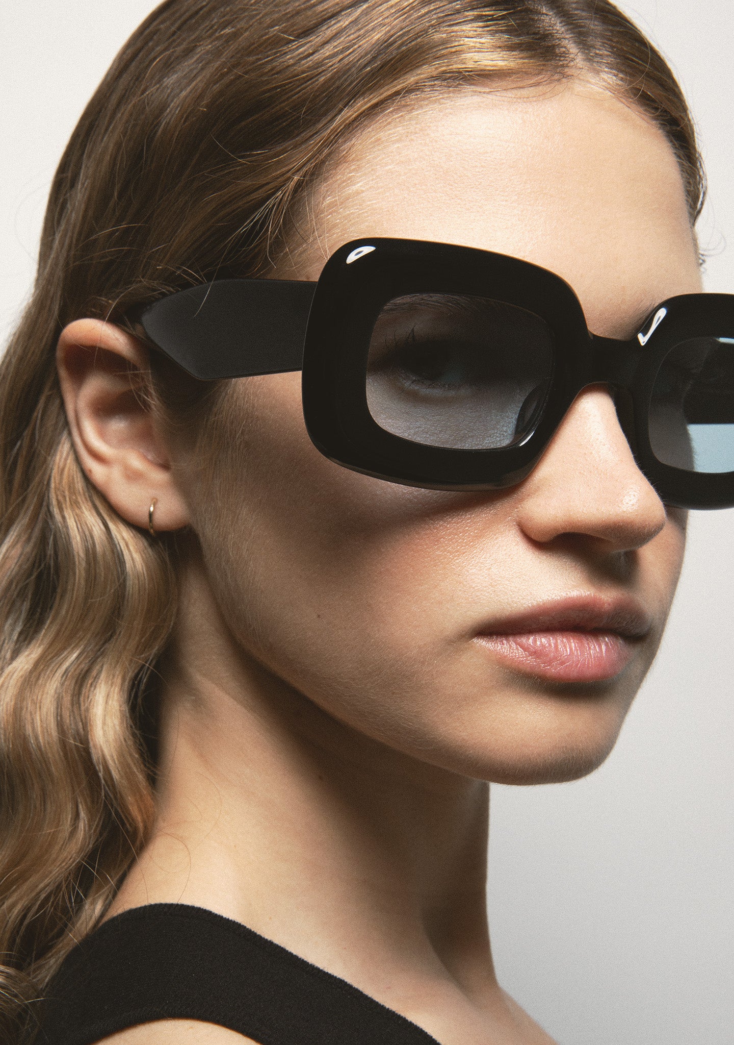 Rectangular-shaped sunglasses with milling throughout the front and temples for a voluminous effect. Black acetate front and temples. Blue photochromic lens, base 2, with UV protection and anti-reflective treatment. Category 1-3 lens. Integrated acetate nose pads. Handmade.