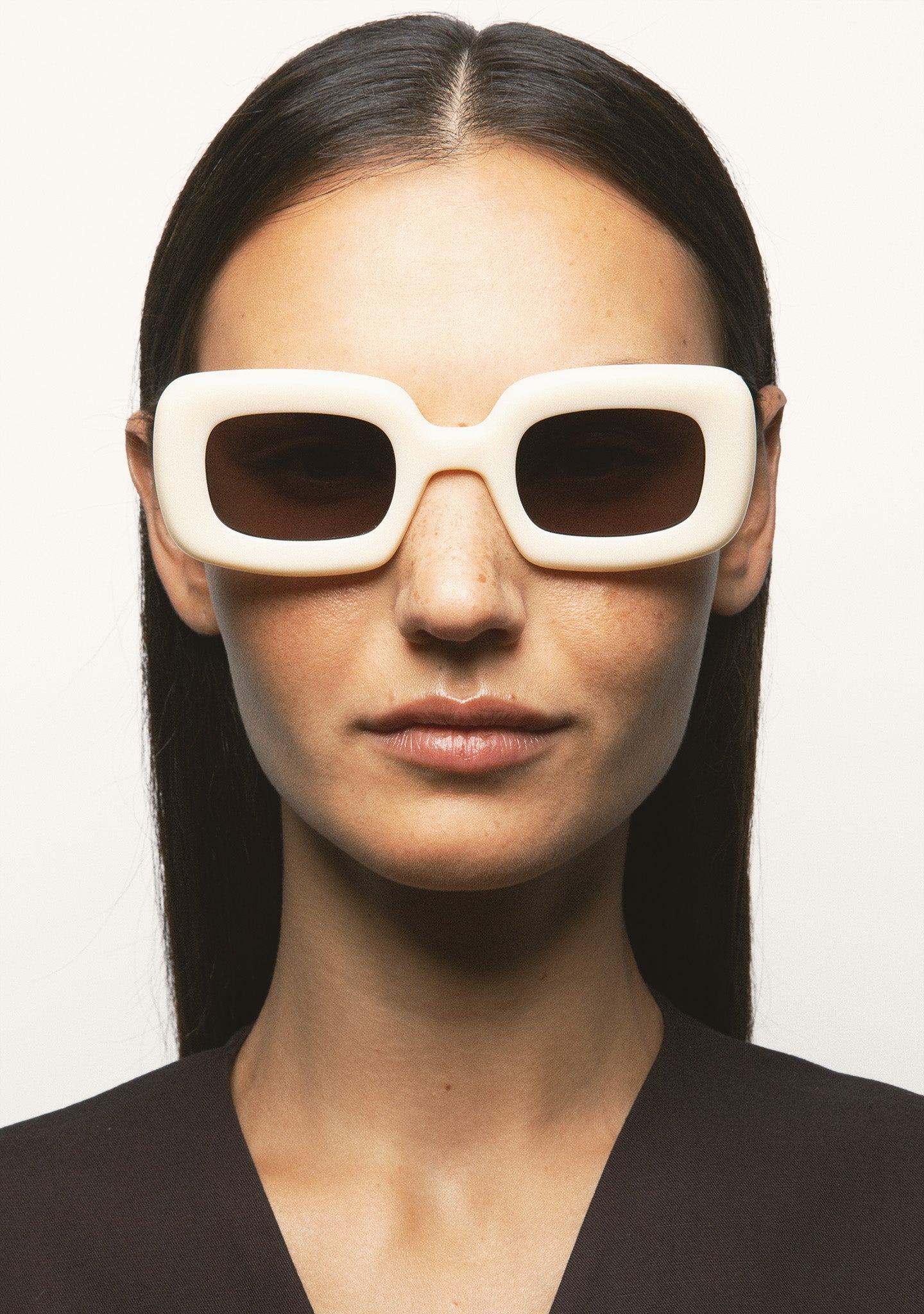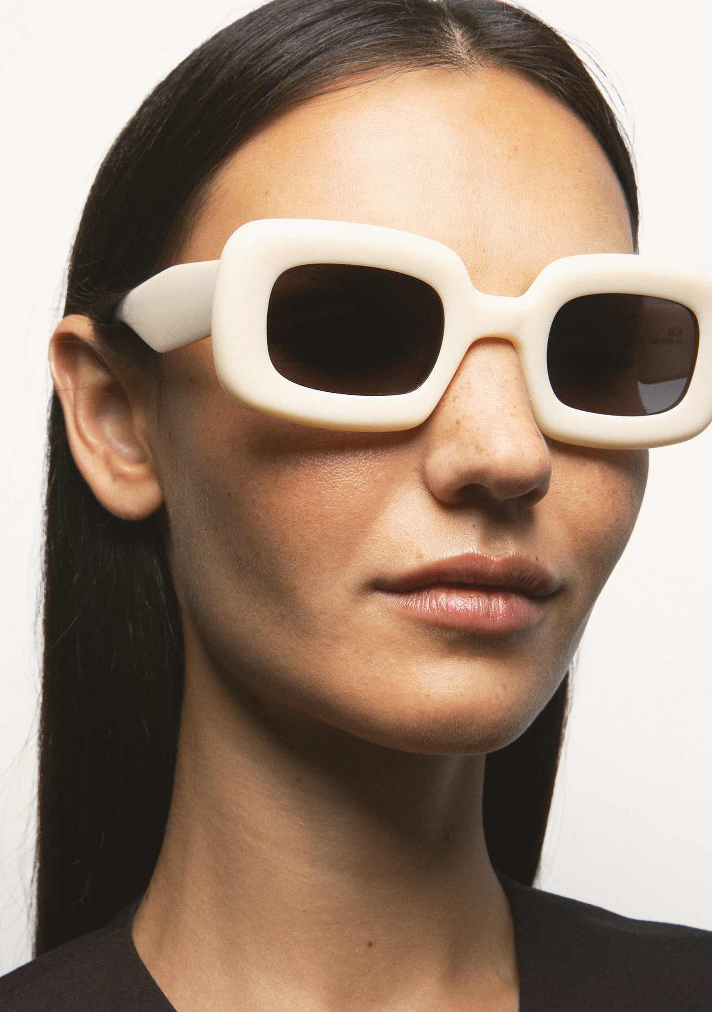 Rectangular-shaped sunglasses with milling throughout the front and temples for a voluminous effect. Black acetate front and temples. Blue photochromic lens, base 2, with UV protection and anti-reflective treatment. Category 1-3 lens. Integrated acetate nose pads. Handmade.