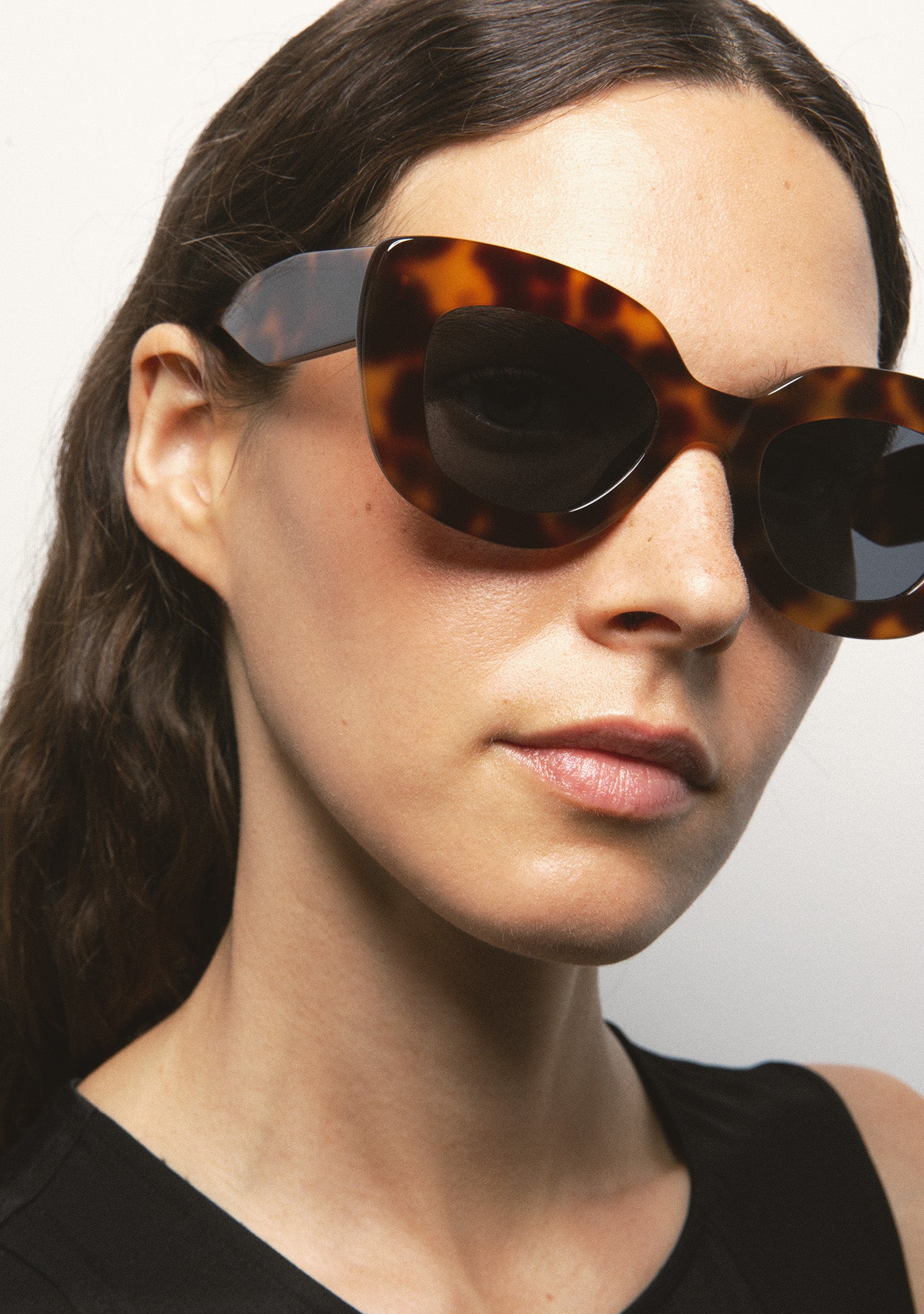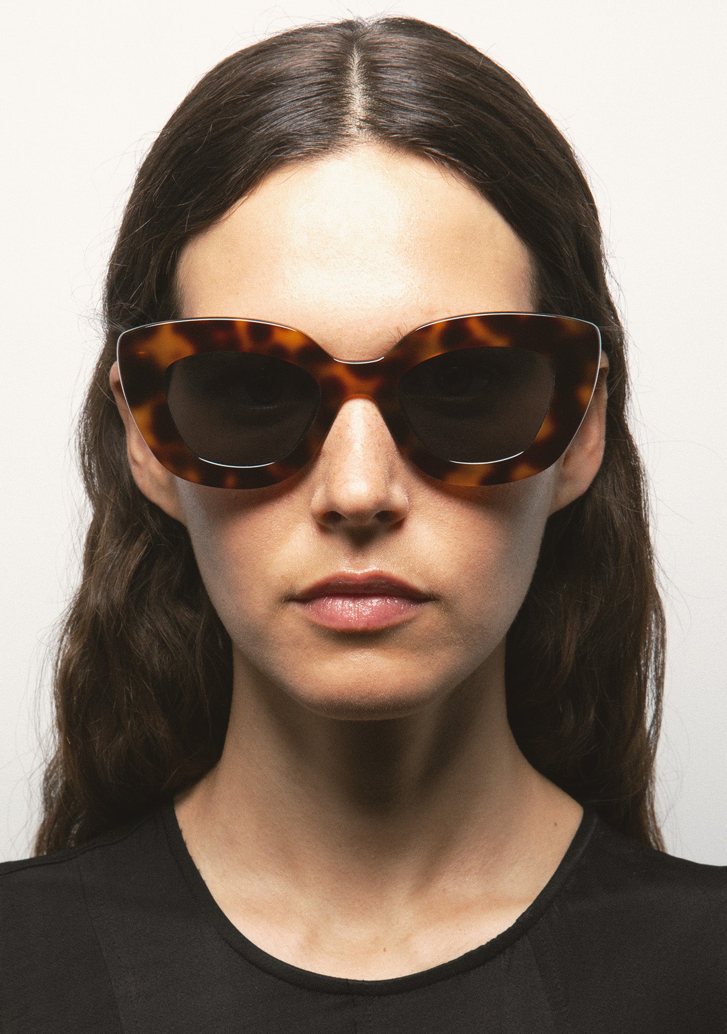 Cat-eye sunglasses. Black acetate front and temples. Black gradient 2-base lens with 100% UV protection and anti-reflective treatment. Category 3 lenses. Built-in acetate nose pads. Handmade.