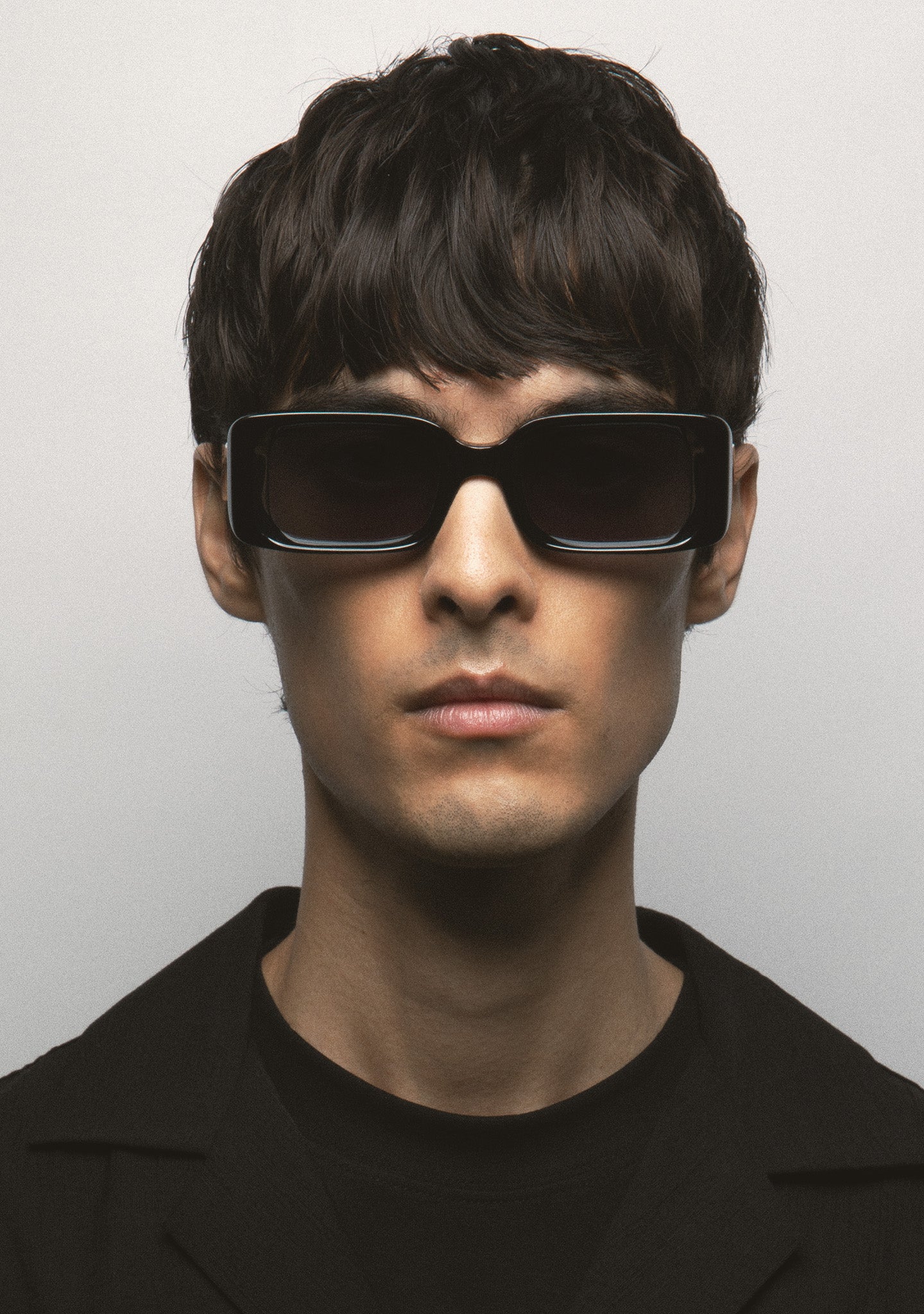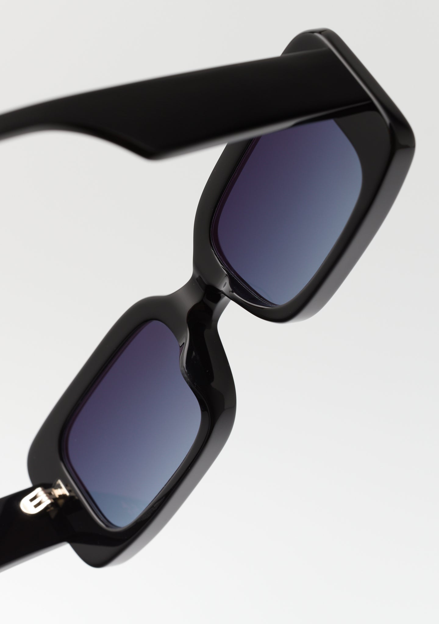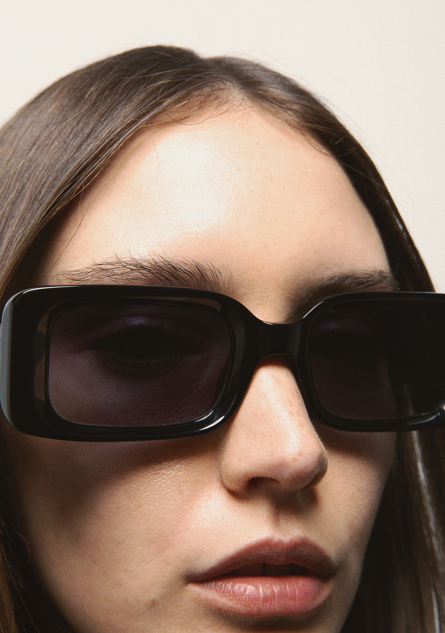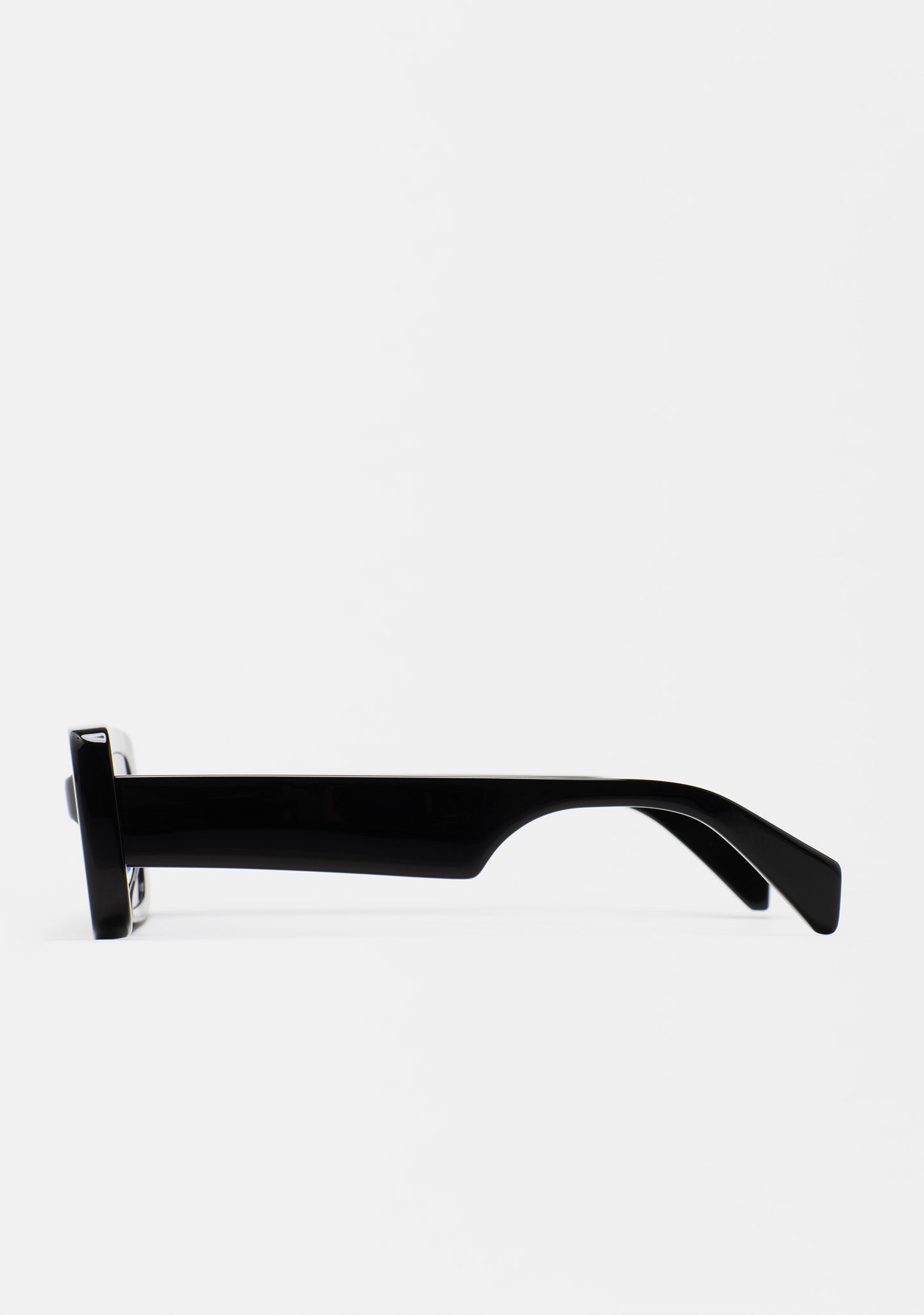 Sunglasses in thick monochrome black acetate. Rectangular shape with milling around the lenses. Acetate temples. Green 2-base photochromic lenses. Category 1-3 lenses. Built-in acetate nose pads. Handmade.