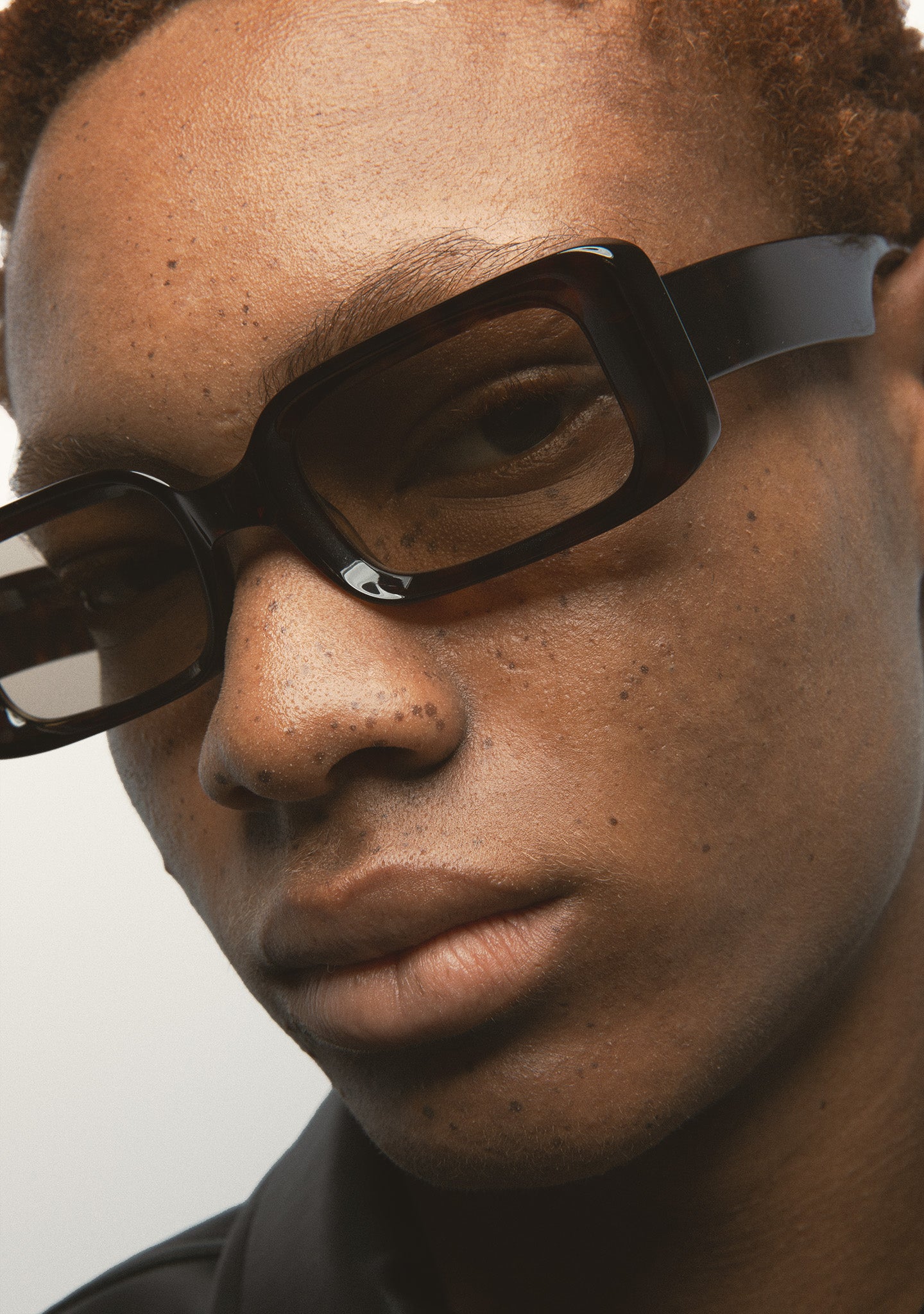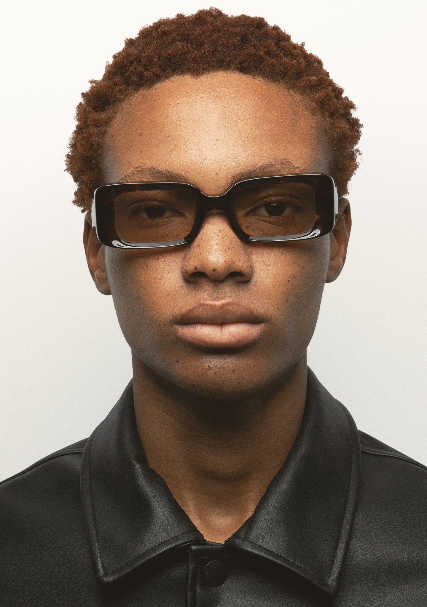 Sunglasses in thick monochrome black acetate. Rectangular shape with milling around the lenses. Acetate temples. Green 2-base photochromic lenses. Category 1-3 lenses. Built-in acetate nose pads. Handmade.