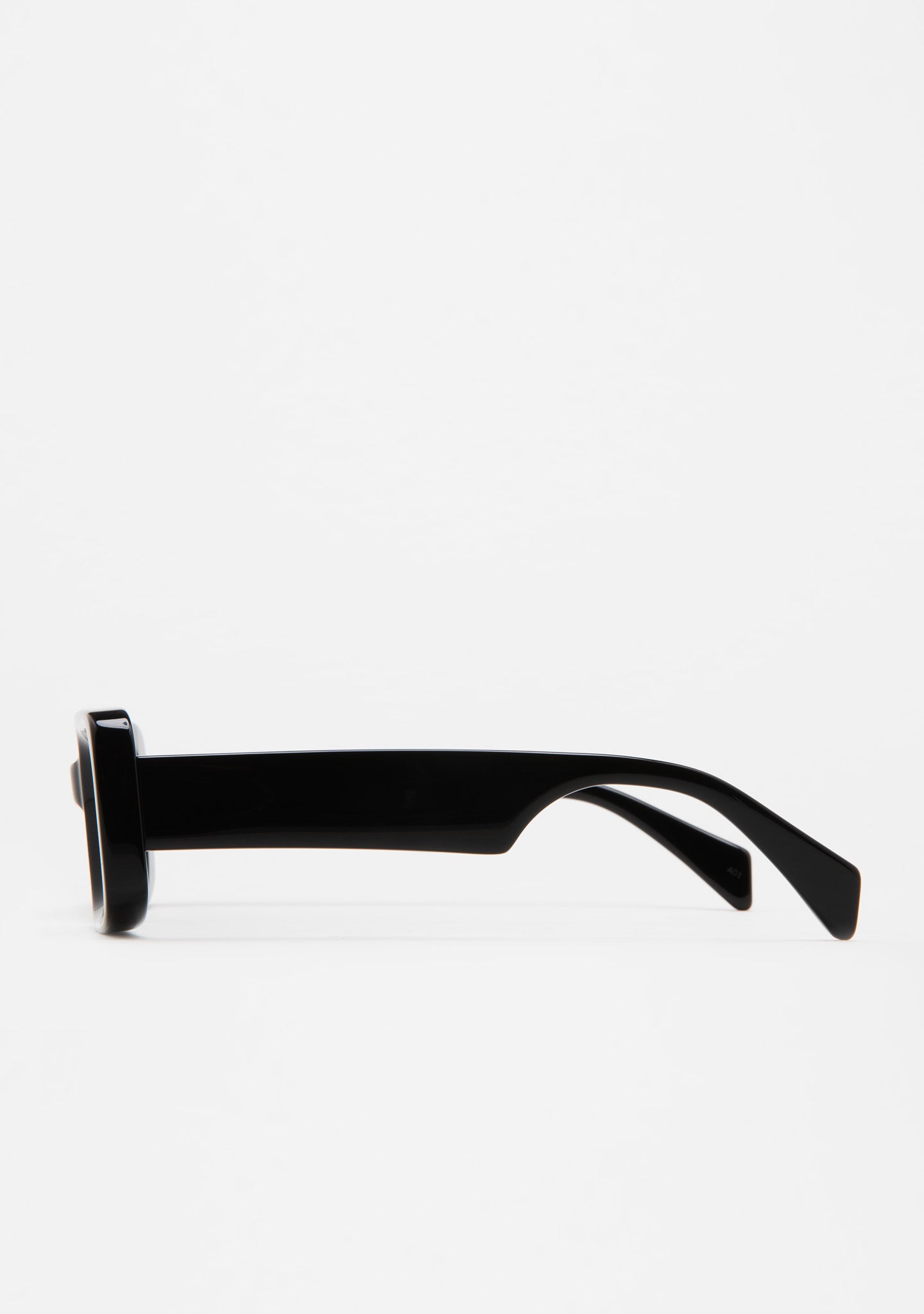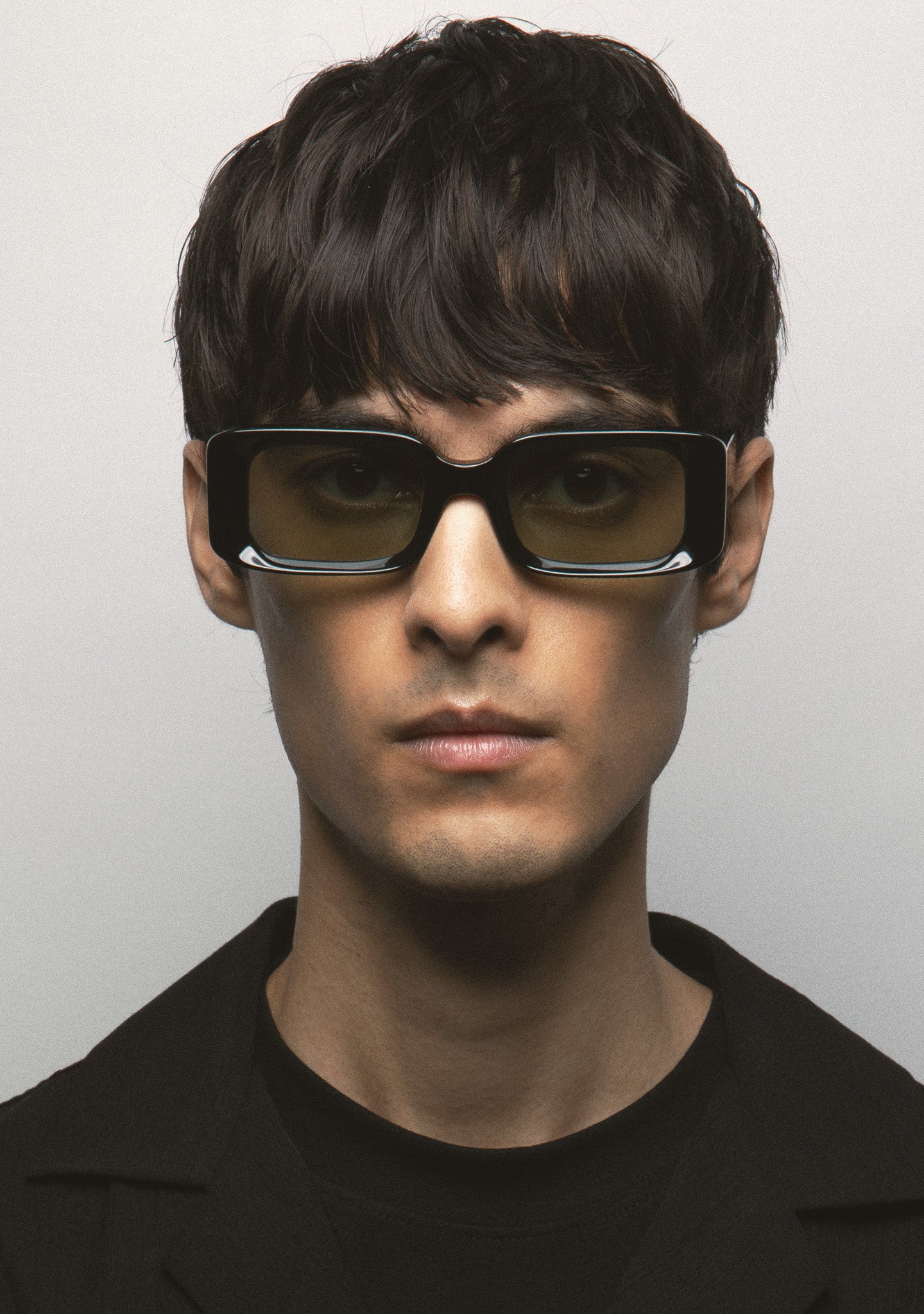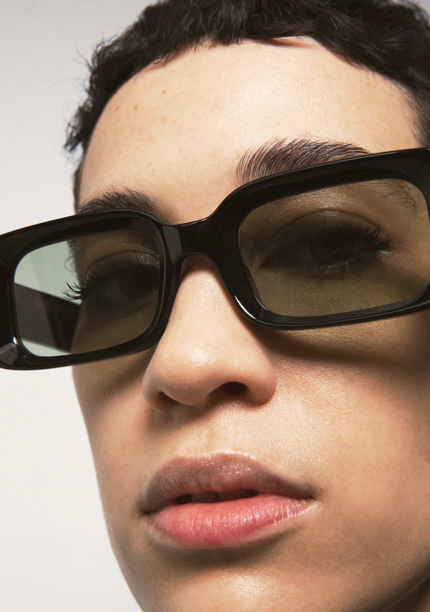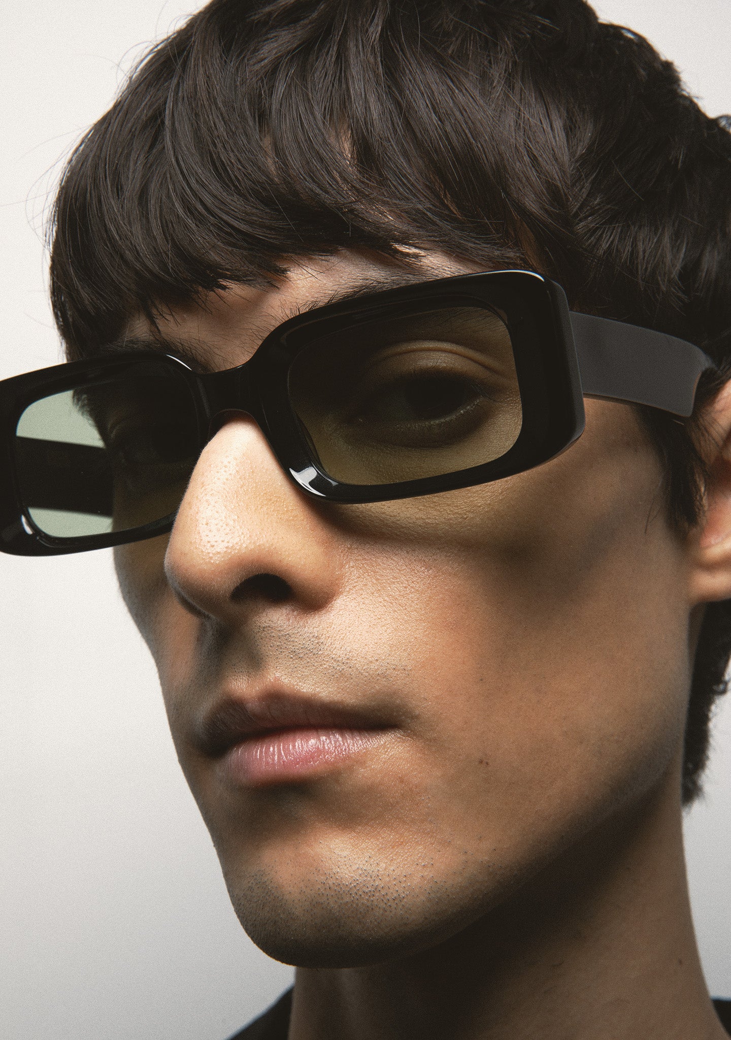 Sunglasses in thick monochrome black acetate. Rectangular shape with milling around the lenses. Acetate temples. Green 2-base photochromic lenses. Category 1-3 lenses. Built-in acetate nose pads. Handmade.