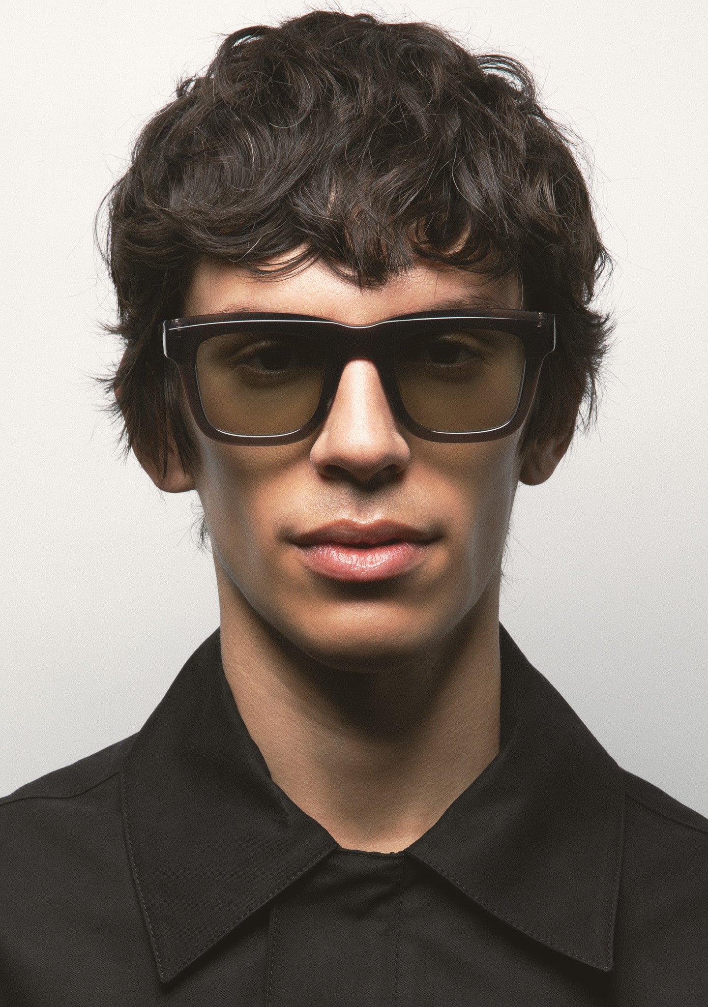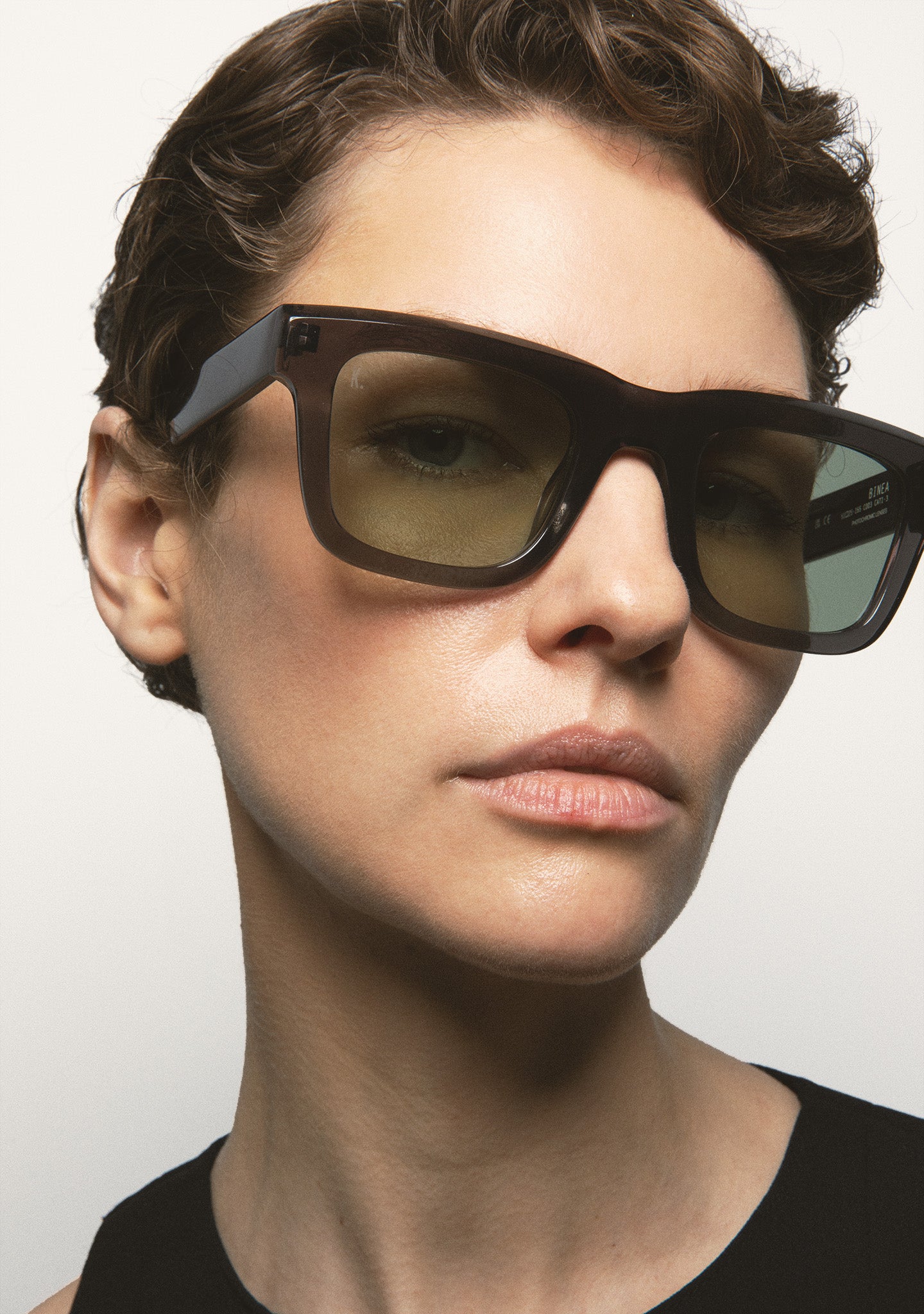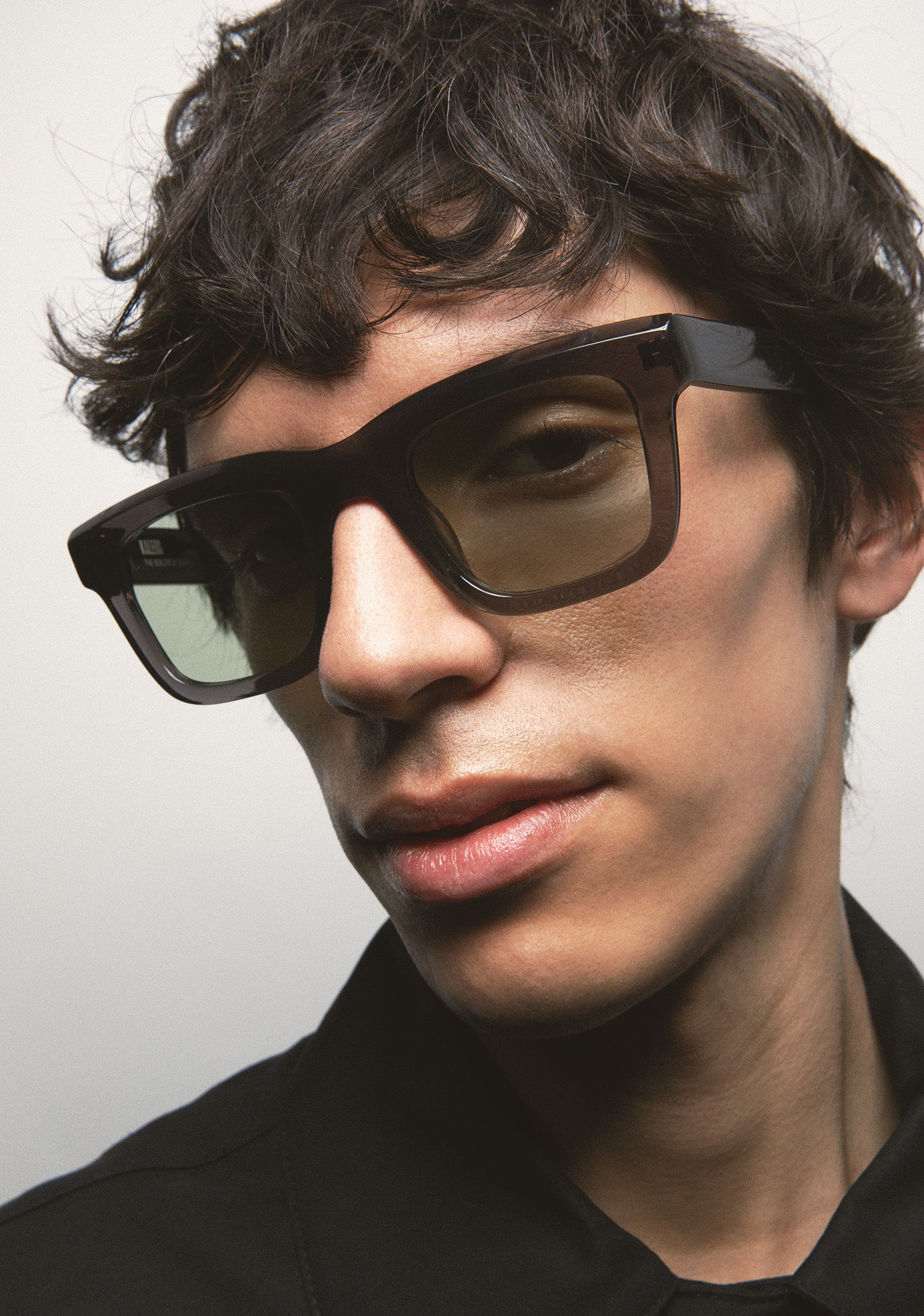 Square sunglasses with brow carving. Thick black acetate front with a carved upper section. Black acetate temples. Grey mineral lens (Barberini), base 2, with 100% UV protection and anti-reflective treatment. Category 3 lens. Integrated acetate nose pads. Handcrafted.