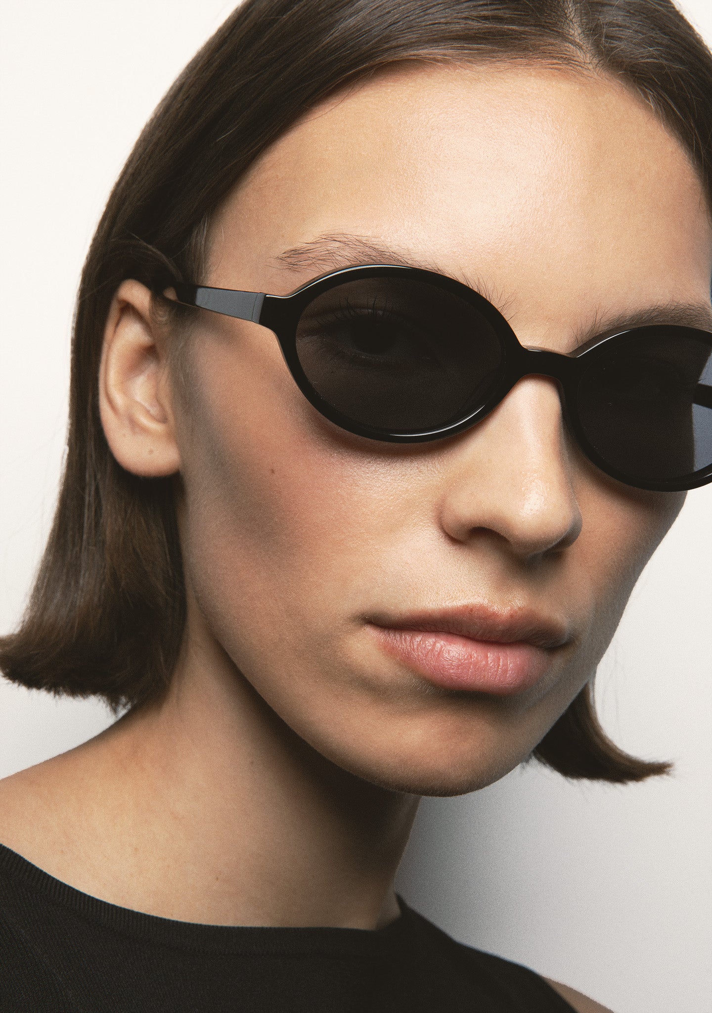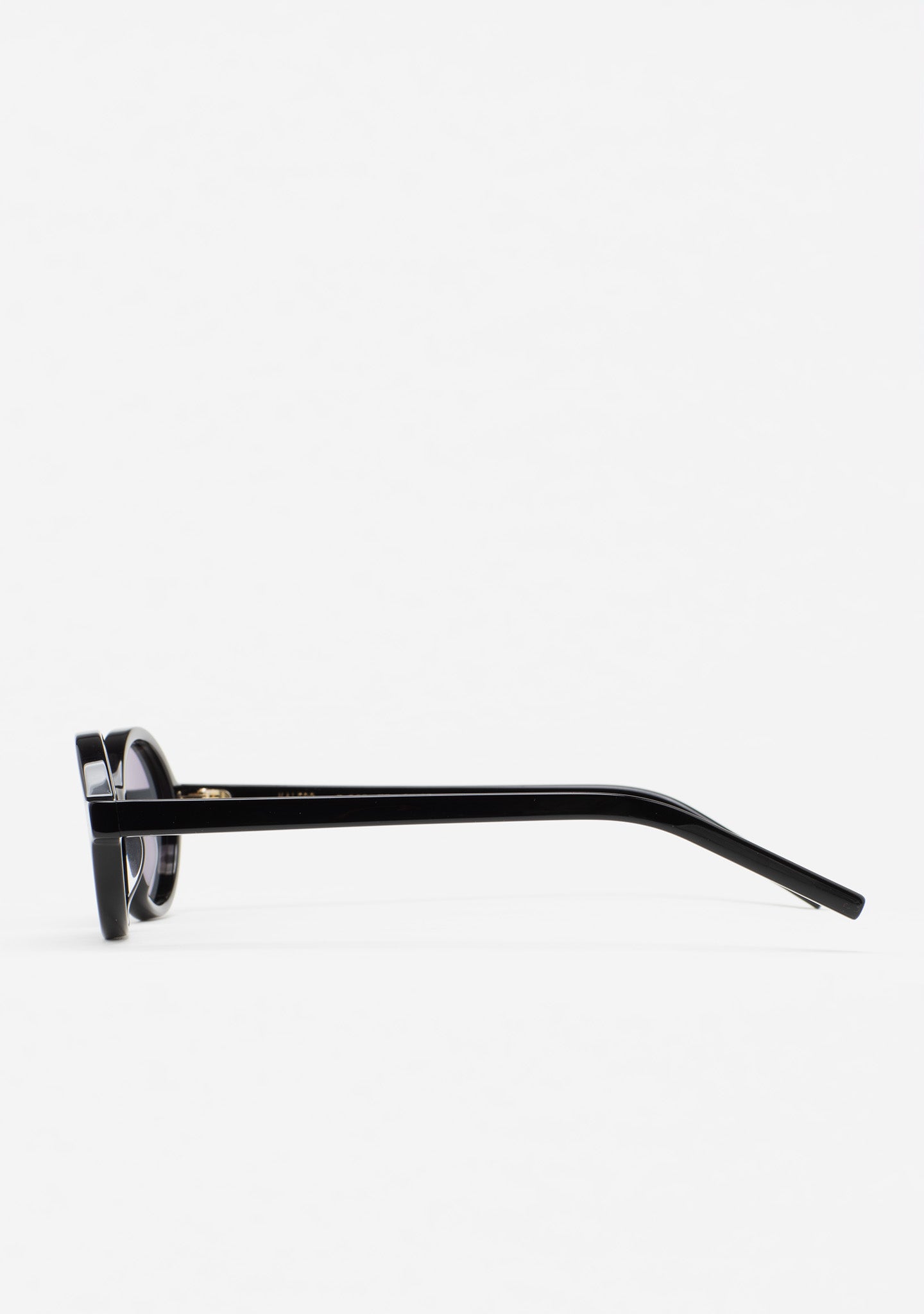 Oval-shaped sunglasses. Black acetate front and temples. Green photochromic lens, base 2, with UV protection and anti-reflective treatment. Category 1-3 lens. Integrated acetate nose pads. Handmade.