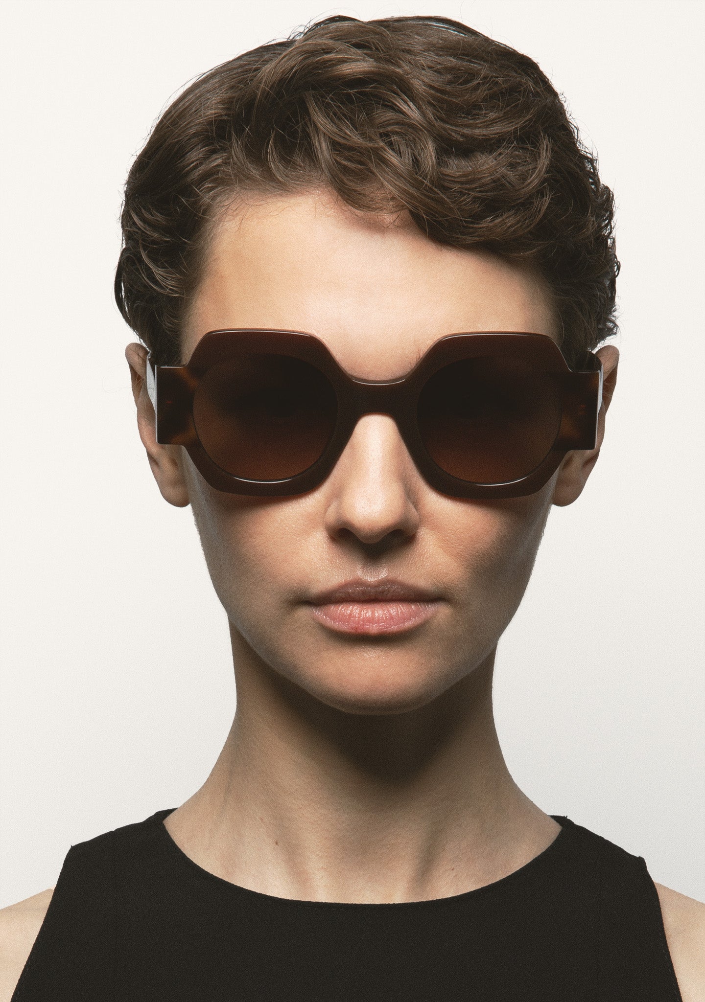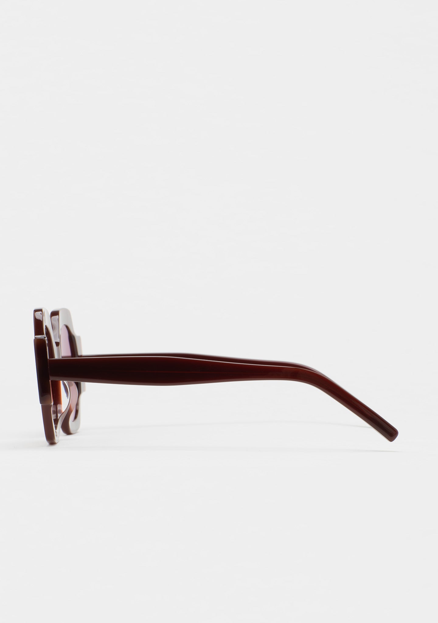 Square Sunglasses. Black acetate front with brown Havana laminate. Brown Havana acetate temples. Gray gradient lenses, base 2, with 100% UV protection and anti-reflective coating. Category 3 lenses. Integrated acetate nose pads. Handmade.