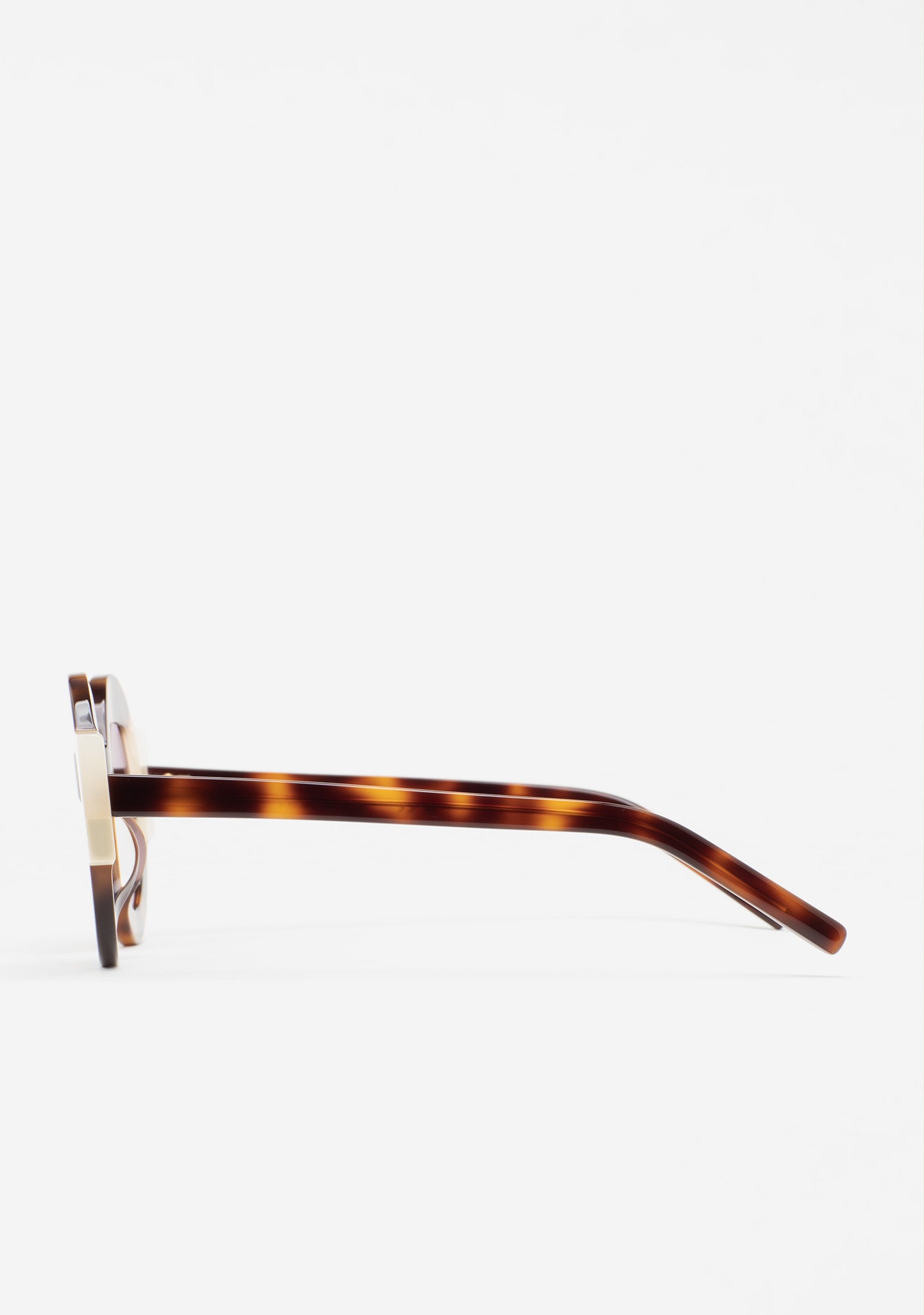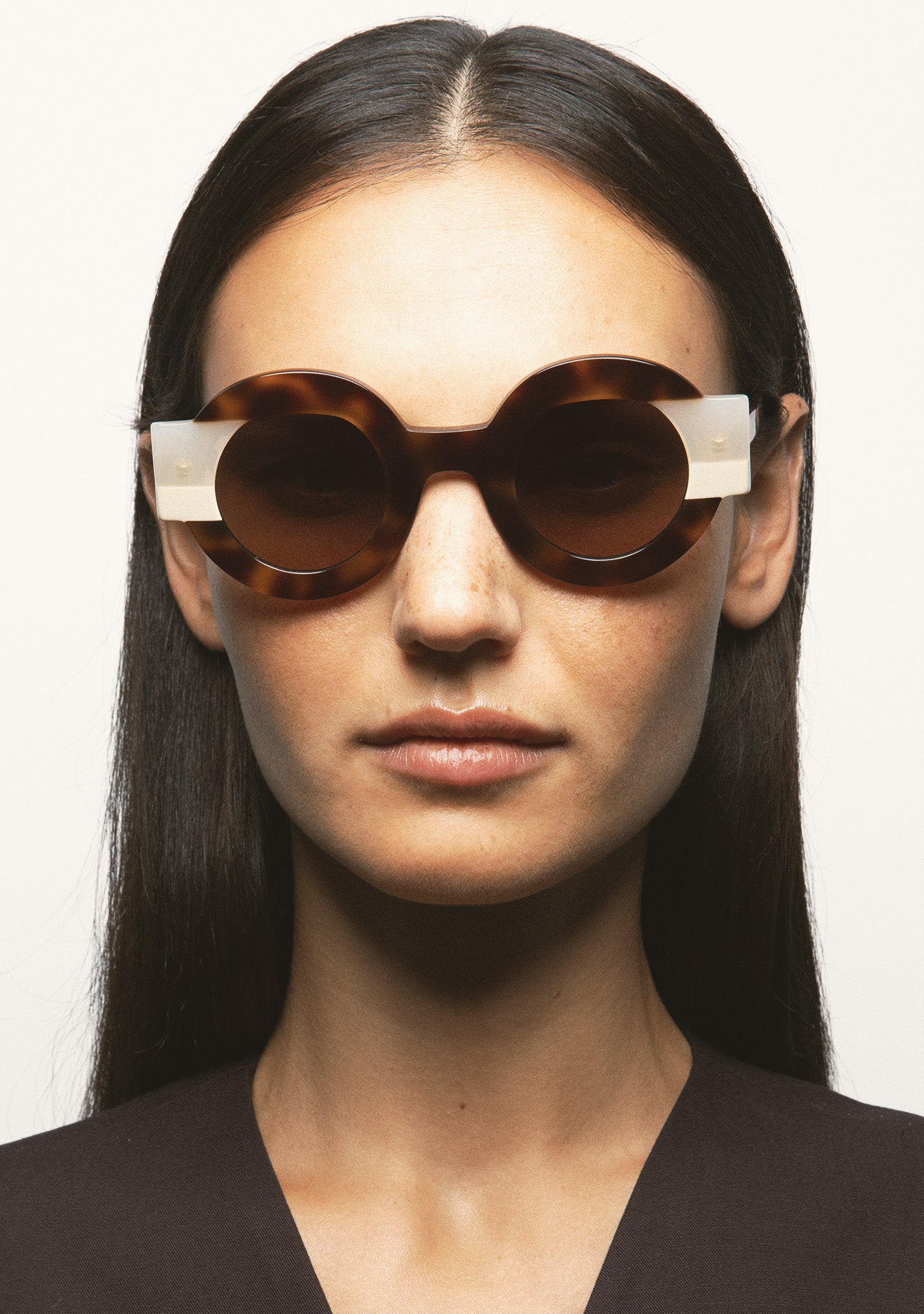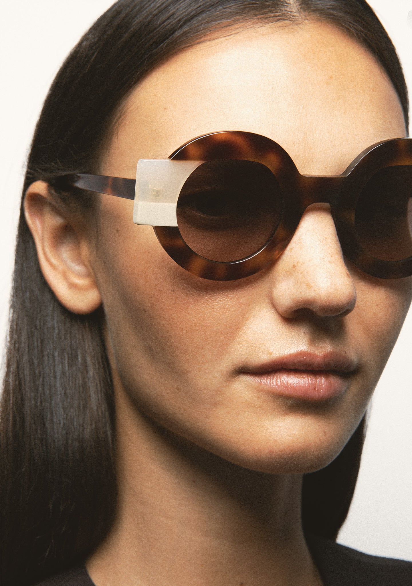 Round Sunglasses. Black acetate front with double Havana brown and beige laminates. Black gradient lenses with 100% UV protection and anti-reflective coating. Category 3 lenses. Integrated acetate nose pads. Handmade.
