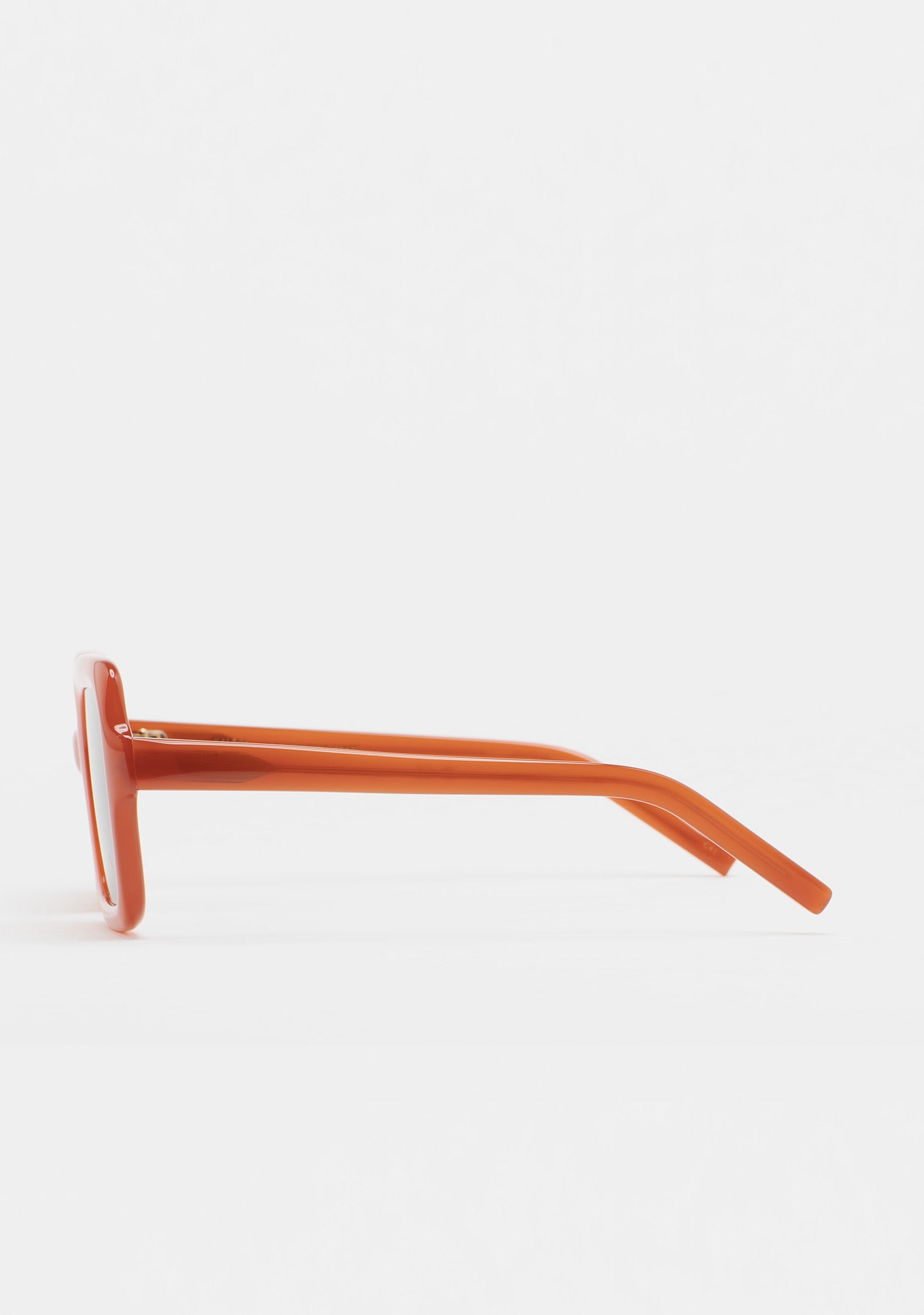Square Sunglasses with milling throughout the frame perimeter. Translucent orange acetate front and temples. Brown gradient lenses, base 2, with 100% UV protection and anti-reflective coating. Category 3 lenses. Integrated acetate nose pads. Handmade.