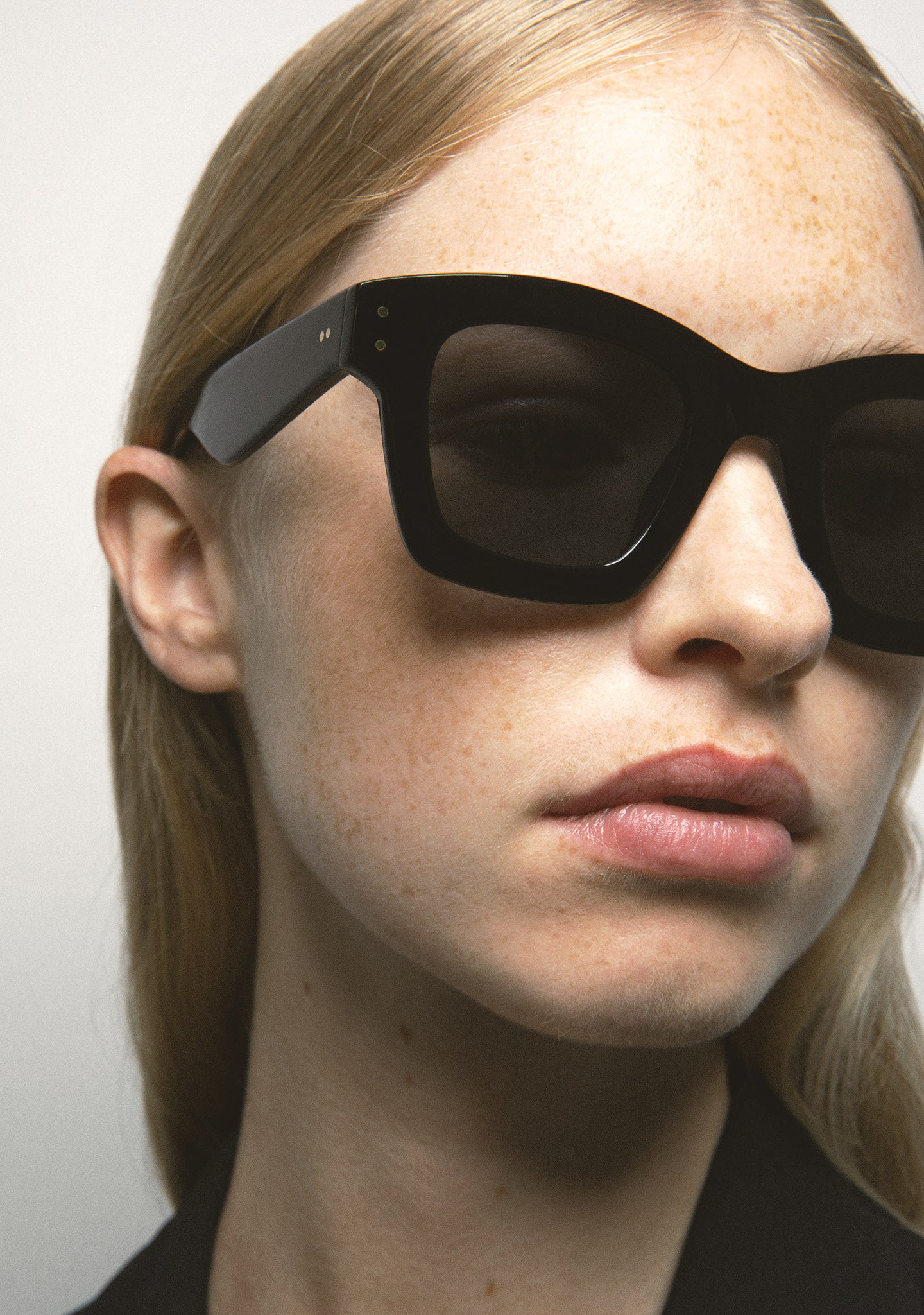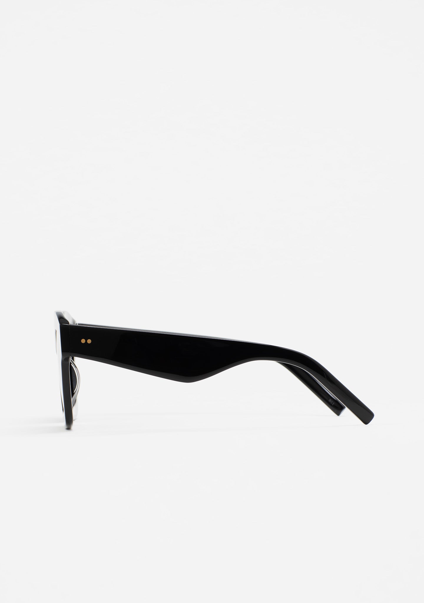 Square-shaped sunglasses. Black acetate front and temples. Gold rivet hinges on the corners and temples. Gray 2-base lens with 100% UV protection and anti-reflective treatment. Category 3 lenses. Built-in acetate nose pads. Handmade.