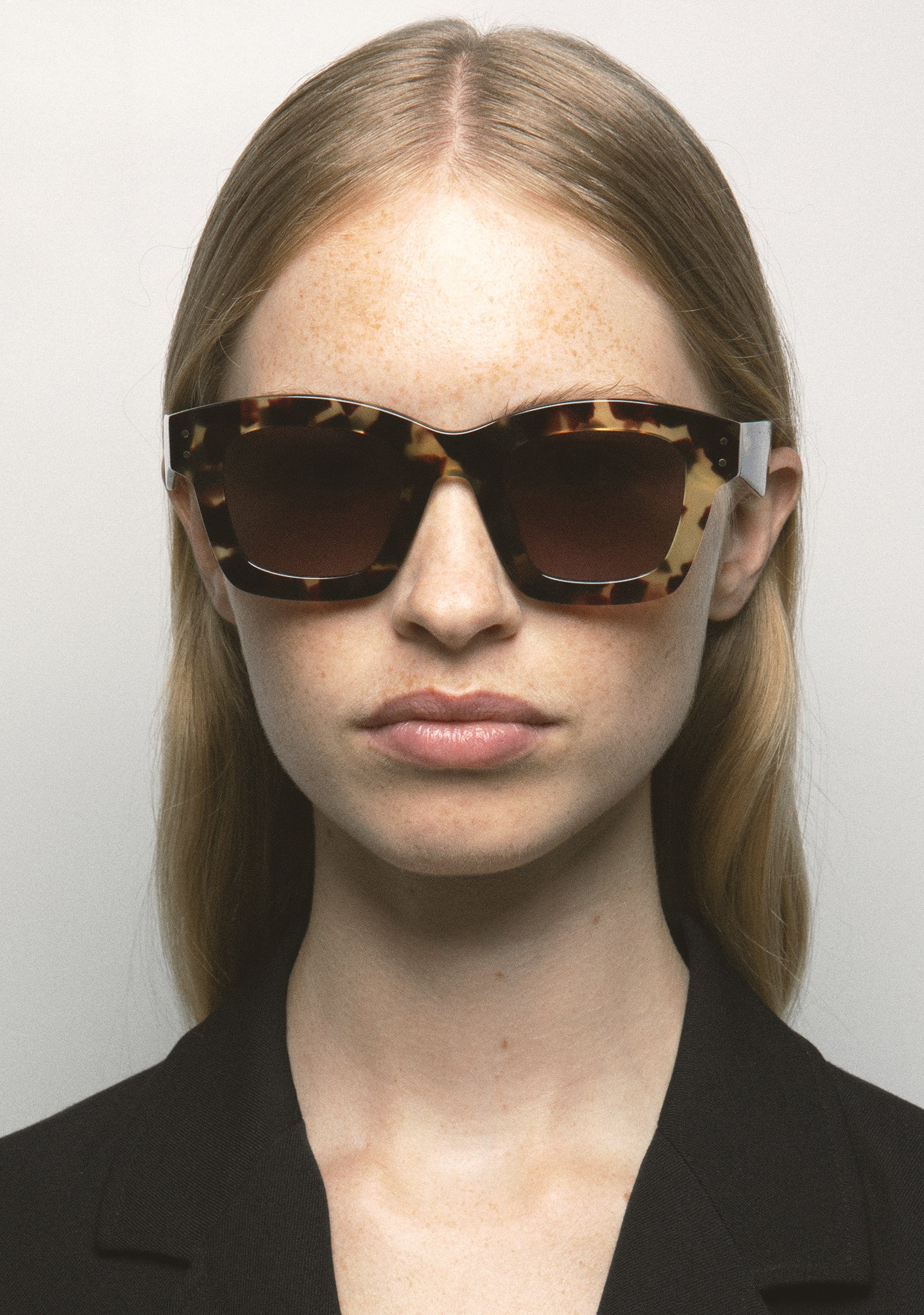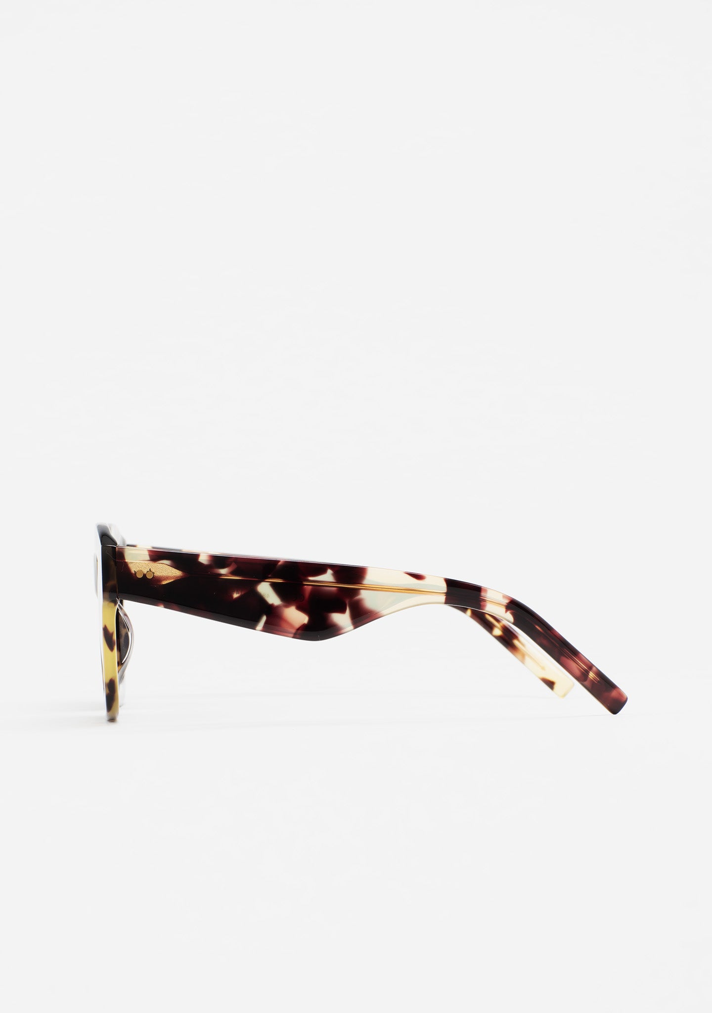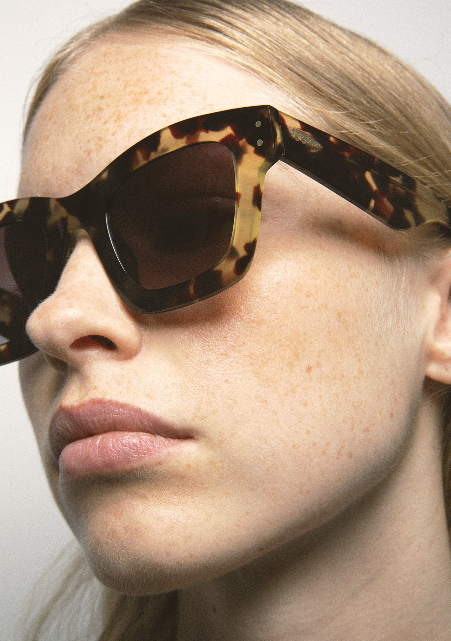 Square-shaped sunglasses. Black acetate front and temples. Gold rivet hinges on the corners and temples. Gray 2-base lens with 100% UV protection and anti-reflective treatment. Category 3 lenses. Built-in acetate nose pads. Handmade.