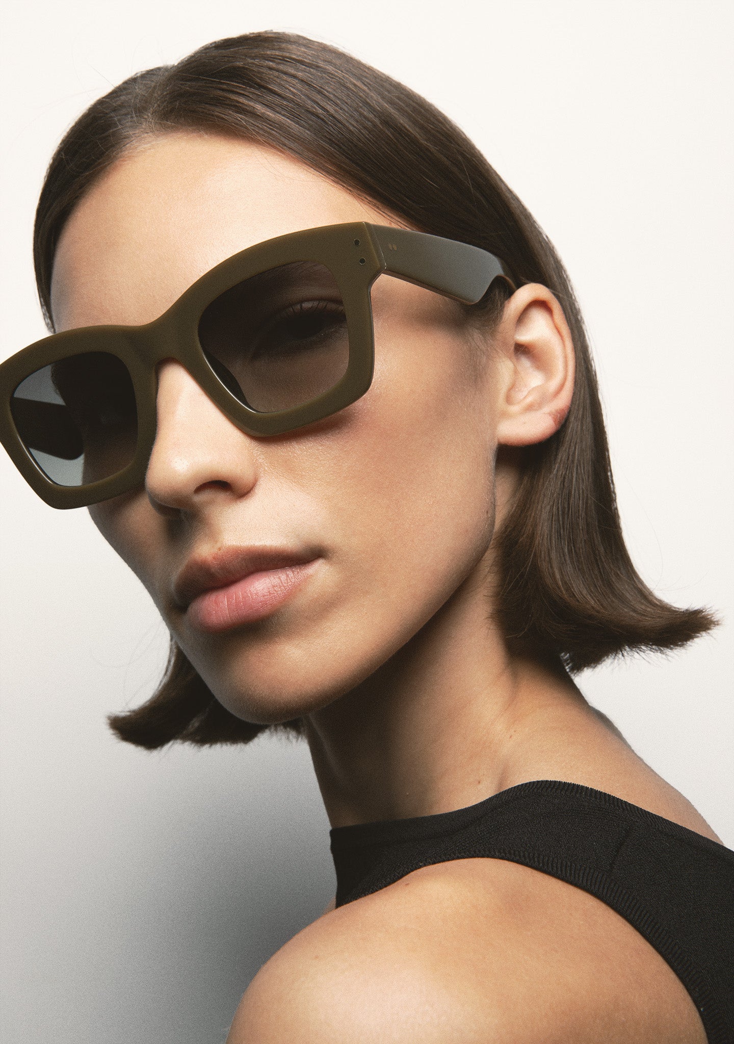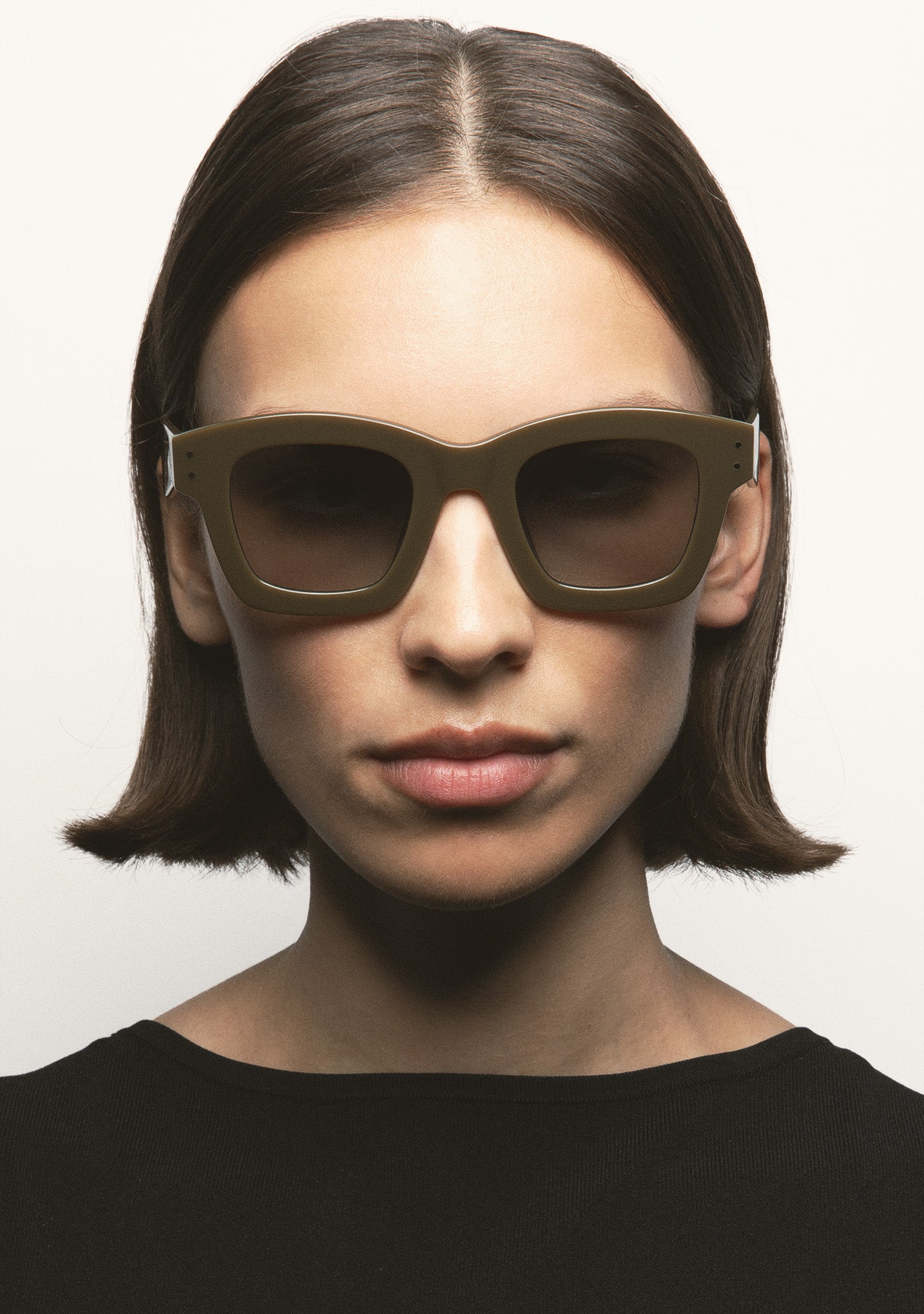 Square-shaped sunglasses. Black acetate front and temples. Gold rivet hinges on the corners and temples. Gray 2-base lens with 100% UV protection and anti-reflective treatment. Category 3 lenses. Built-in acetate nose pads. Handmade.