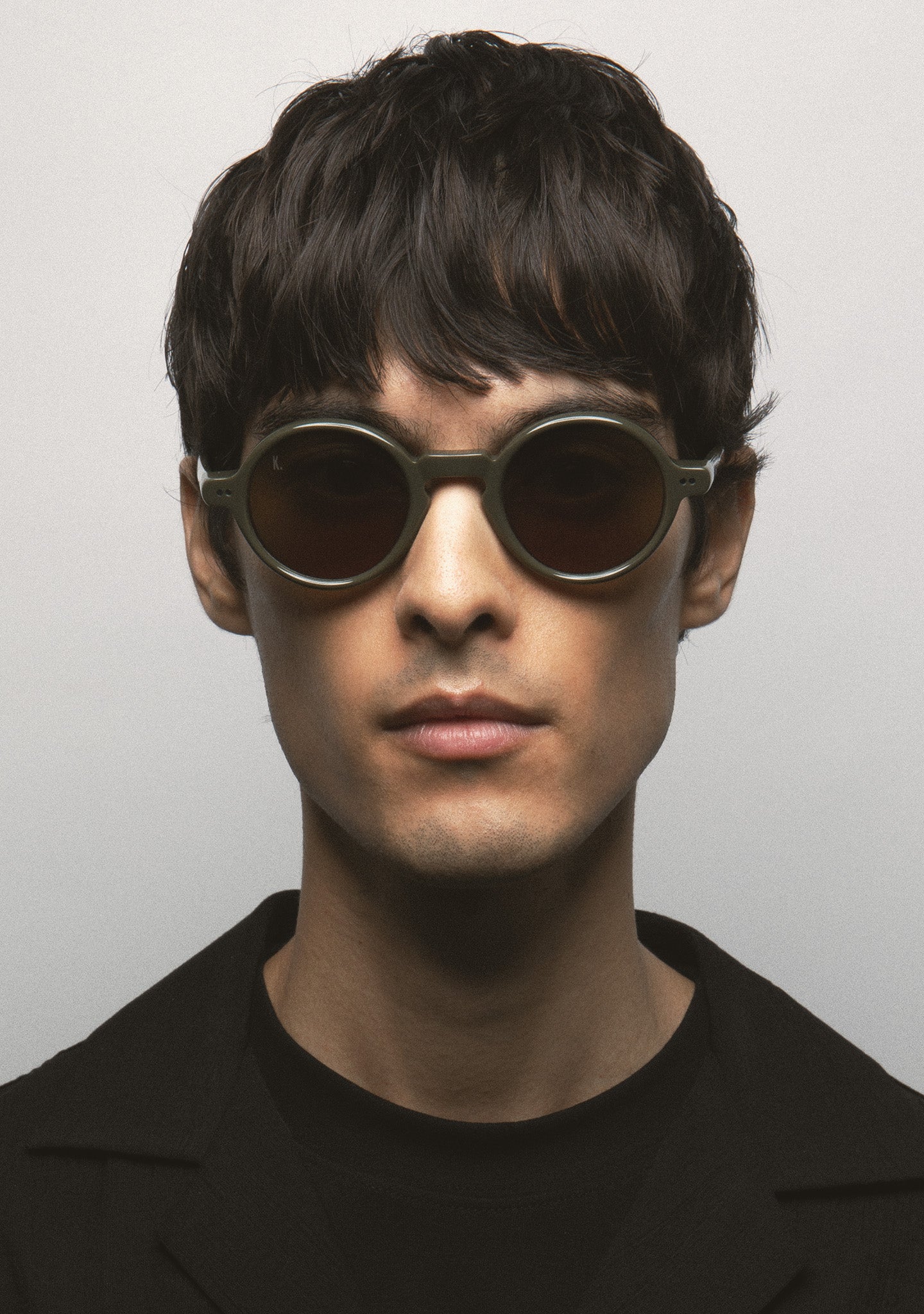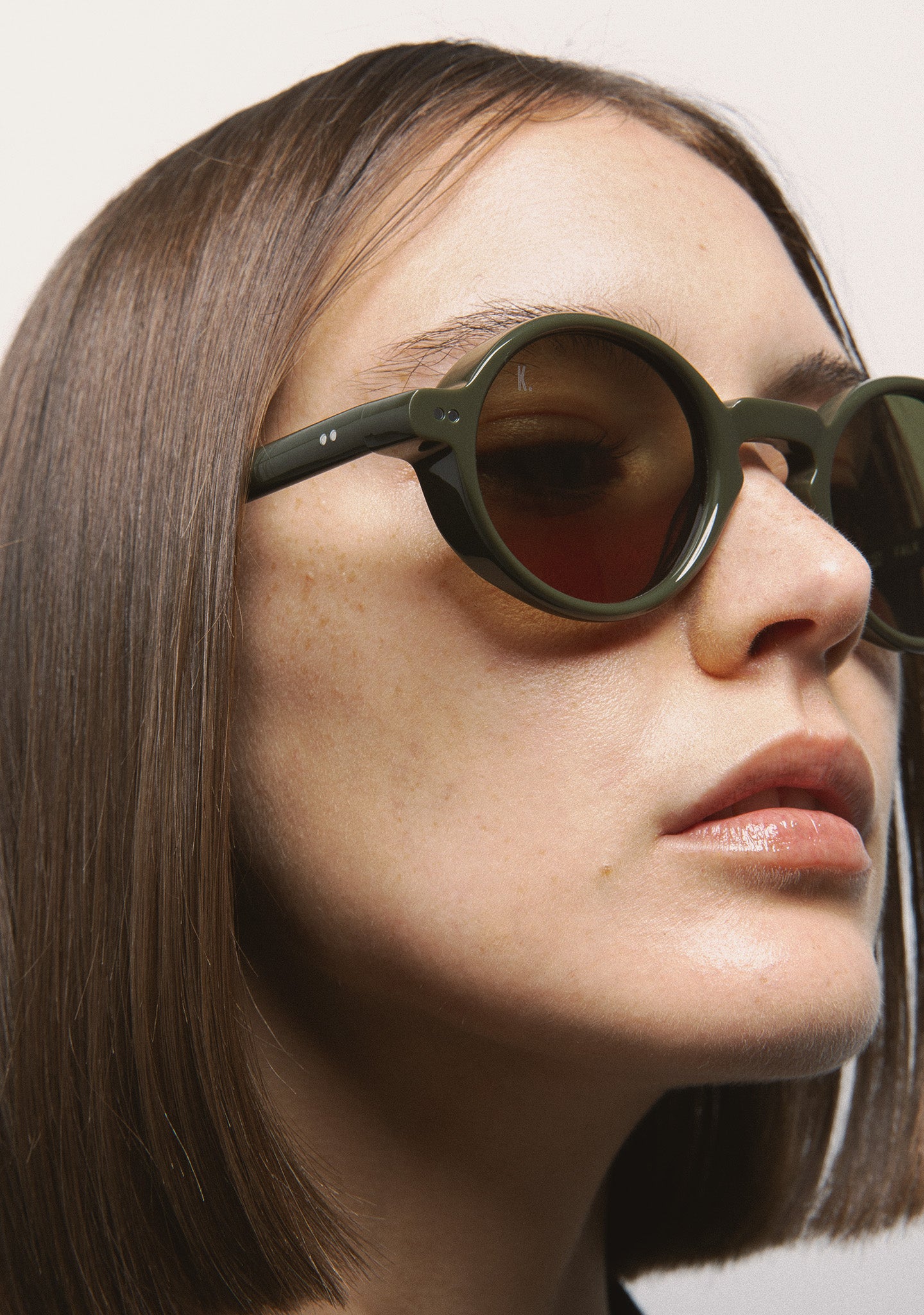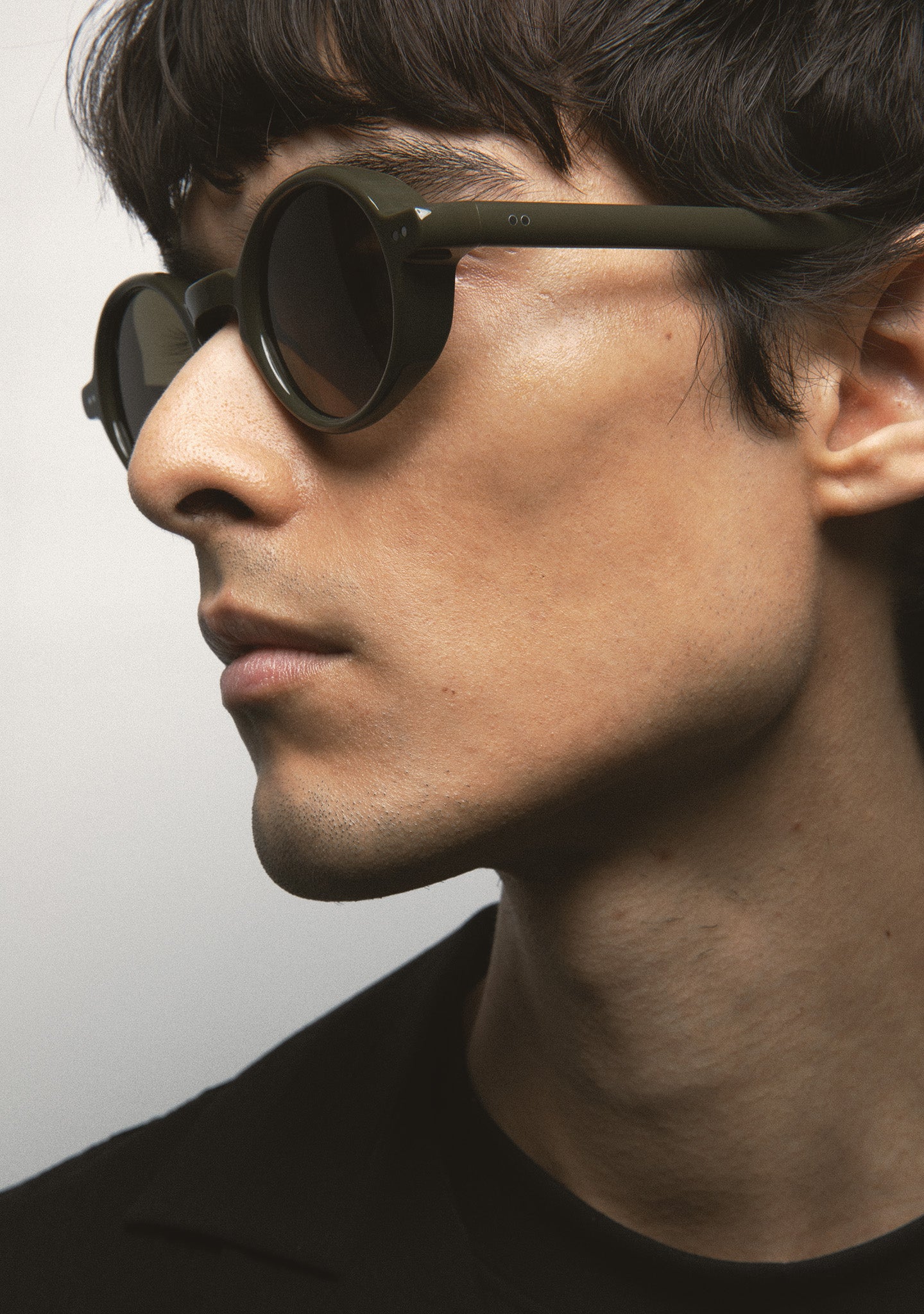 Round sunglasses with distinctive spoilers on the sides. Acetate frame front and temples in dark navy blue. Hinges with silver rivets on end elbow pieces and temples. Black gradient tint base 2 lenses with 100% UV protection and anti-reflective treatment. Category 3 lenses. Built-in acetate nose pads. Handmade.