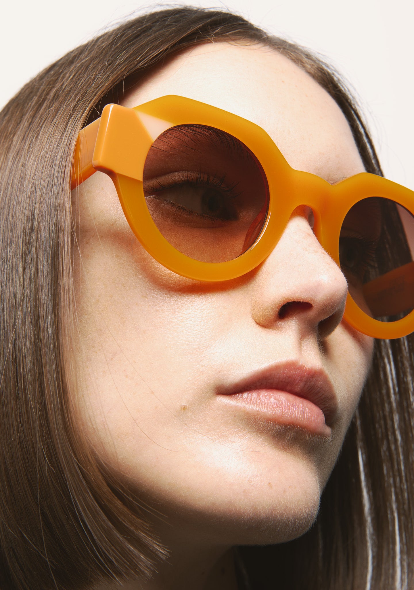 Round sunglasses with a slightly straighter upper part. Frame front in black acetate with double brown tortoiseshell and white laminate. Black acetate temples. Grey base 2 lenses with 100% UV protection and anti-reflective treatment. Category 3 lenses. Built-in acetate nose pads. Handmade.