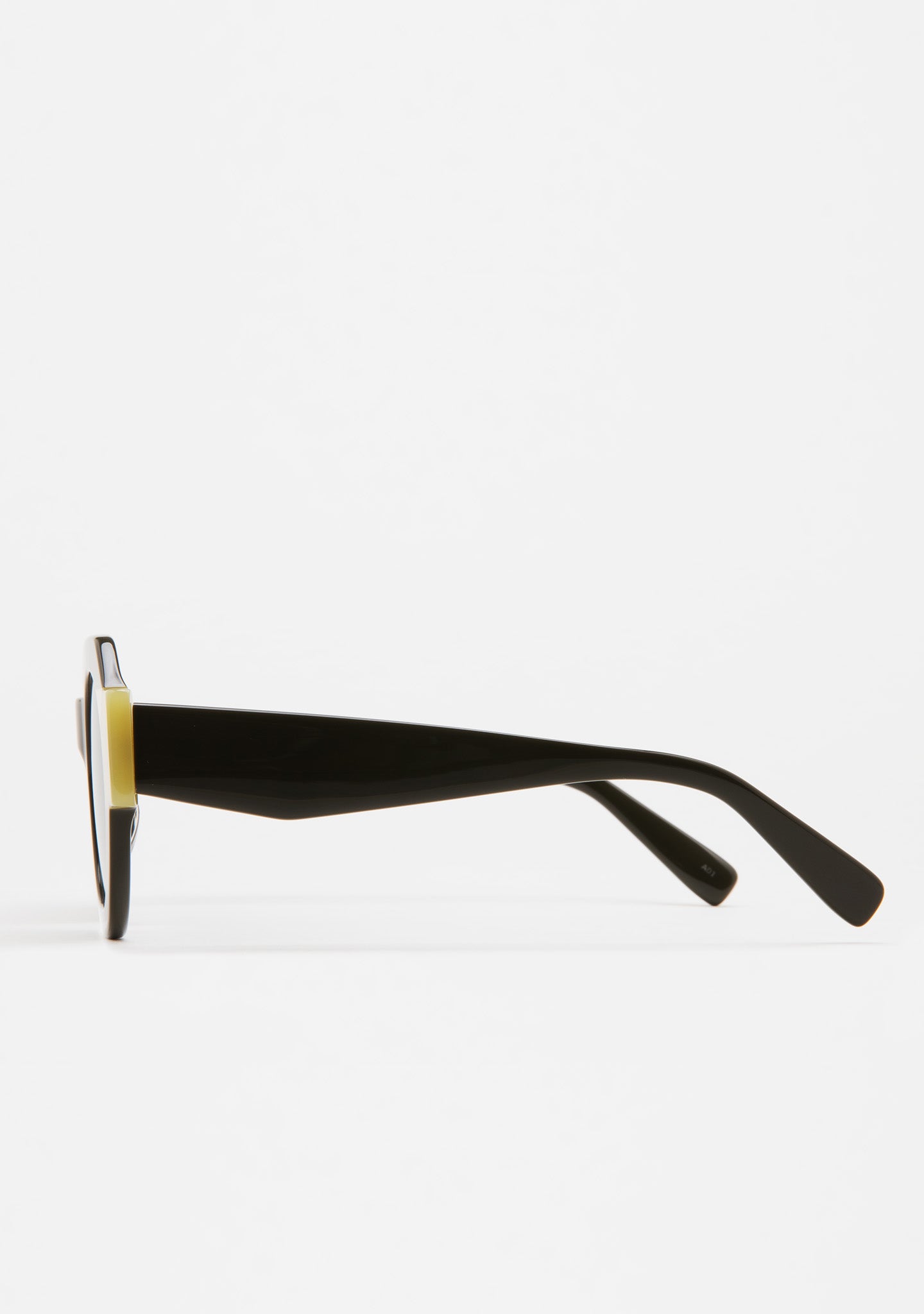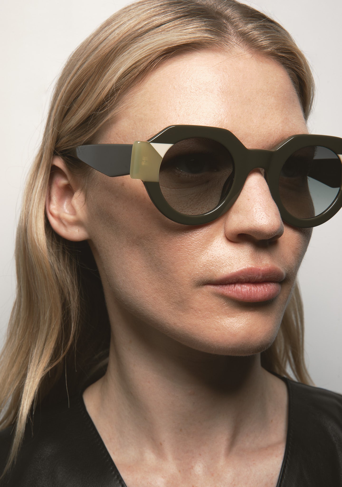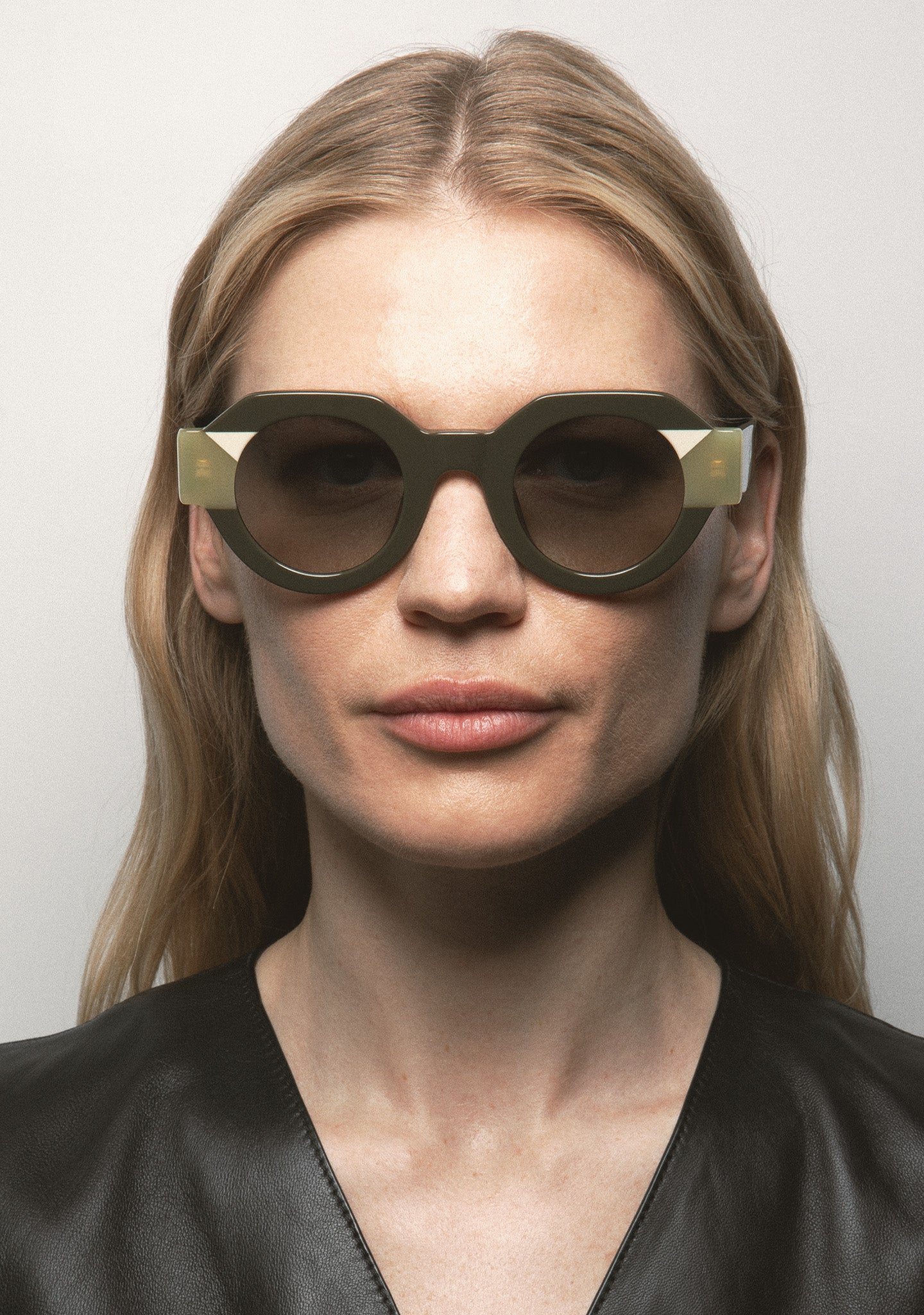 Round sunglasses with a slightly straighter upper part. Frame front in black acetate with double brown tortoiseshell and white laminate. Black acetate temples. Grey base 2 lenses with 100% UV protection and anti-reflective treatment. Category 3 lenses. Built-in acetate nose pads. Handmade.