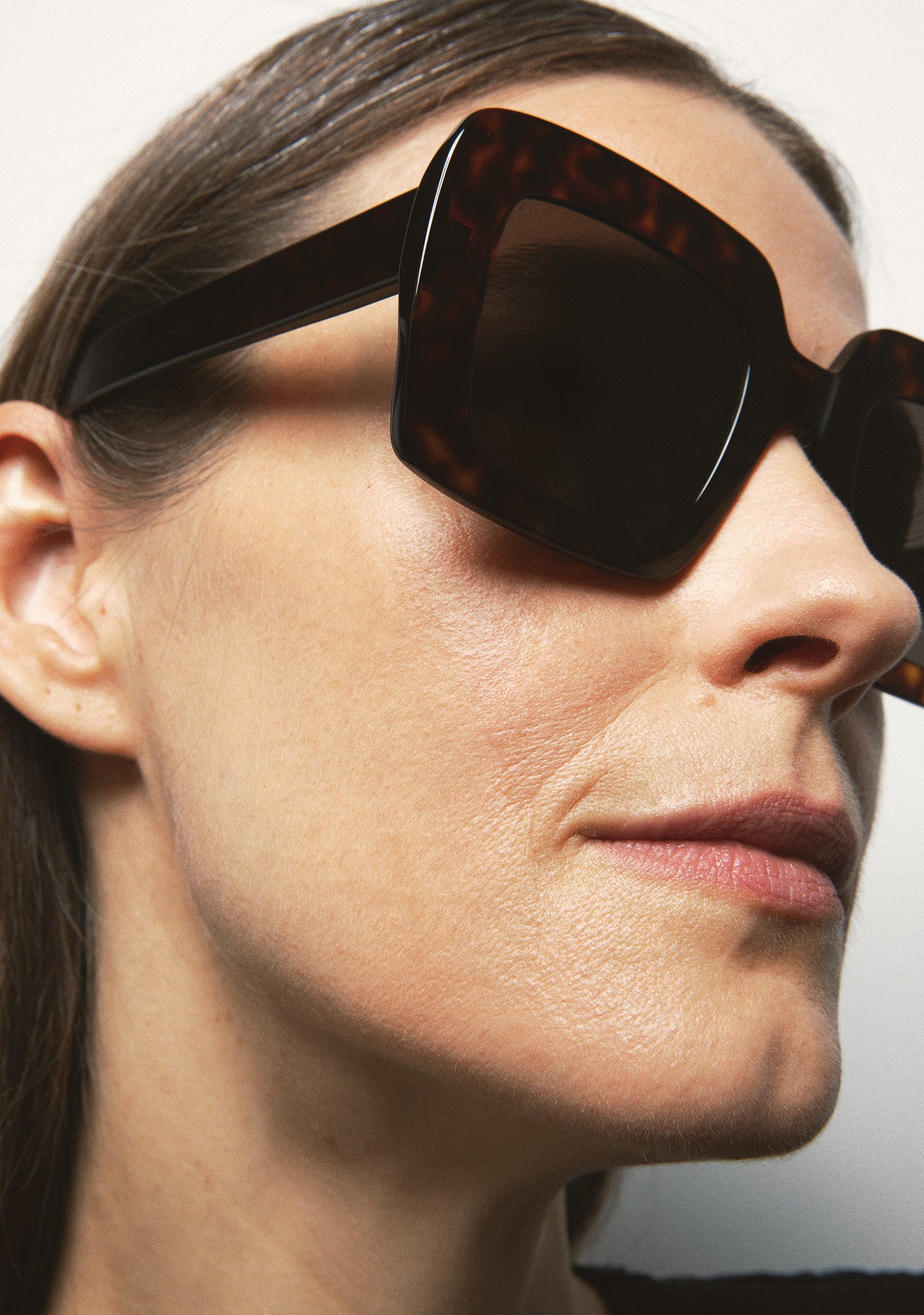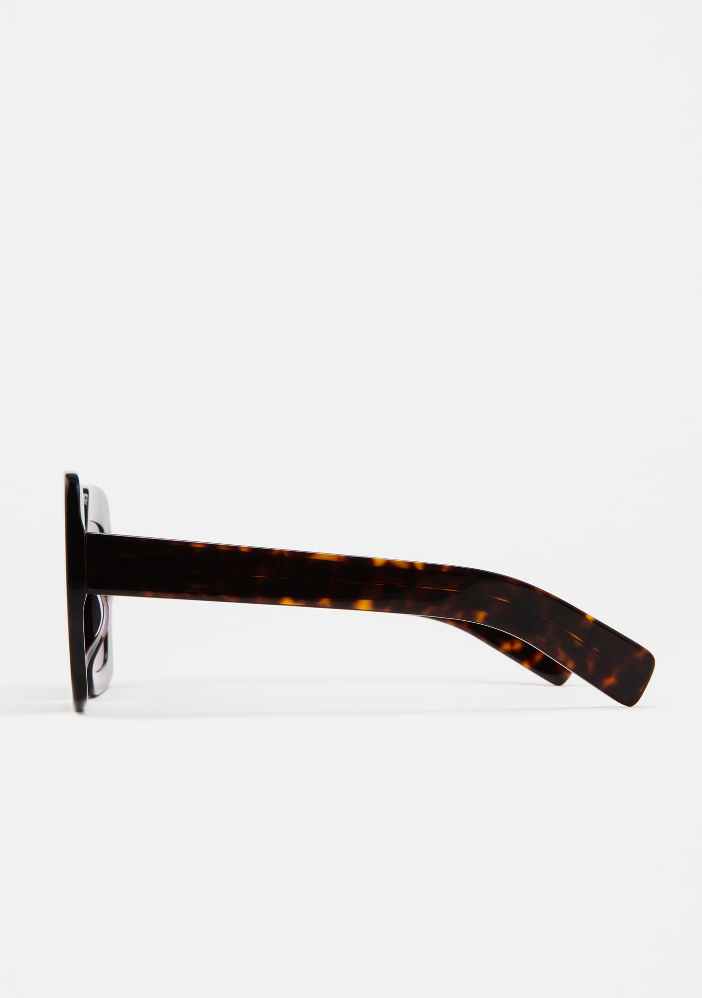 Oversized square sunglasses. Acetate frame front and temples in dark brown tortoiseshell. Dark grey base 2 lenses with 100% UV protection and anti-reflective treatment. Category 3 lenses. Built-in acetate nose pads. Handmade.