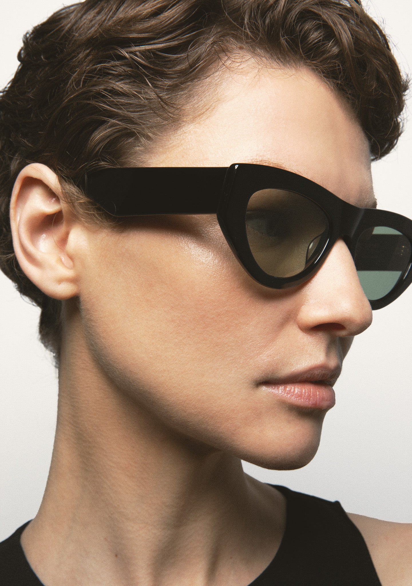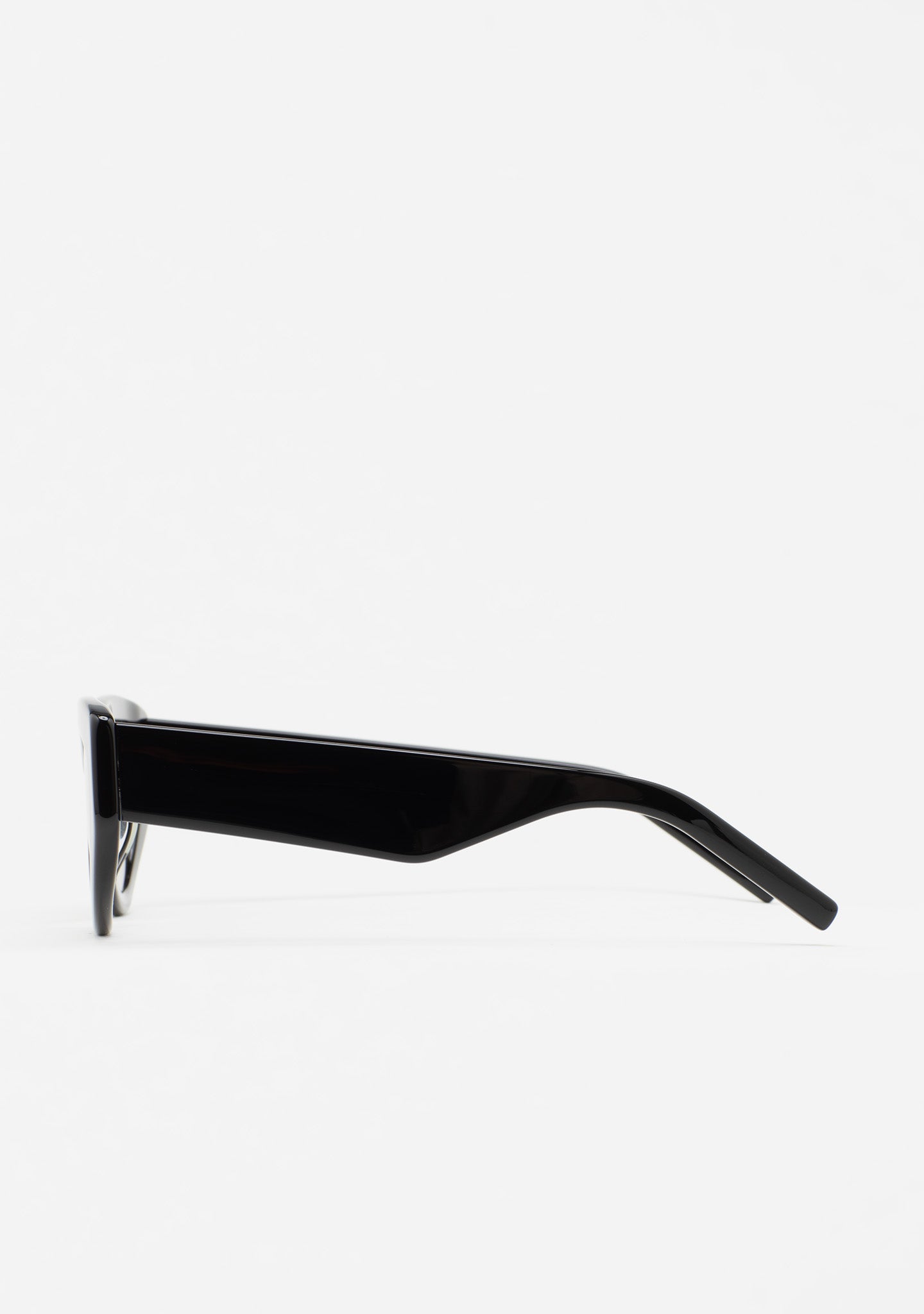 Cat-eye-shaped sunglasses. Black acetate front and temples. Curved temple-end. Green photochromic lens, base 2, with UV protection and anti-reflective treatment. Category 1-3 lens. Integrated acetate nose pads. Handmade.