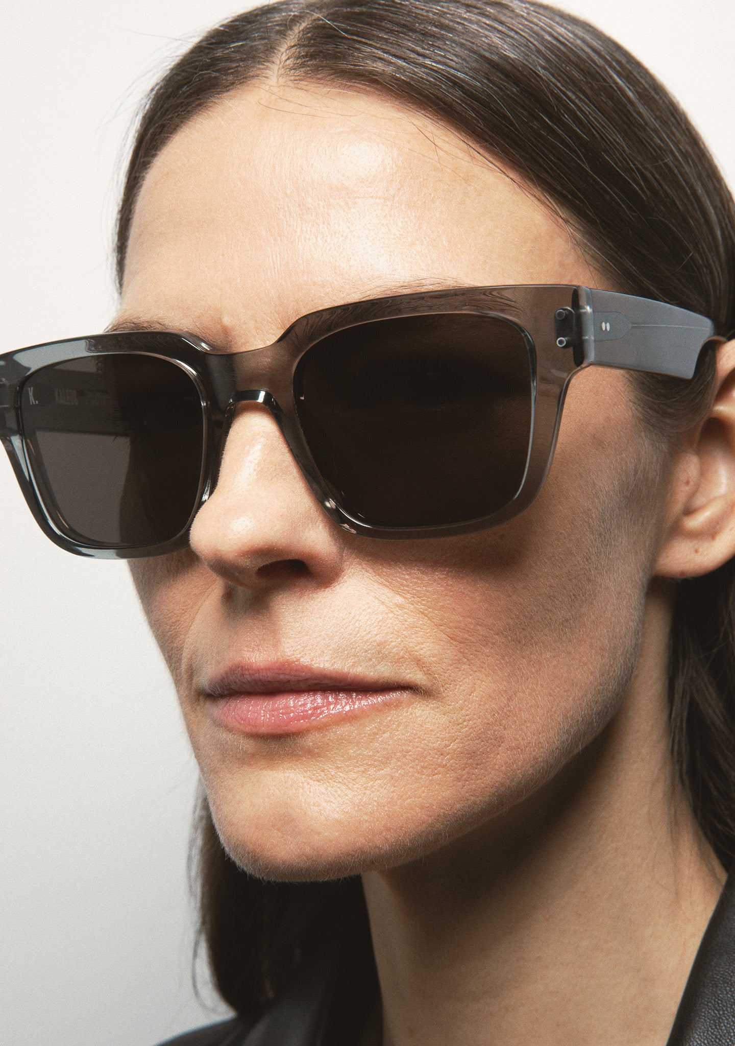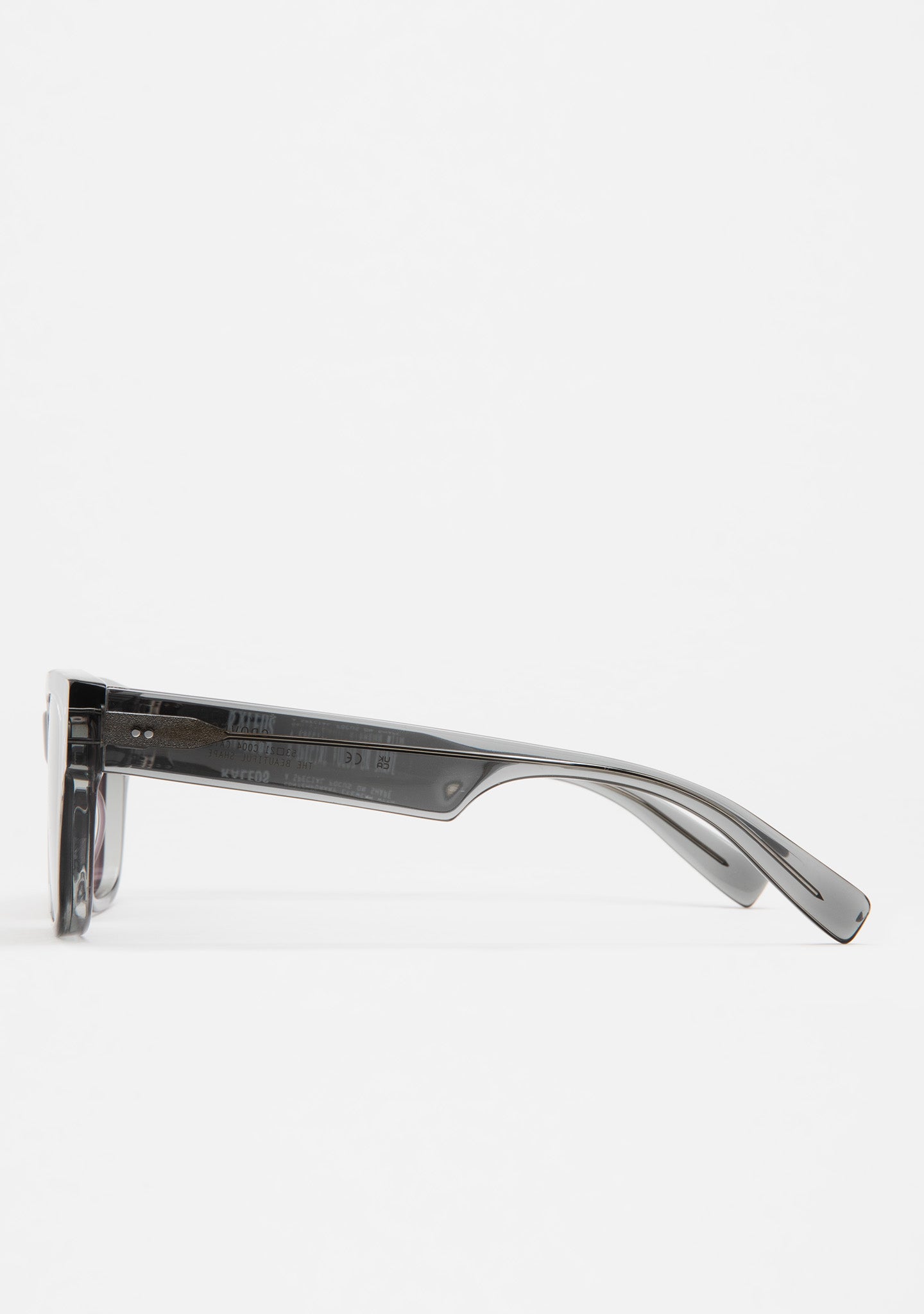 Square sunglasses. Thick acetate frame front in transparent dark green. Acetate temples in transparent dark green. Hinges with silver rivets on end elbow pieces and temples. Green gradient 2-base lenses. Category 2 lenses. Built-in acetate nose pads. Handmade.