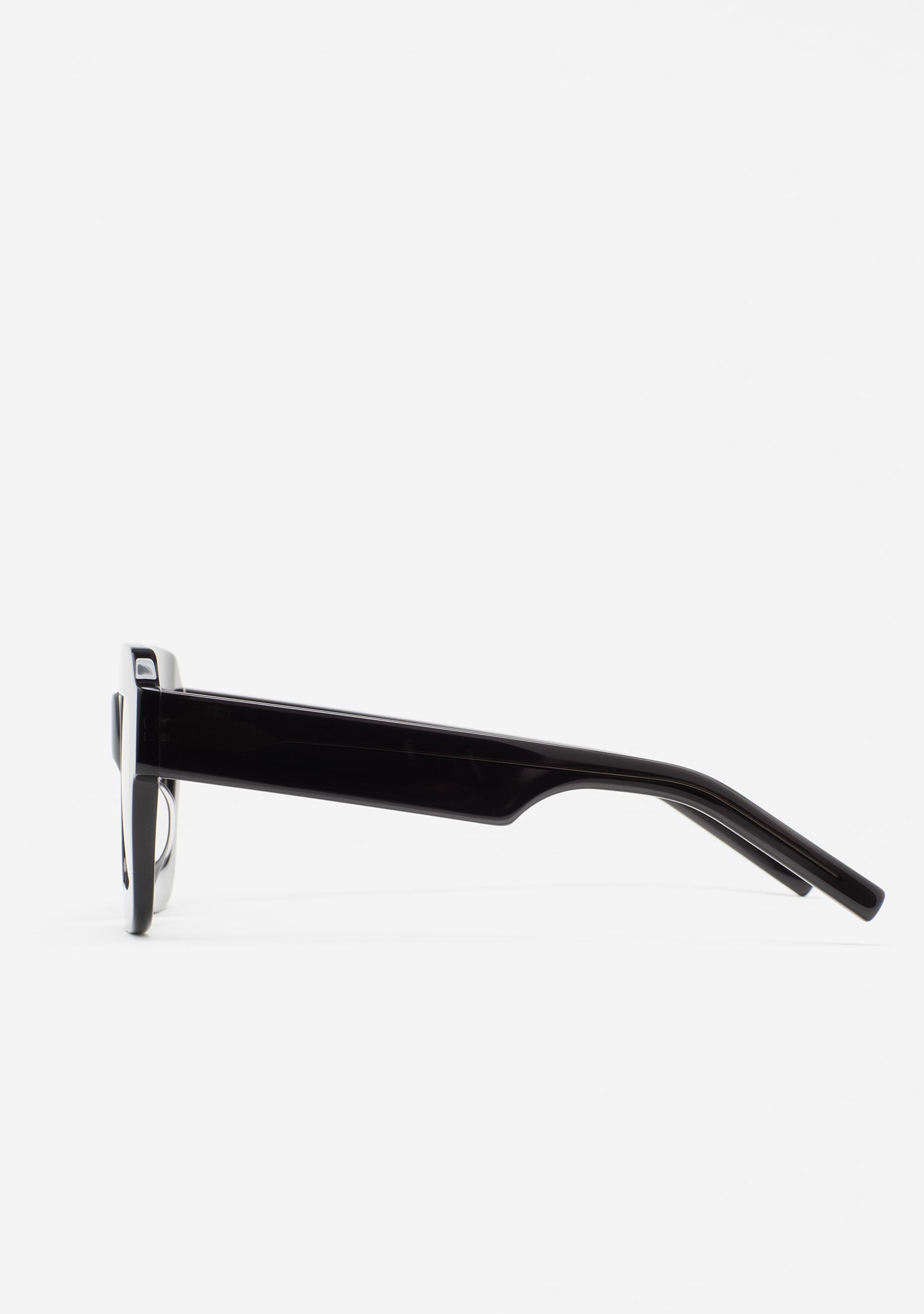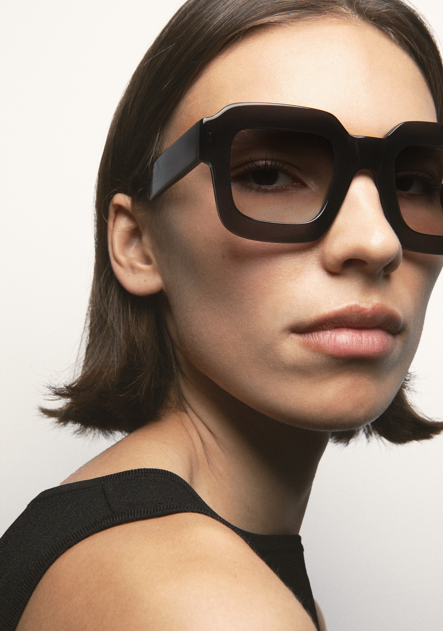 Square-shaped sunglasses. Front and temples of transparent dark gray acetate. Photocromic gray lens, base 2, with UV protection and anti-reflective coating. Lens Category 1-3. Acetate nose pads incorporated. Handmade.