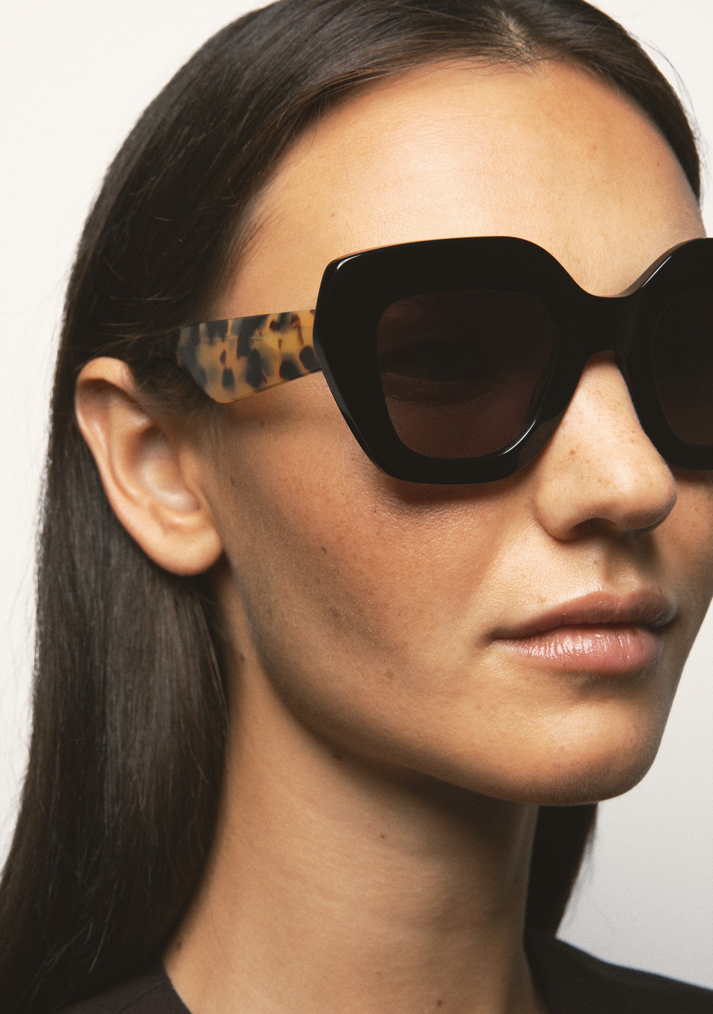Butterfly-shaped sunglasses. Front made of black acetate and havana brown acetate temples. Grey gradient lens category 3 with base 2, 100% UV protection, and anti-reflective treatment. Integrated acetate nose pads. Handmade.