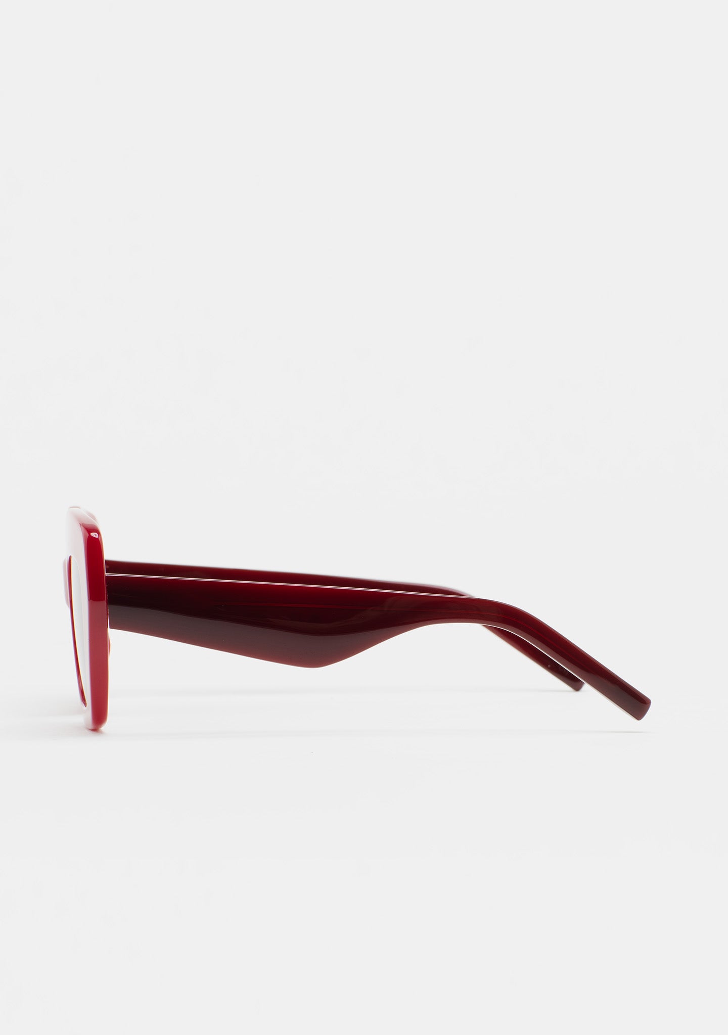 Butterfly-shaped sunglasses. Front made of black acetate and havana brown acetate temples. Grey gradient lens category 3 with base 2, 100% UV protection, and anti-reflective treatment. Integrated acetate nose pads. Handmade.