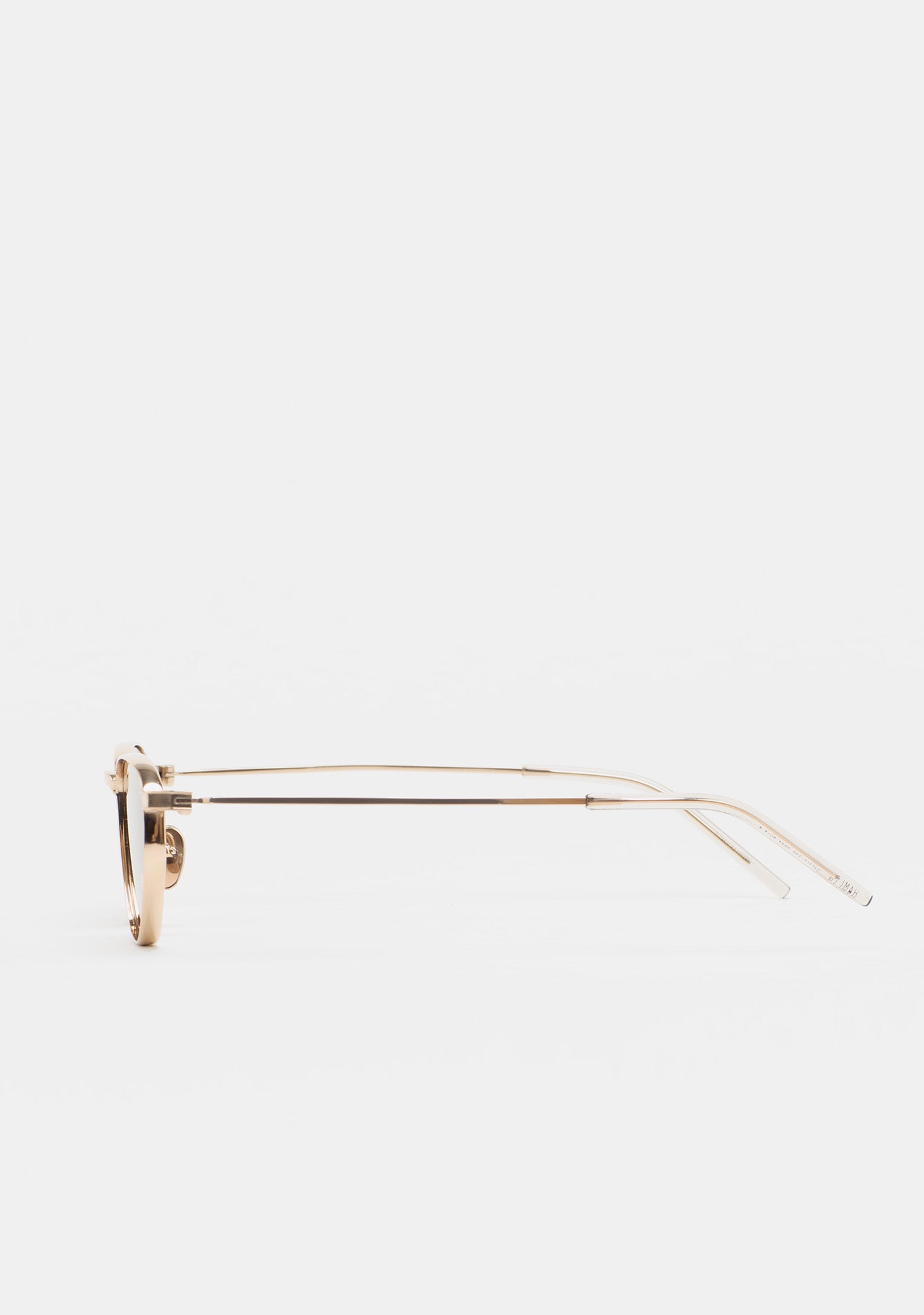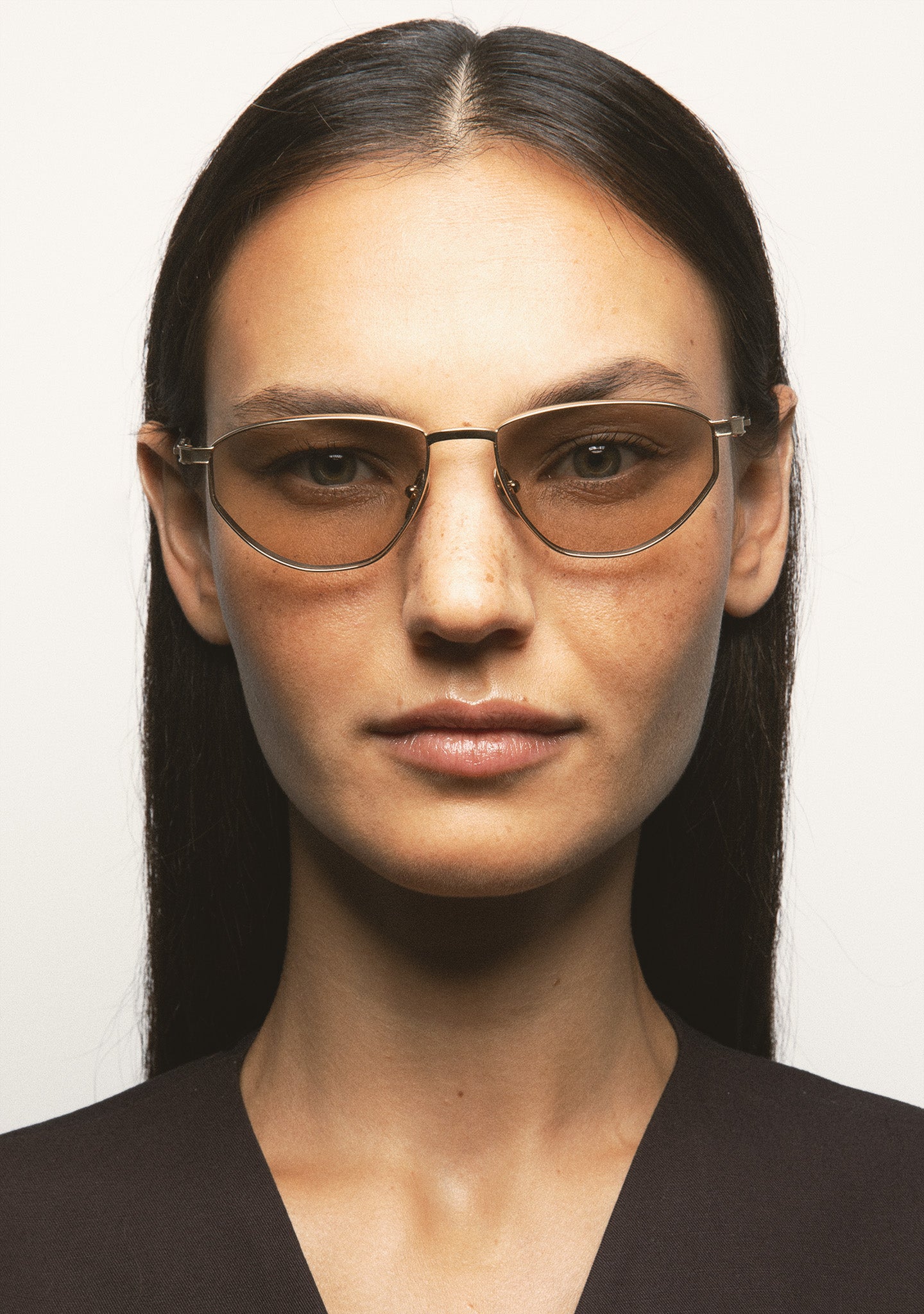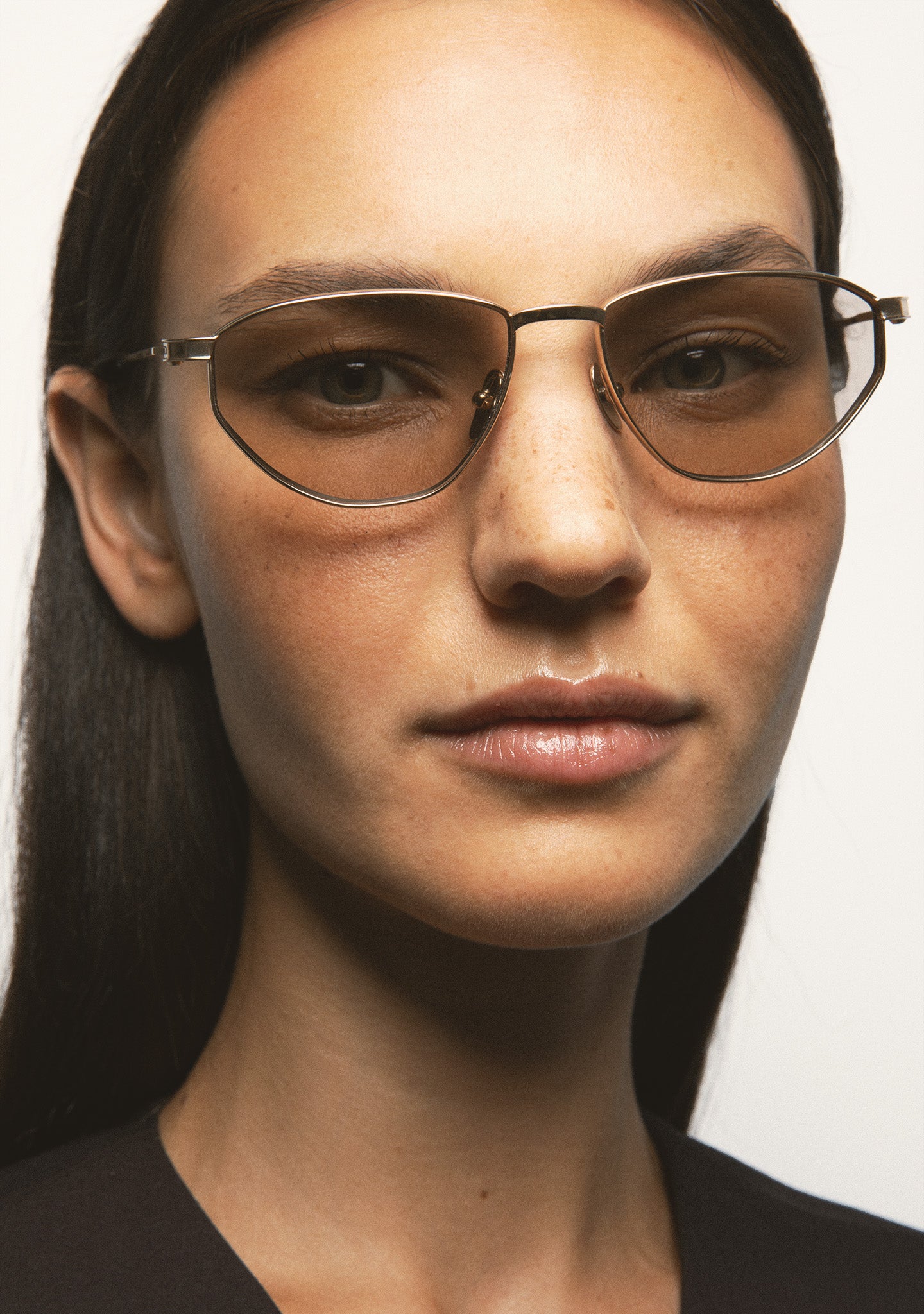Cat-eye shaped sunglasses. Front and temples made of brown titanium. Temples with transparent crystal acetate tips. Grey lens, category 2, with 100% UV protection and anti-reflective coating. Category 3 lens. Integrated nose pads. Handmade.
