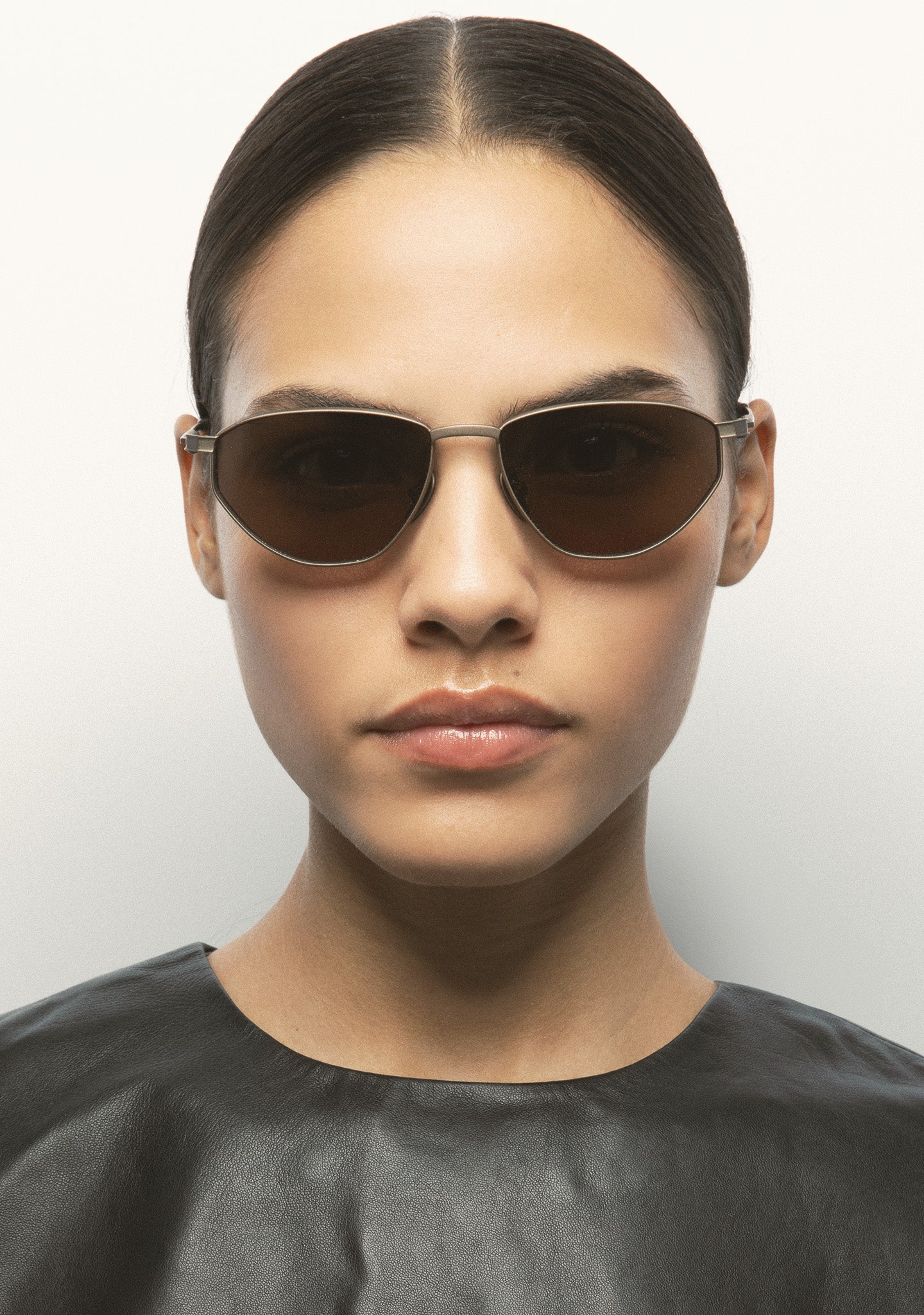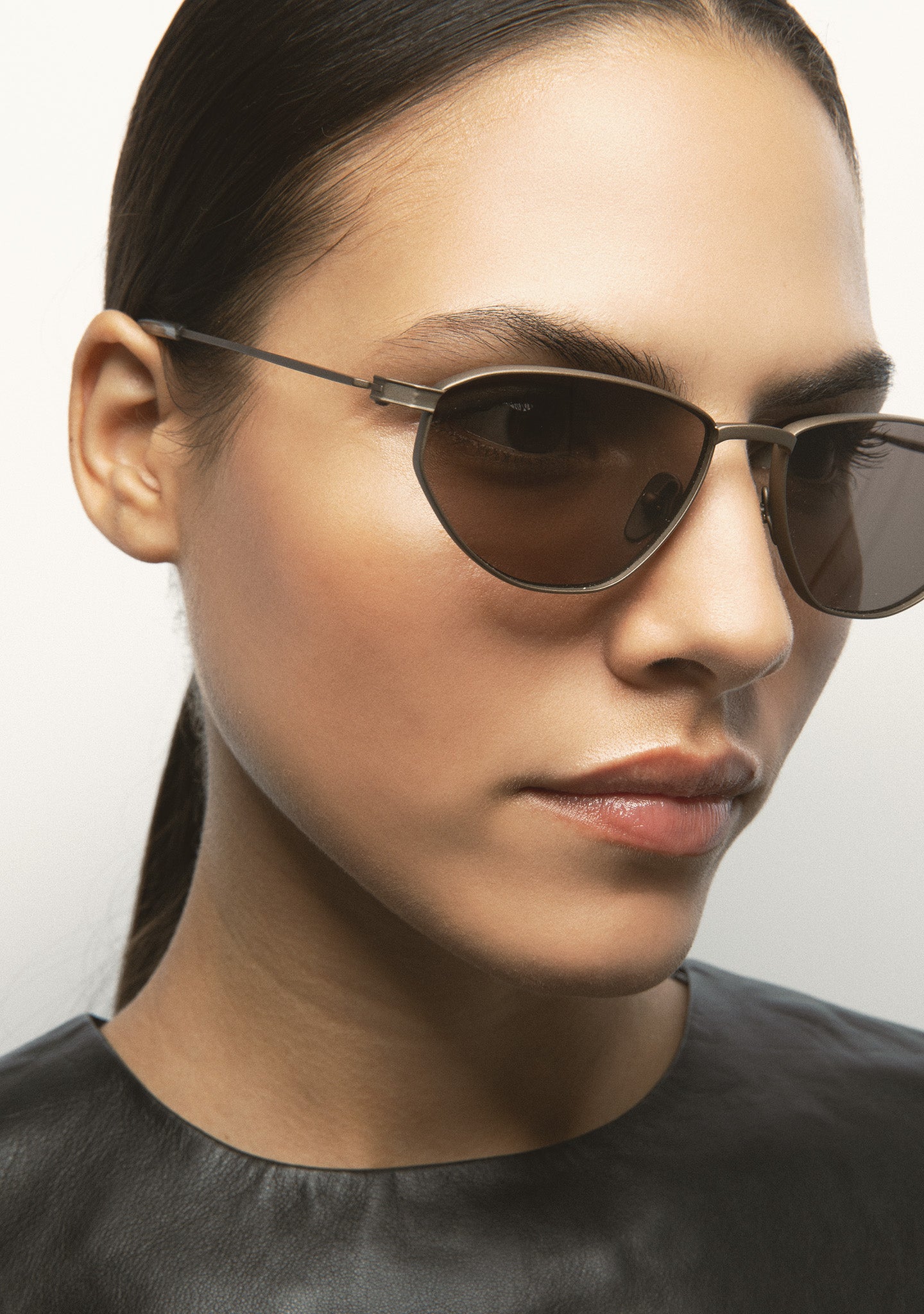 Cat-eye shaped sunglasses. Front and temples made of brown titanium. Temples with transparent crystal acetate tips. Grey lens, category 2, with 100% UV protection and anti-reflective coating. Category 3 lens. Integrated nose pads. Handmade.