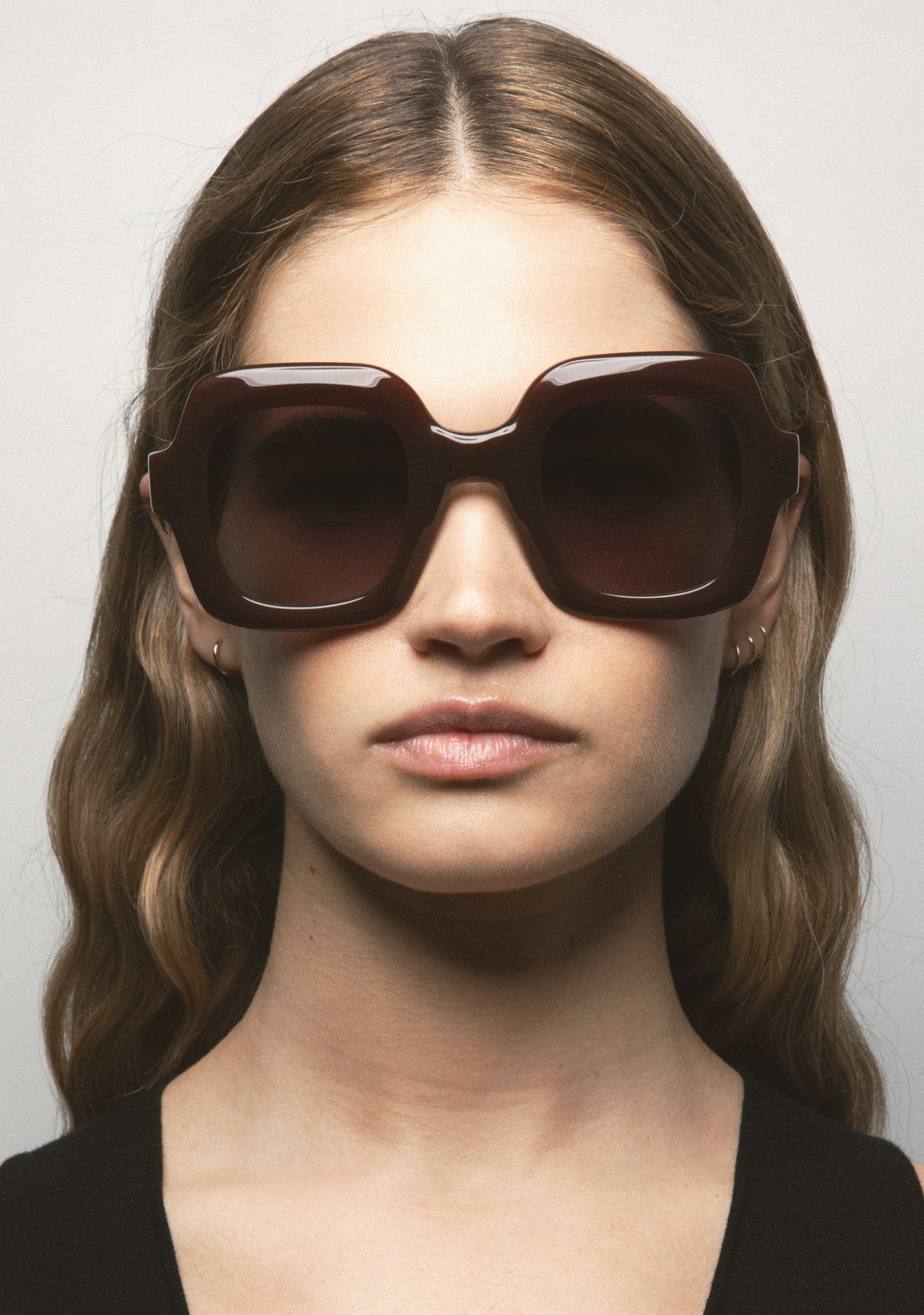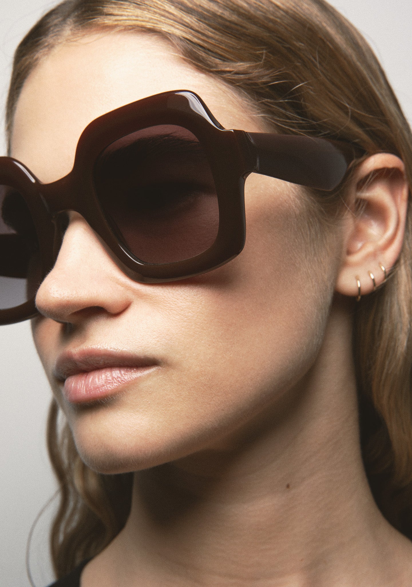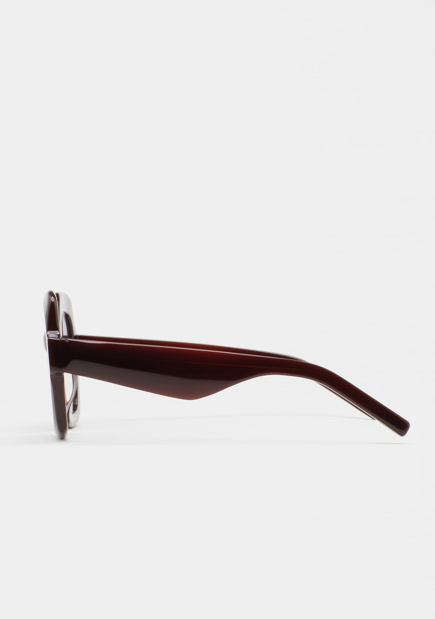 Square-shaped sunglasses. Transparent pink acetate front and temples. Gradient brown lens, base 2, with 100% UV protection and anti-reflective treatment. Category 3 lens. Integrated acetate nose pads. Handmade.
