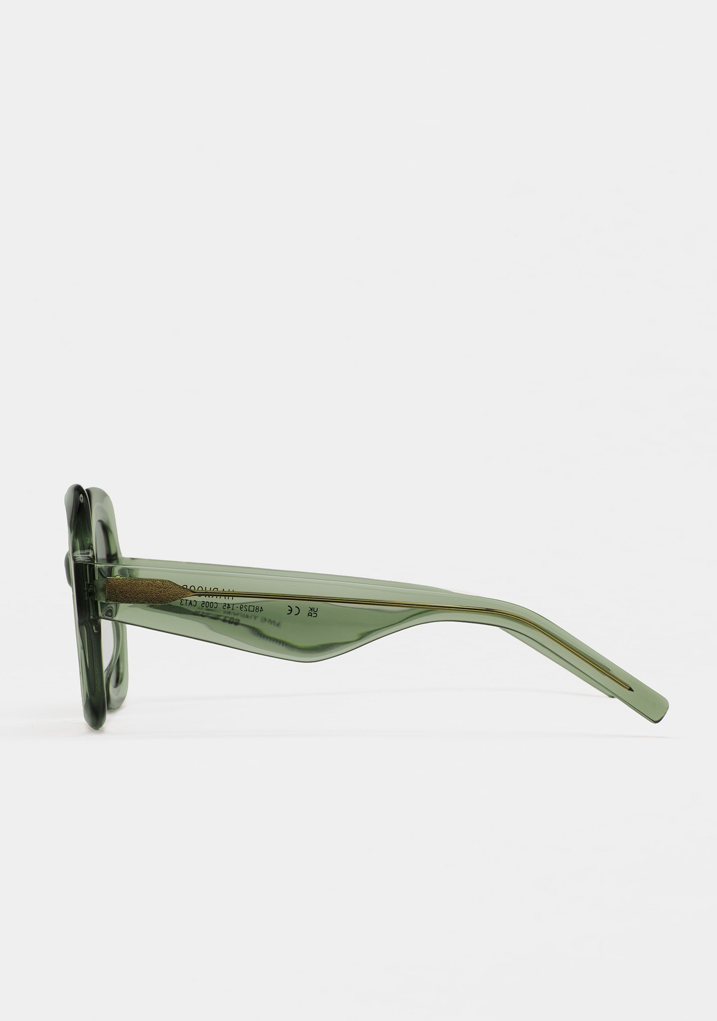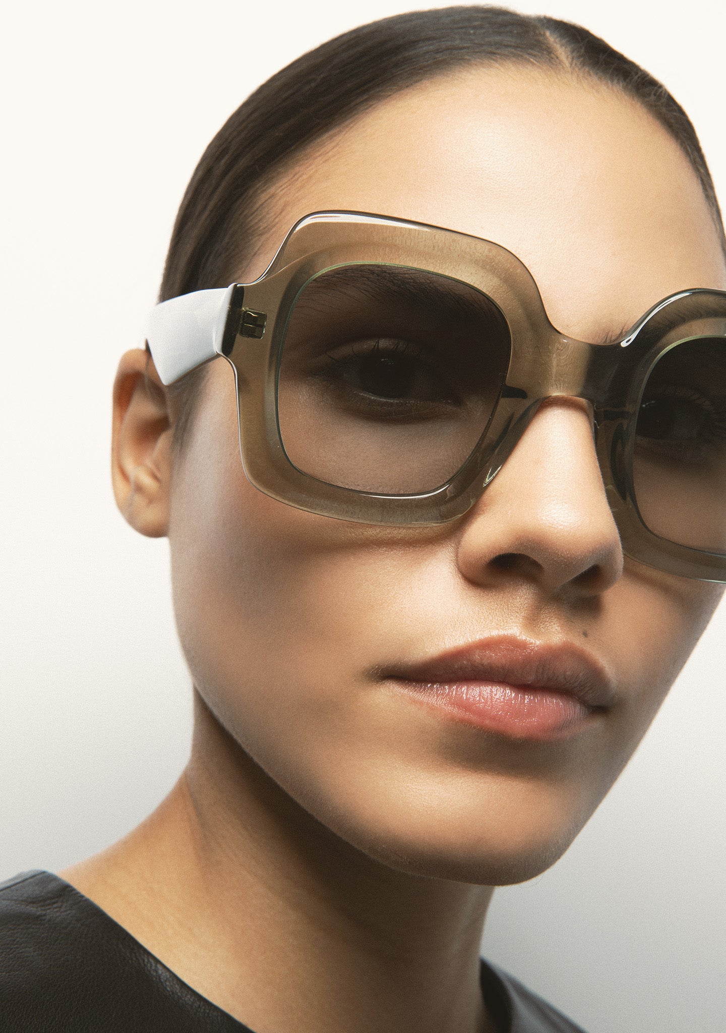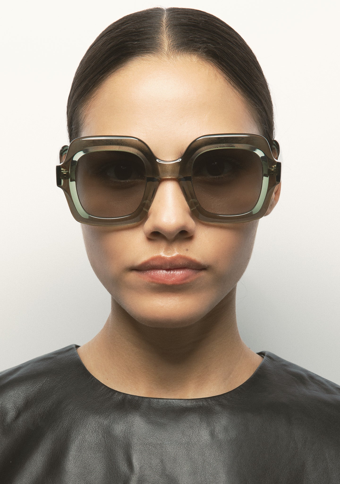Square-shaped sunglasses. Transparent pink acetate front and temples. Gradient brown lens, base 2, with 100% UV protection and anti-reflective treatment. Category 3 lens. Integrated acetate nose pads. Handmade.