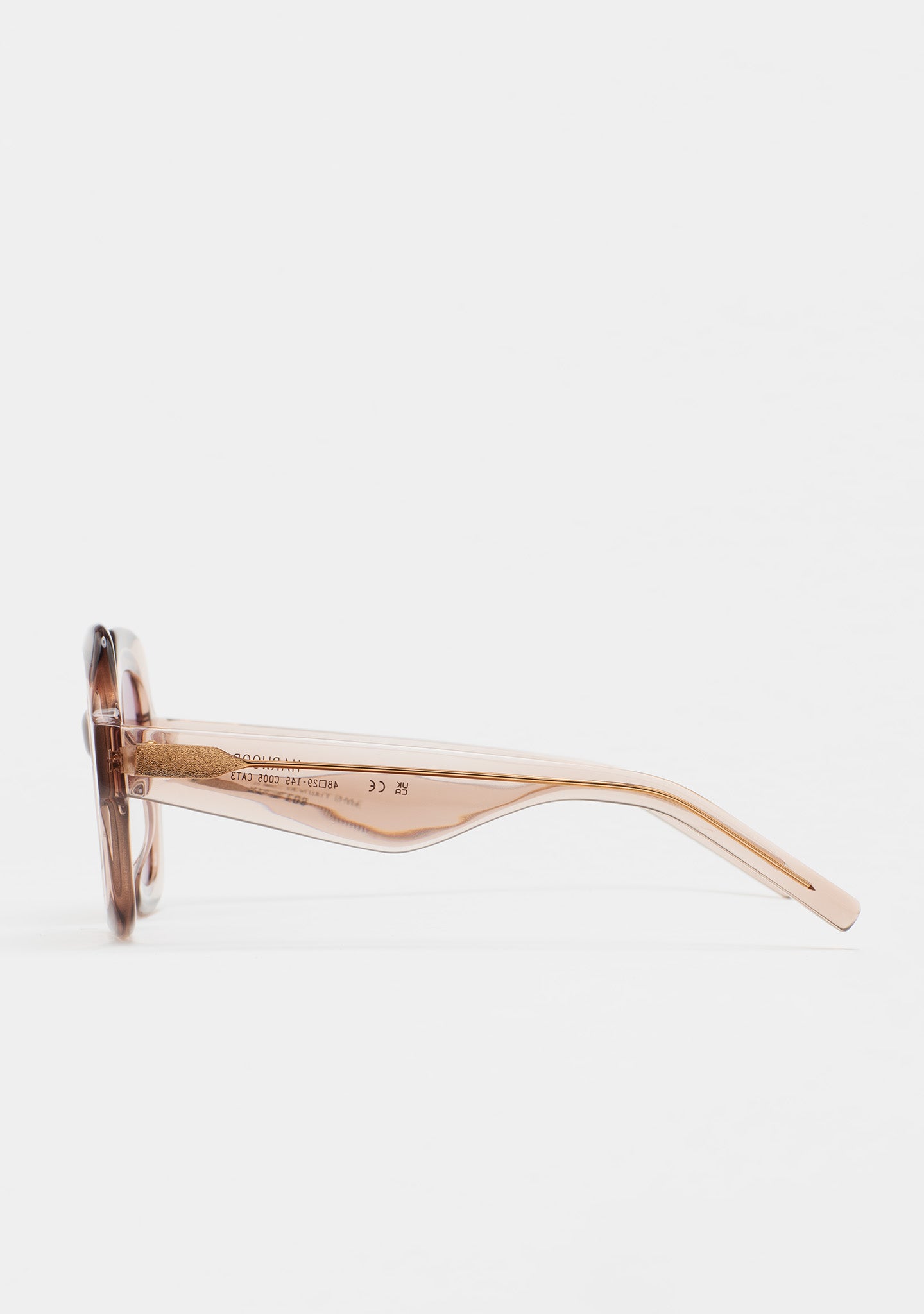 Square-shaped sunglasses. Transparent pink acetate front and temples. Gradient brown lens, base 2, with 100% UV protection and anti-reflective treatment. Category 3 lens. Integrated acetate nose pads. Handmade.