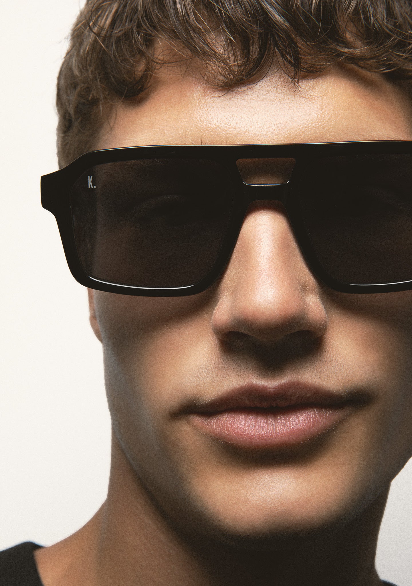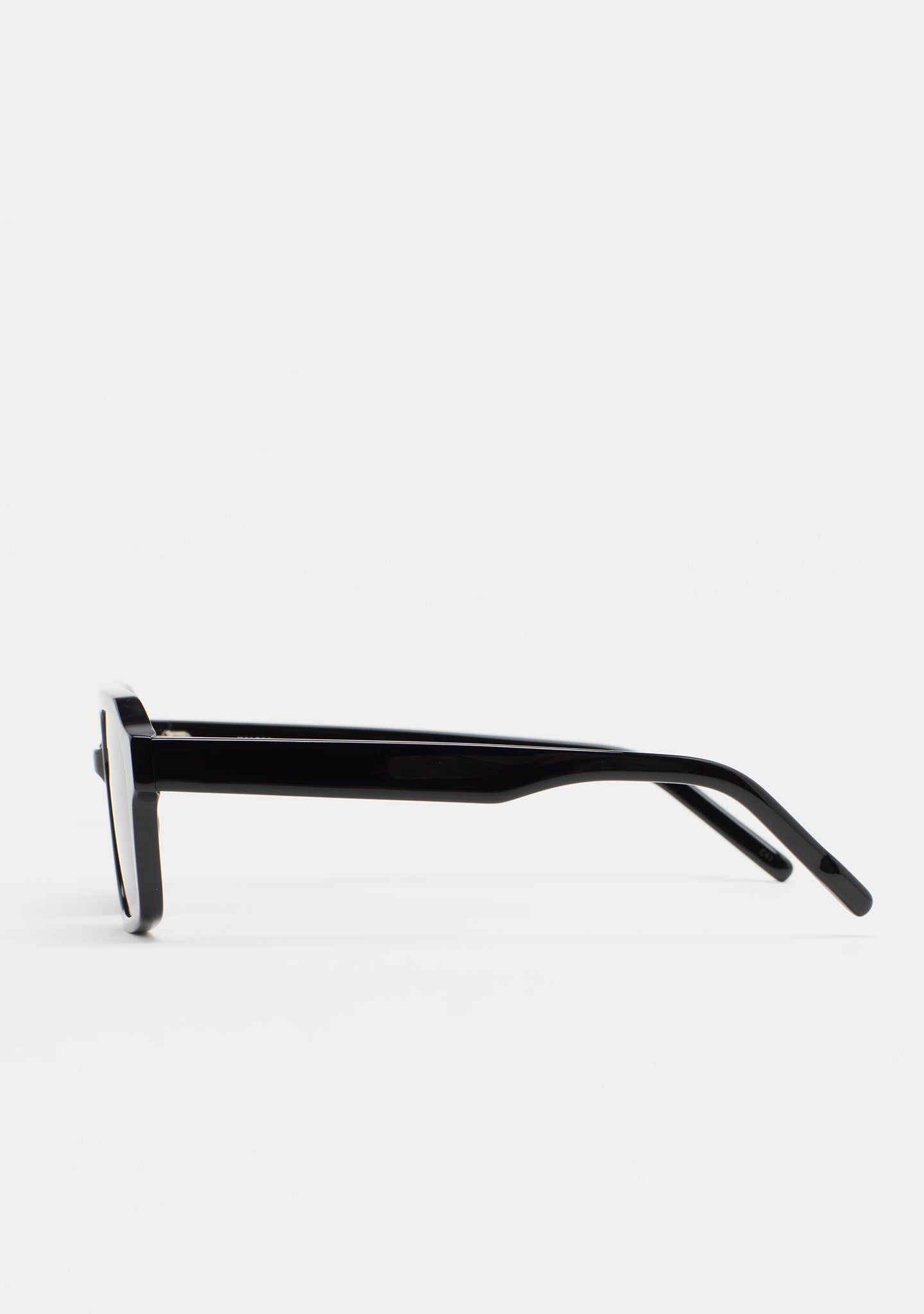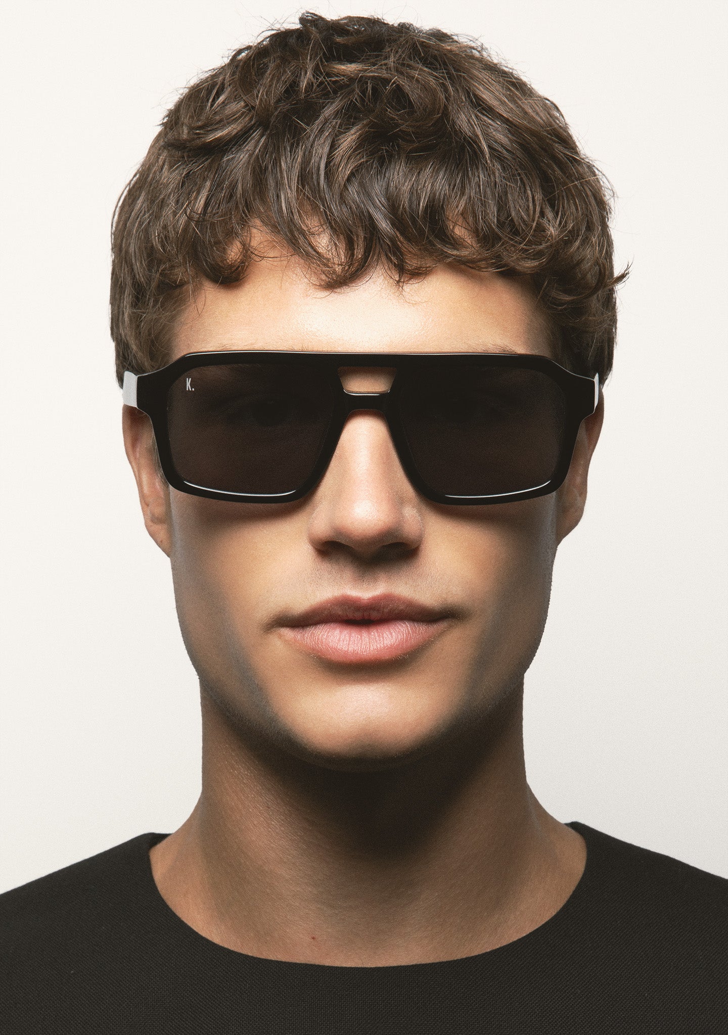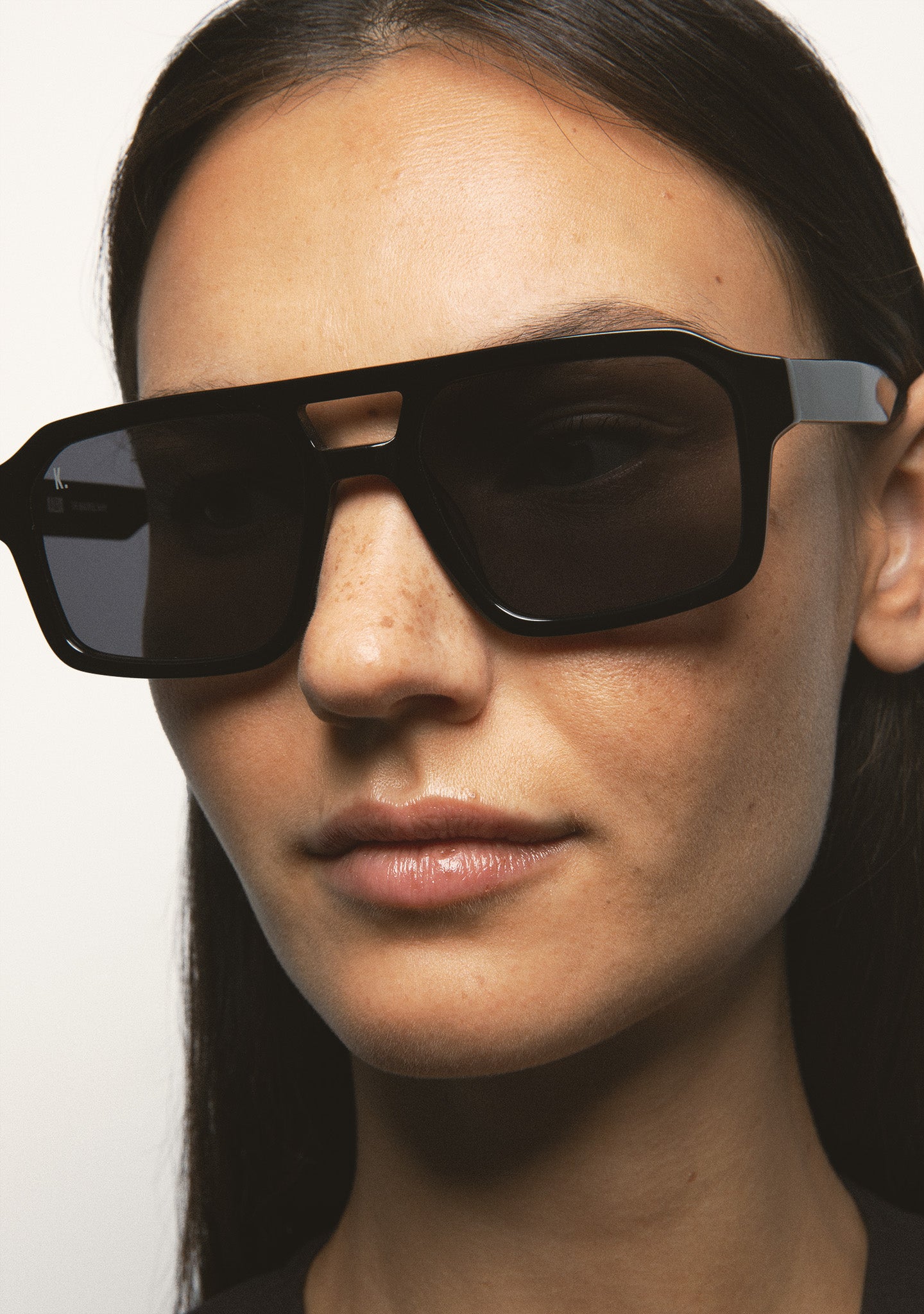 Rectangular Sunglasses with Double Bridge. Transparent gray acetate front and temples. Brown photochromic lenses, base 2, with UV protection and anti-reflective coating. Category 1 3 lenses. Integrated acetate nose pads. Handmade.