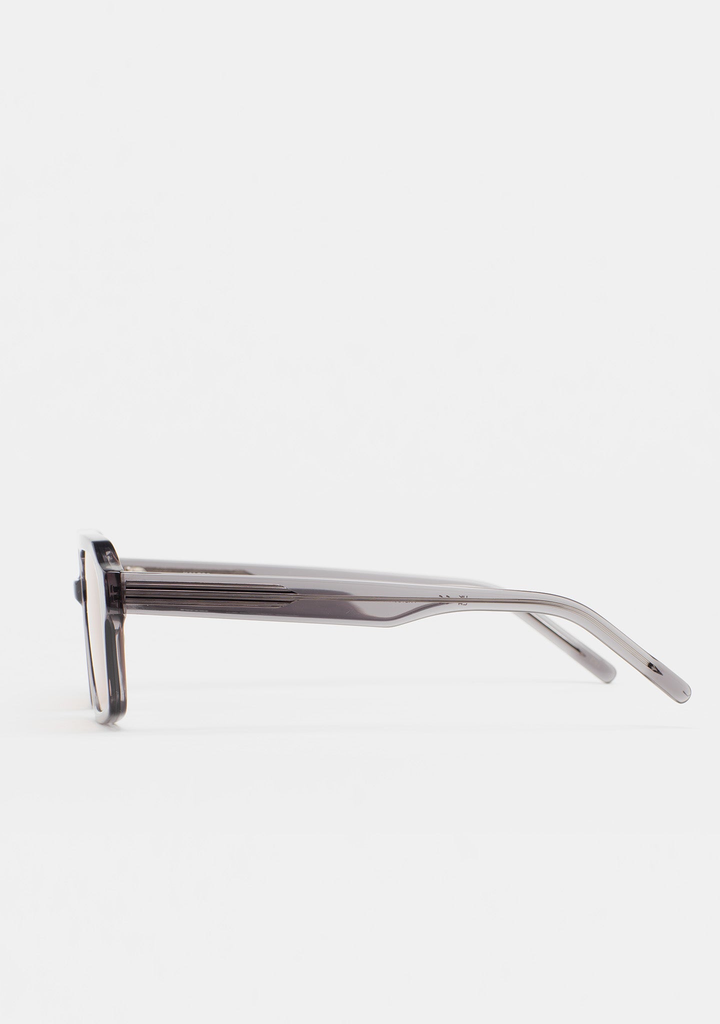 Rectangular Sunglasses with Double Bridge. Transparent gray acetate front and temples. Brown photochromic lenses, base 2, with UV protection and anti-reflective coating. Category 1 3 lenses. Integrated acetate nose pads. Handmade.