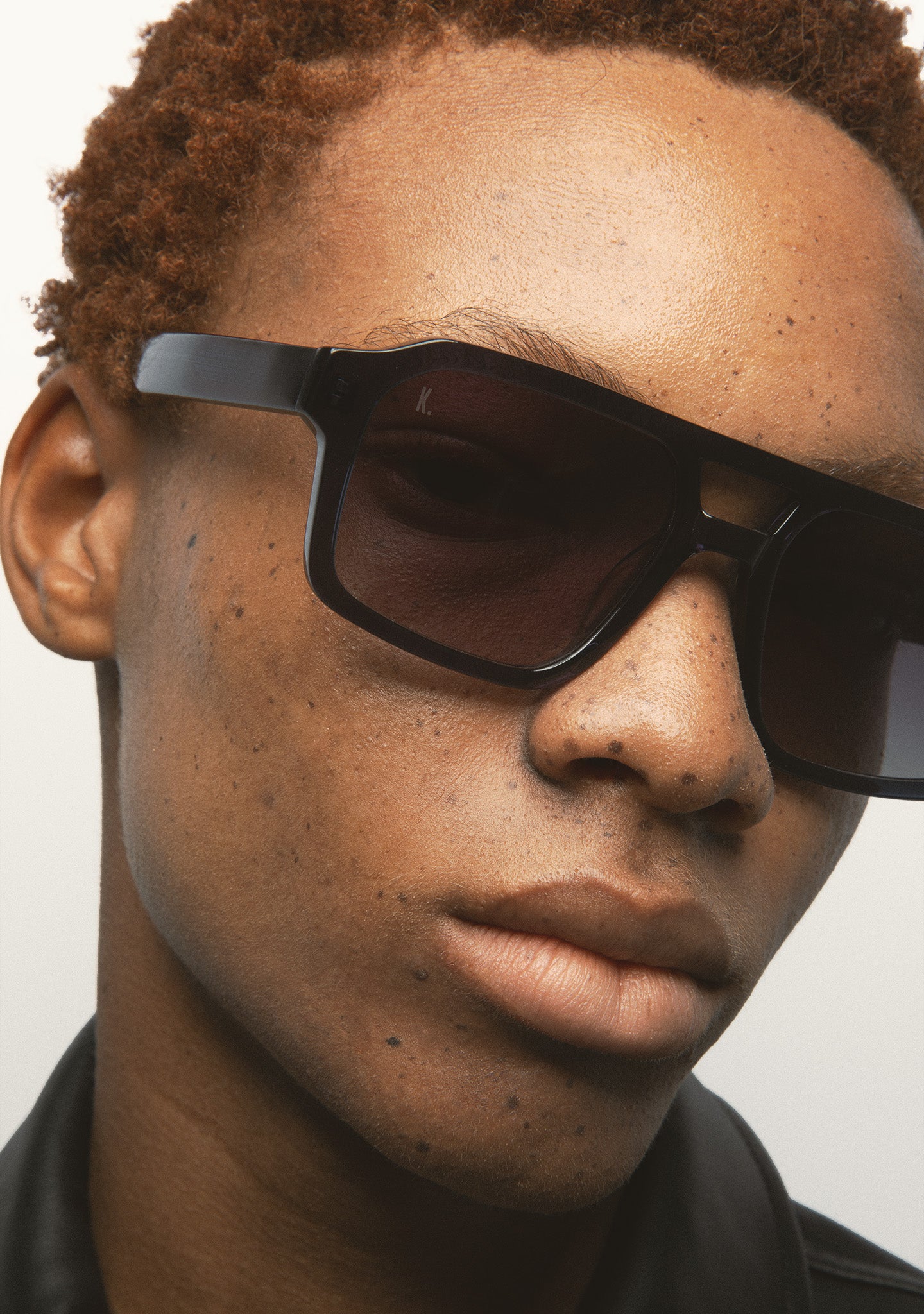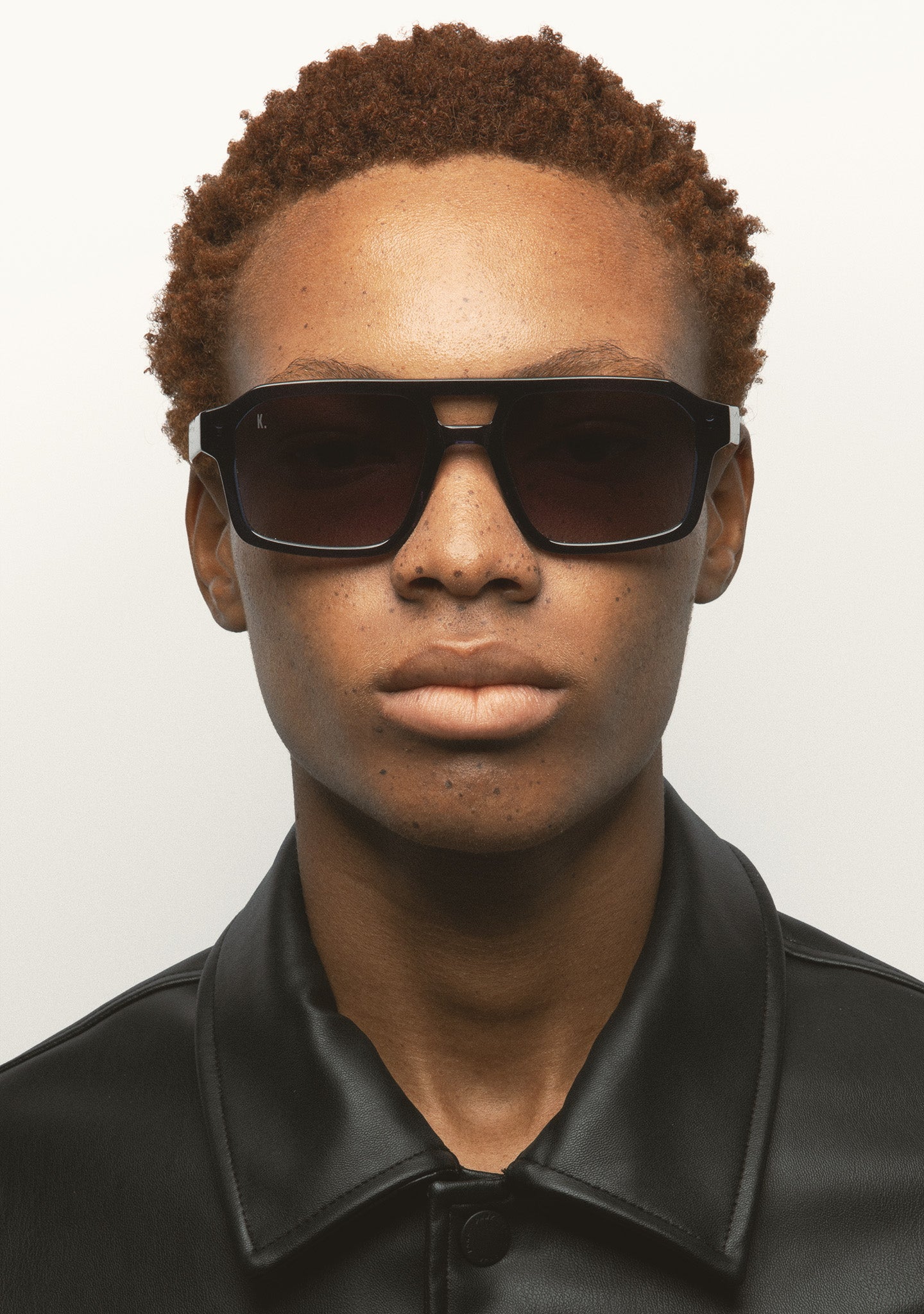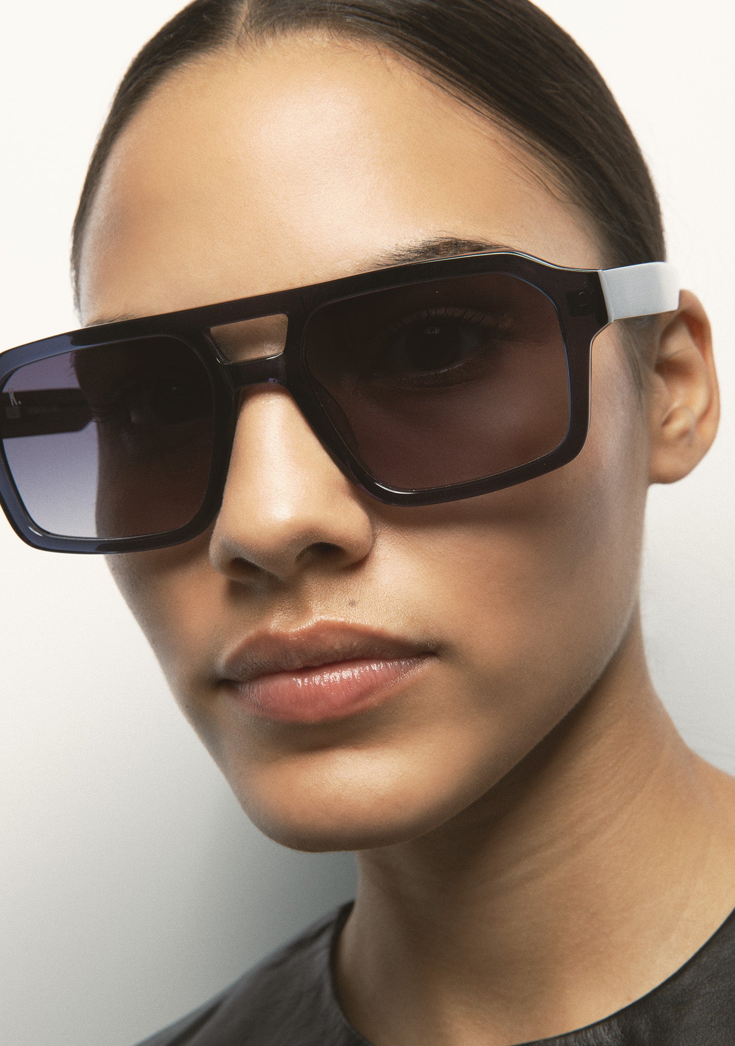 Rectangular Sunglasses with Double Bridge. Transparent gray acetate front and temples. Brown photochromic lenses, base 2, with UV protection and anti-reflective coating. Category 1 3 lenses. Integrated acetate nose pads. Handmade.