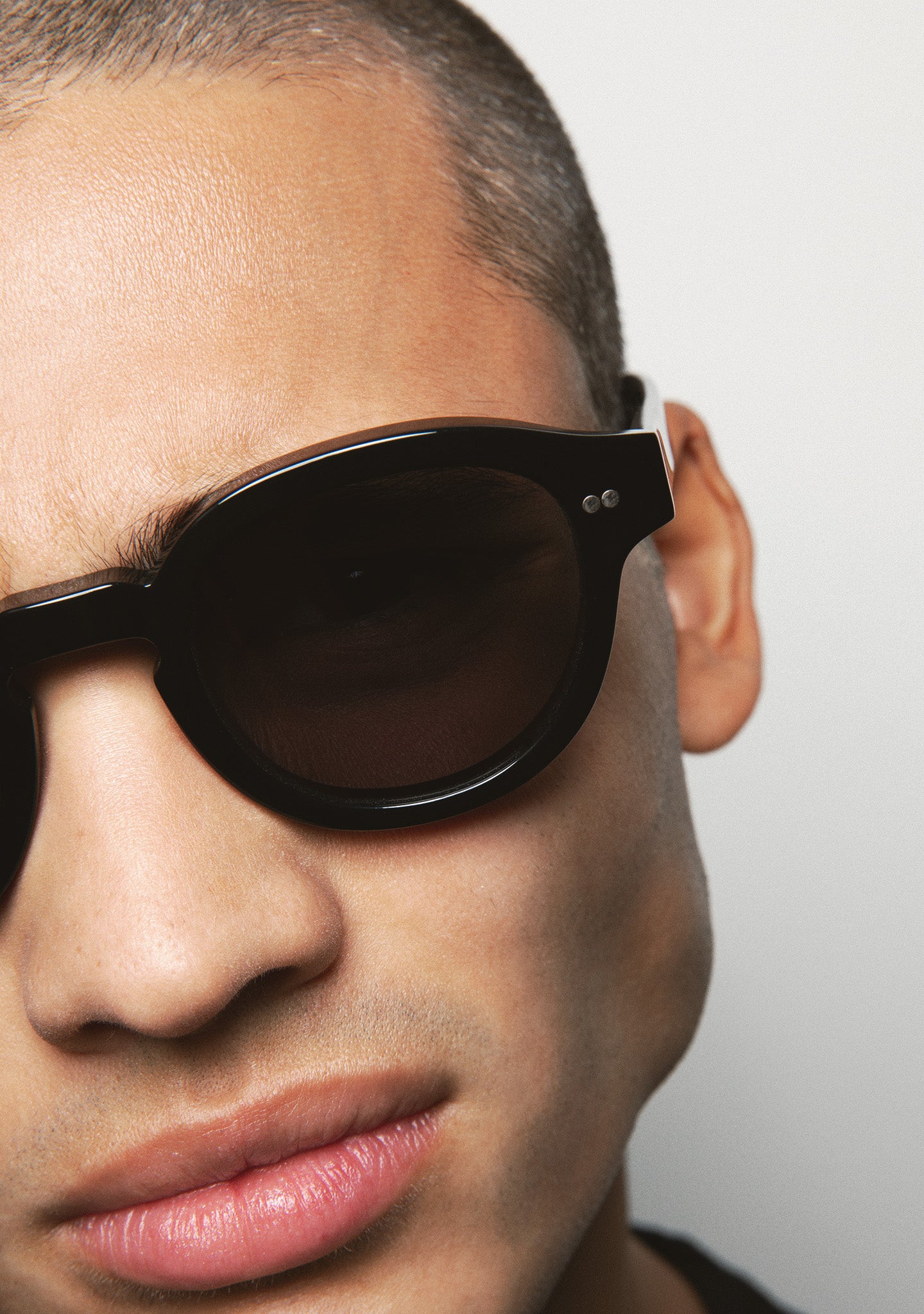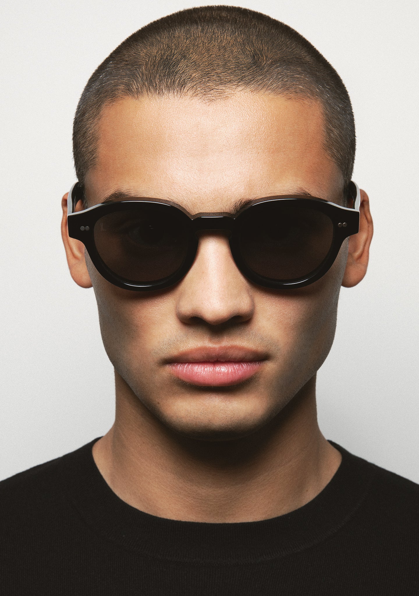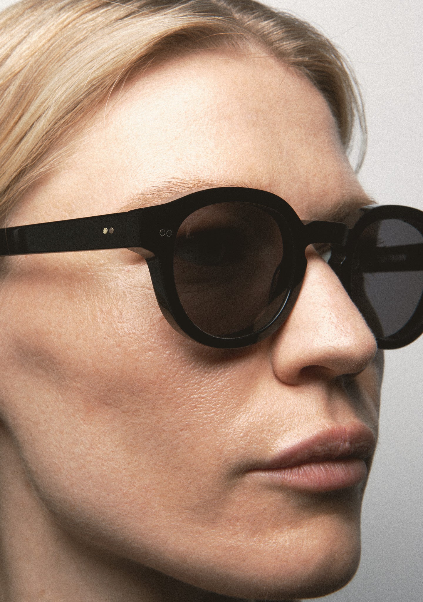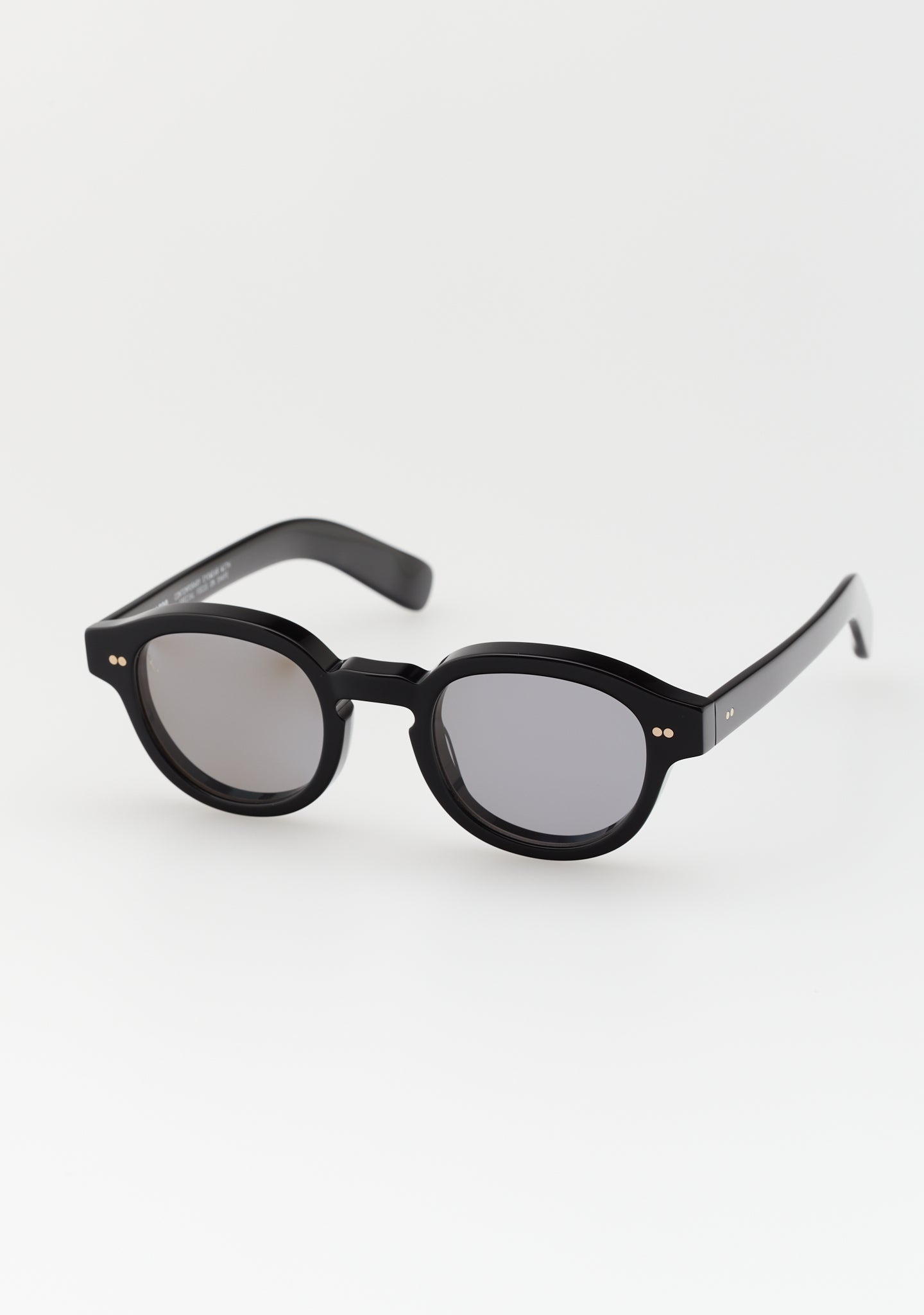 Sunglasses in thick, transparent acetate. Panto shape with keyhole bridge. Hinges with gold rivets on end elbow pieces and temples. Acetate temples. Green gradient tint base 2 lenses with 100% UV protection and anti-reflective treatment. Category 2 lenses. Built-in acetate nose pads. Handmade.