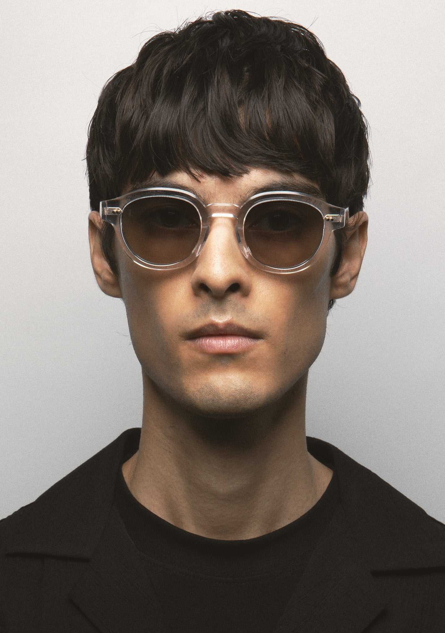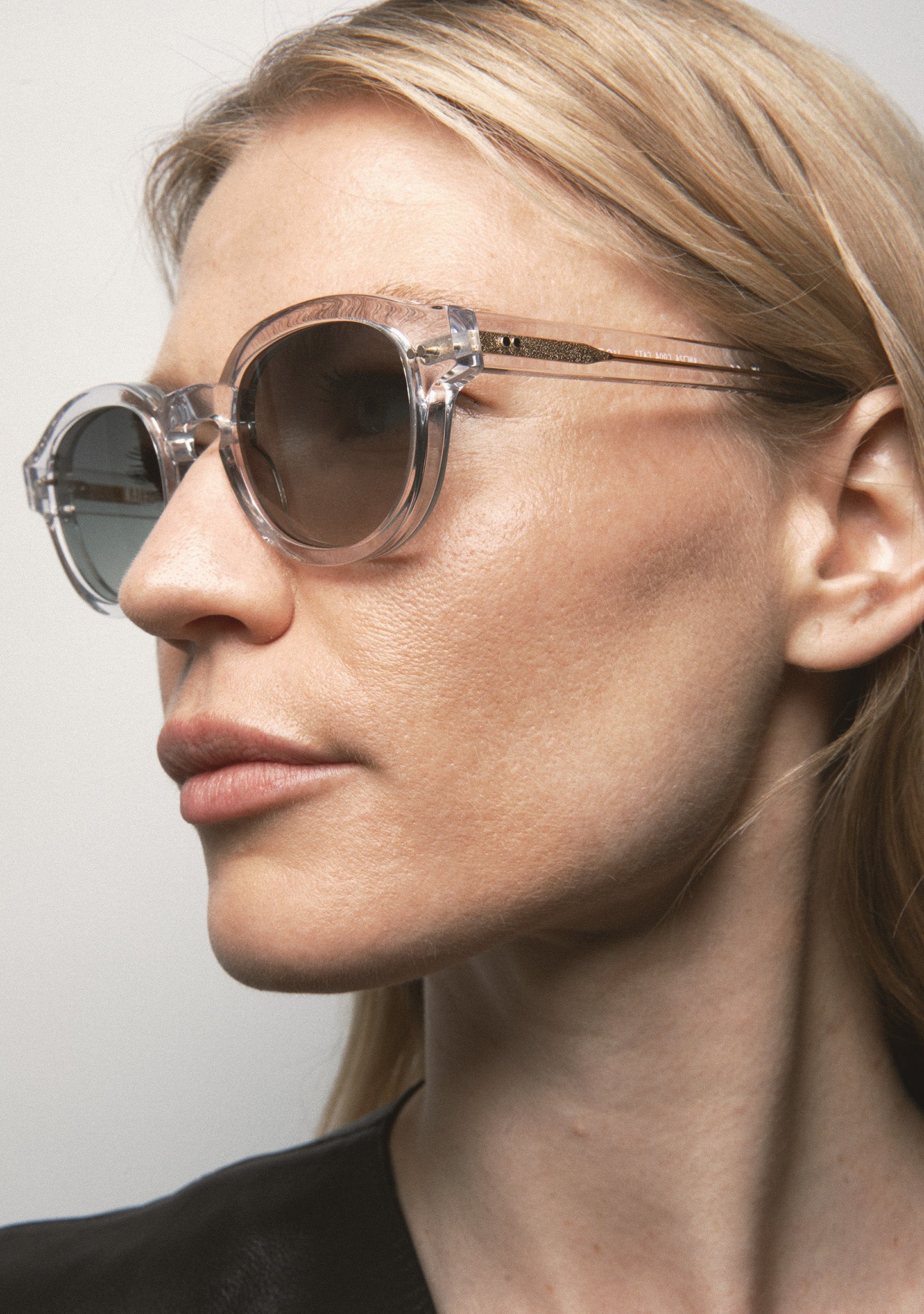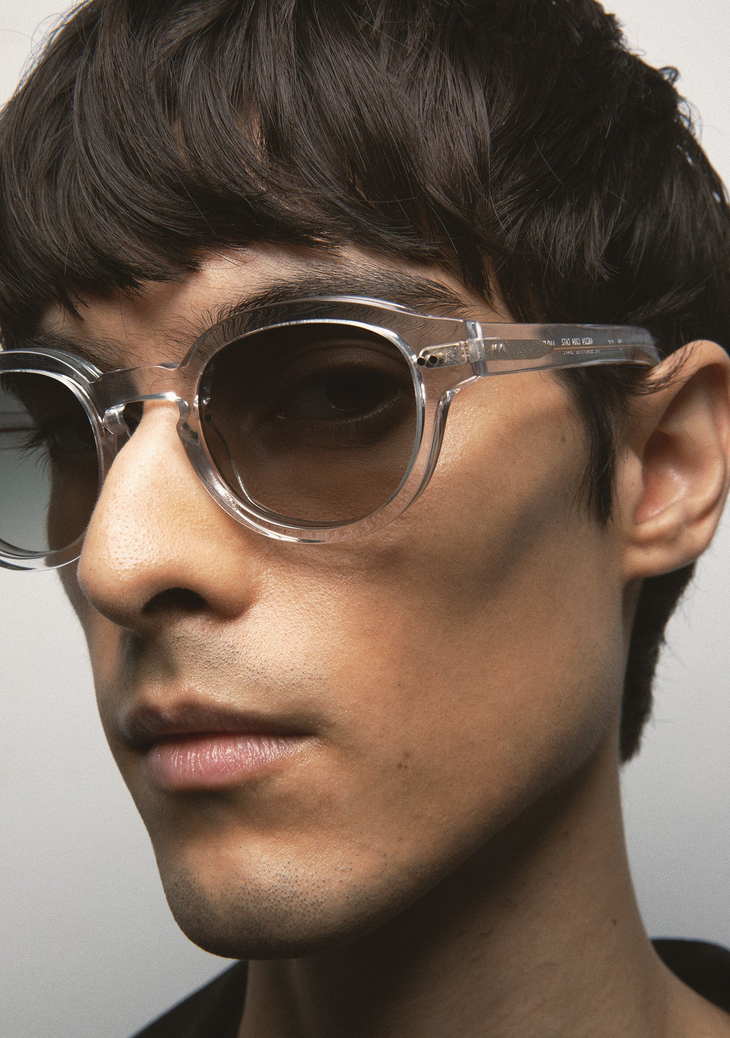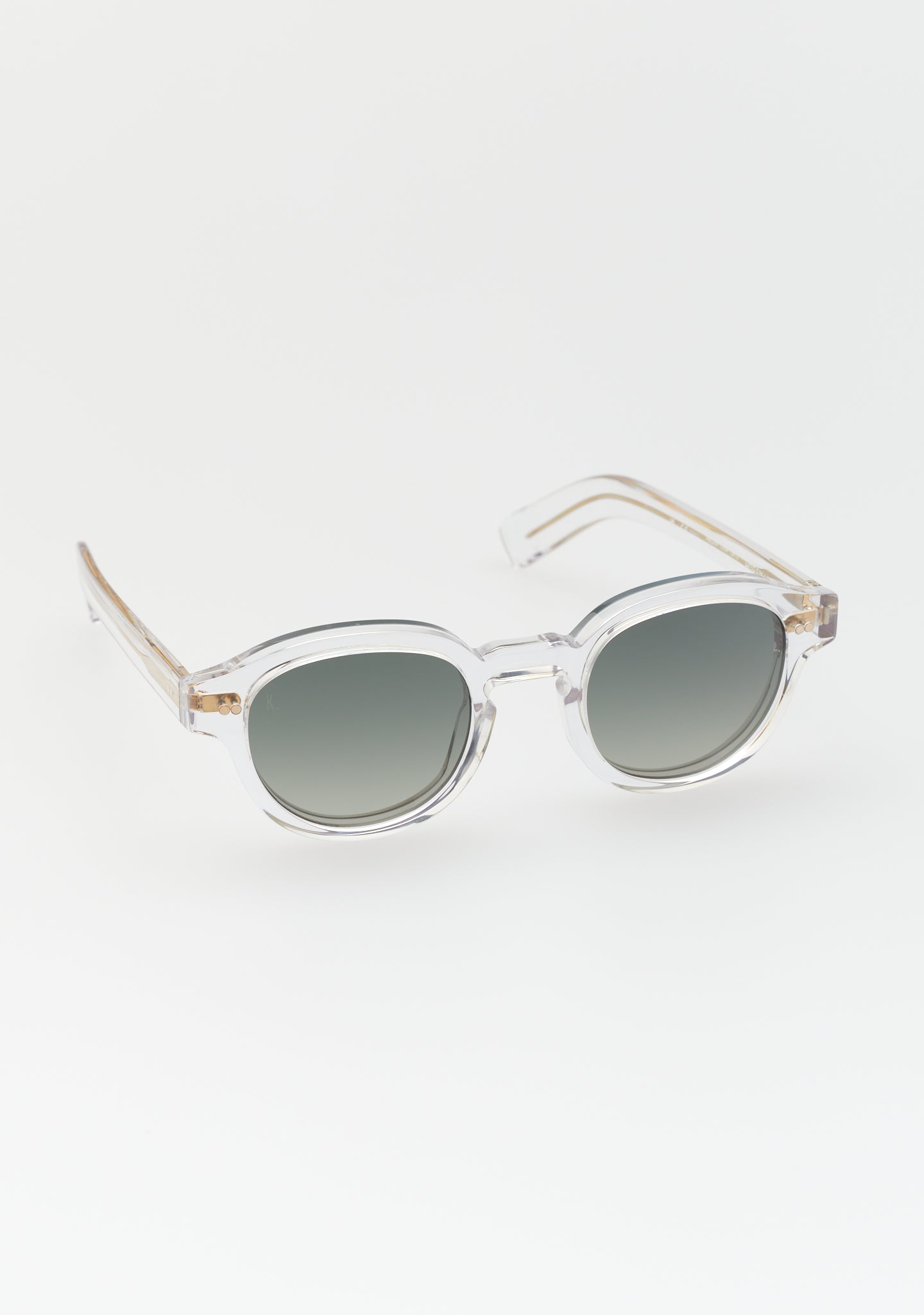 Sunglasses in thick, transparent acetate. Panto shape with keyhole bridge. Hinges with gold rivets on end elbow pieces and temples. Acetate temples. Green gradient tint base 2 lenses with 100% UV protection and anti-reflective treatment. Category 2 lenses. Built-in acetate nose pads. Handmade.