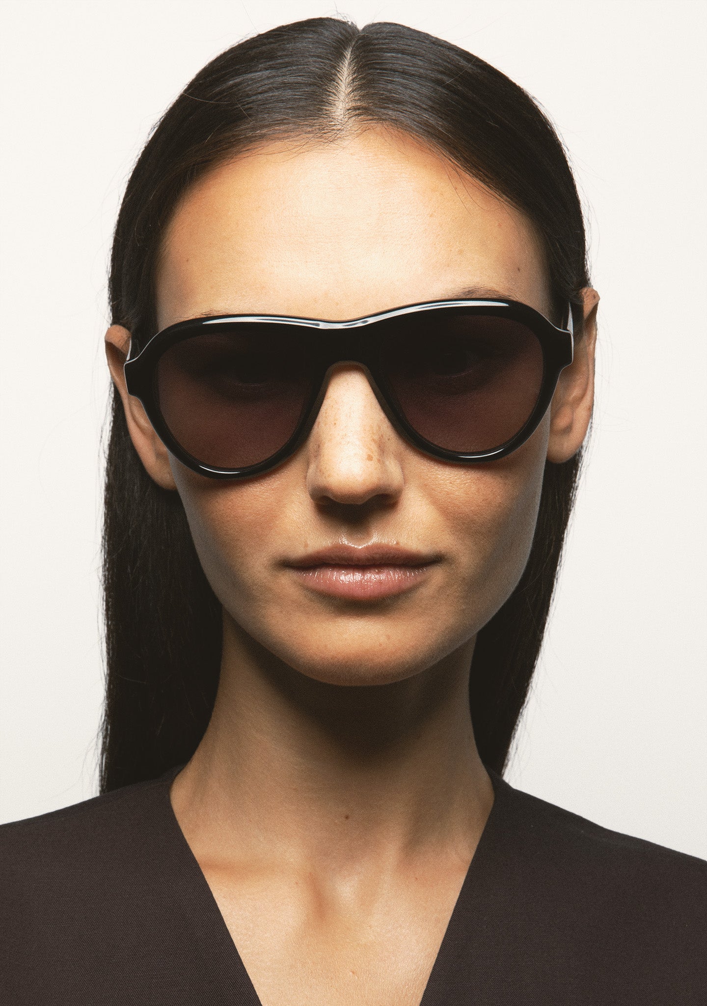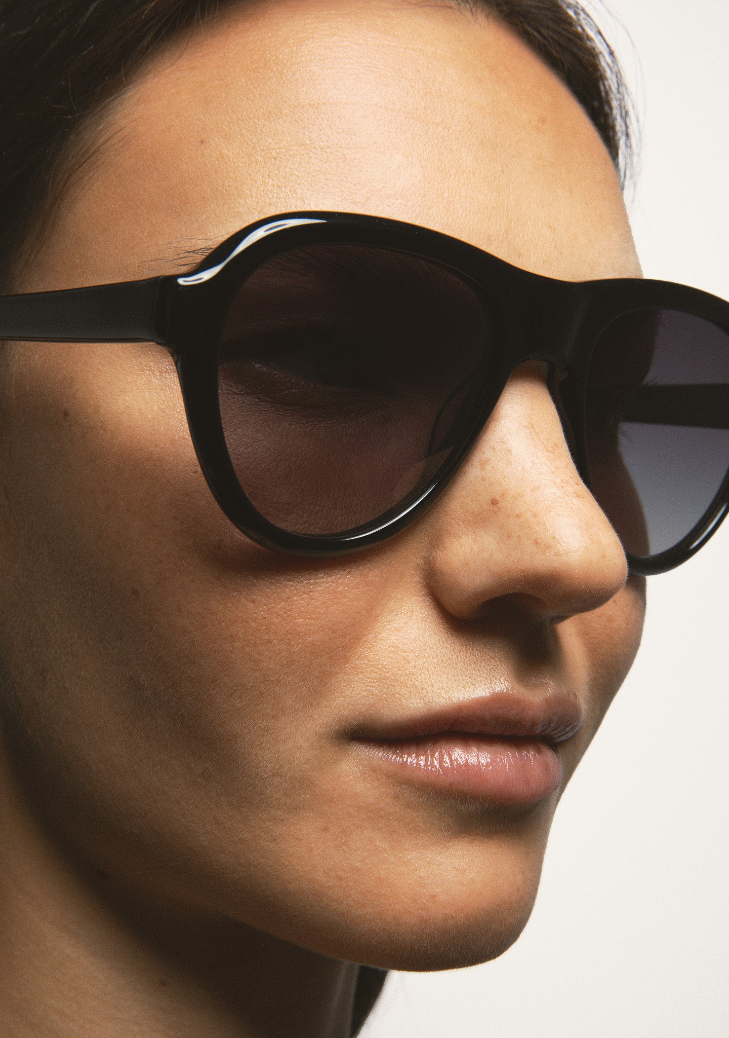 Aviator-shaped sunglasses with engraving around the entire front. Front and temples made of havana brown acetate. Grey gradient lens category 3 with base 2, 100% UV protection, and anti-reflective treatment. Integrated acetate nose pads. Handmade.