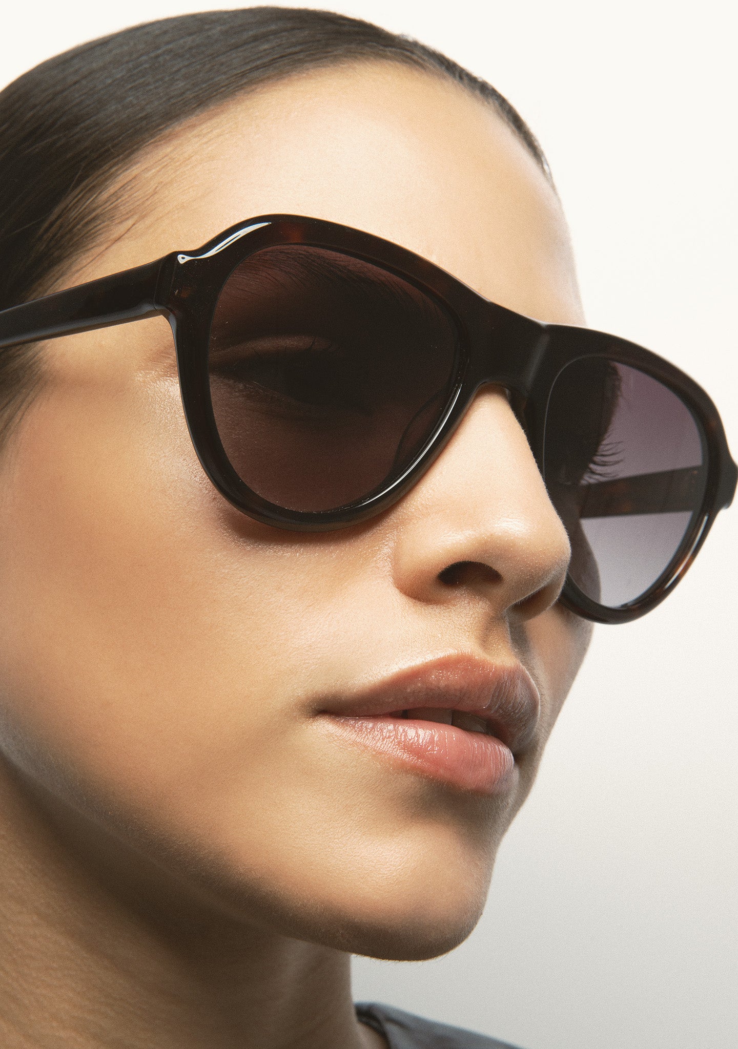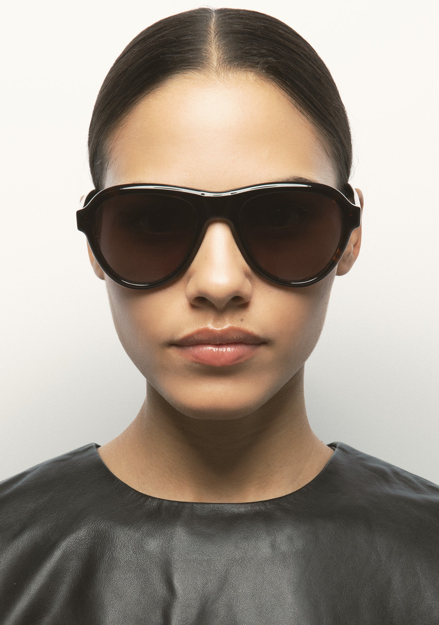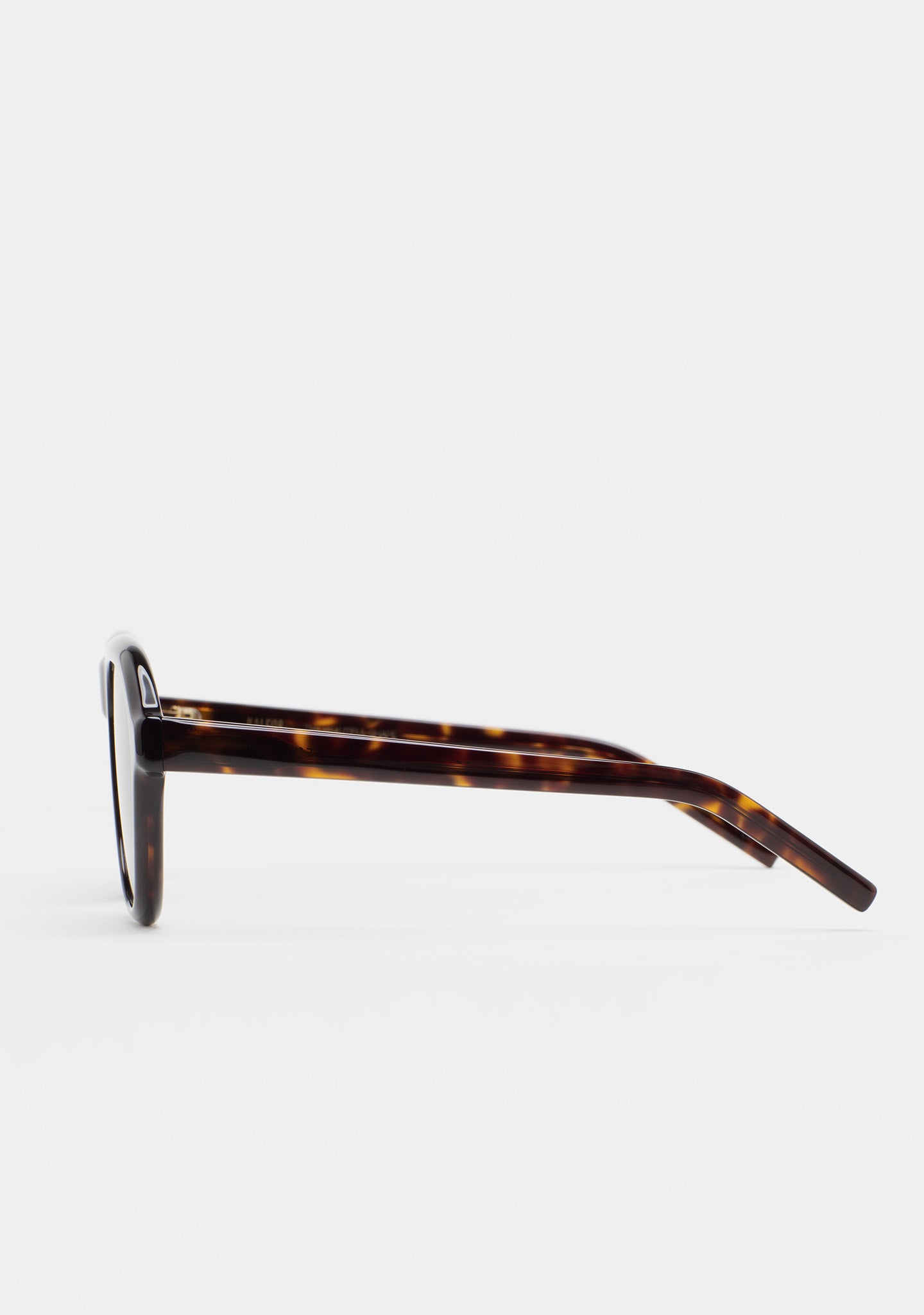 Aviator-shaped sunglasses with engraving around the entire front. Front and temples made of havana brown acetate. Grey gradient lens category 3 with base 2, 100% UV protection, and anti-reflective treatment. Integrated acetate nose pads. Handmade.