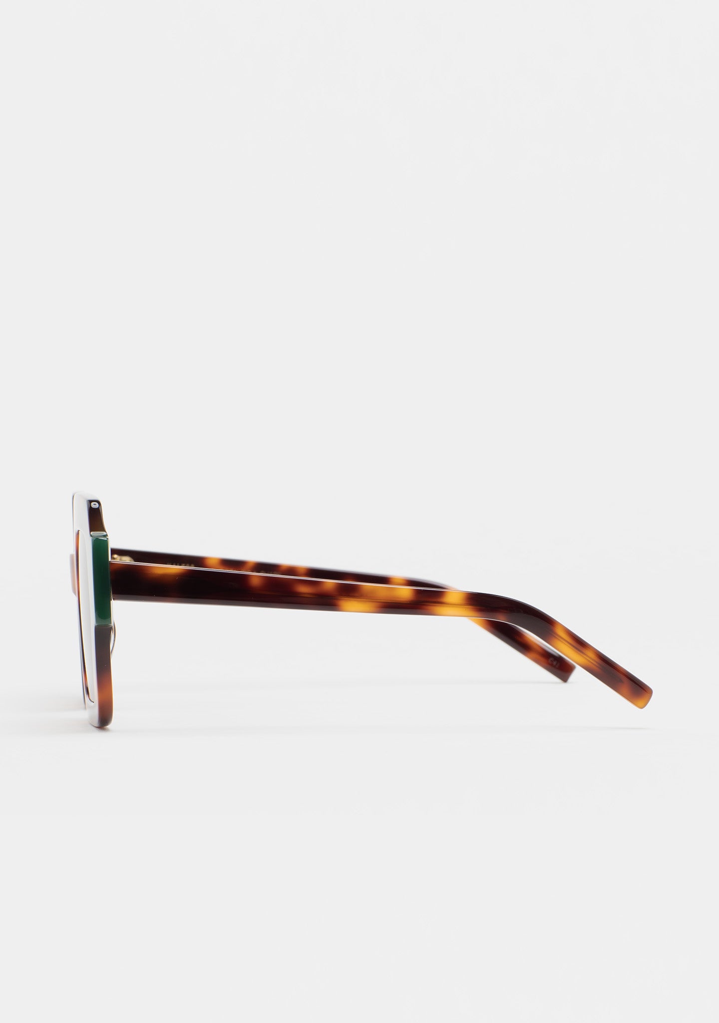 Square Sunglasses. Transparent green acetate front with brown Havana laminate. Transparent green acetate temples. Green gradient lenses, base 2, with 100% UV protection and anti-reflective coating. Category 2 lenses. Integrated acetate nose pads. Handmade.