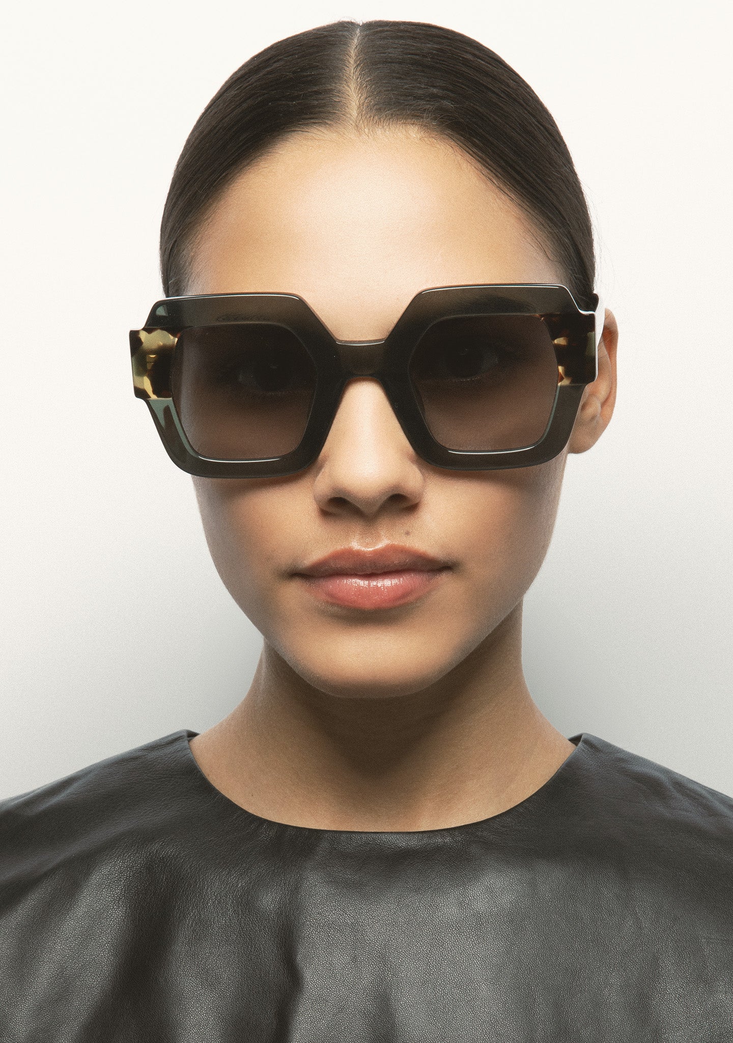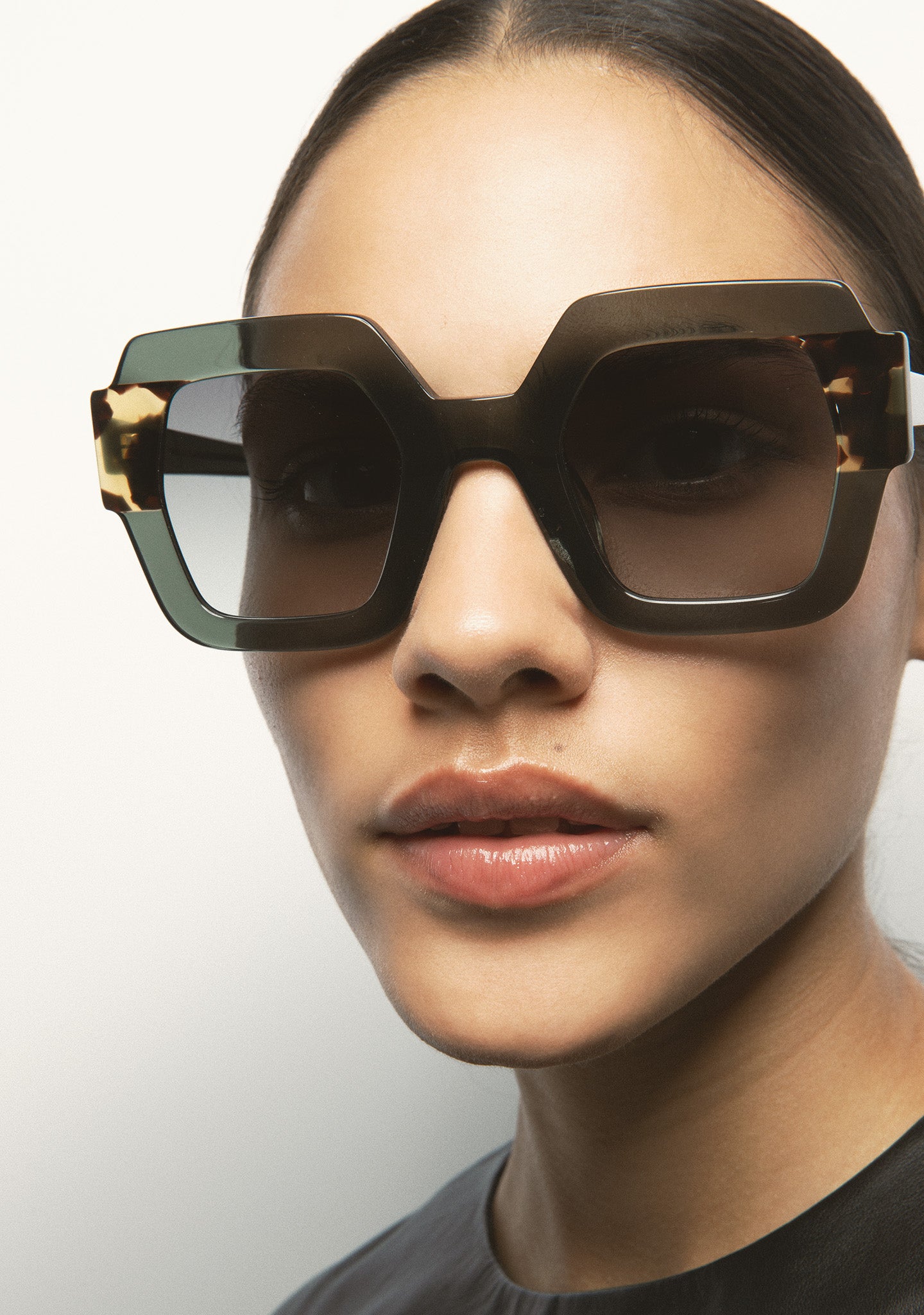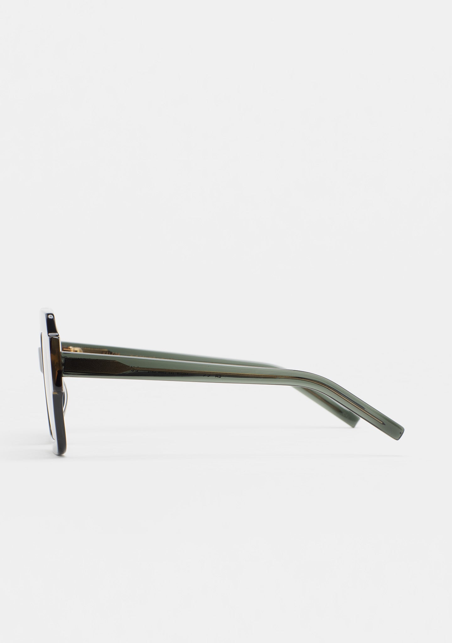 Square Sunglasses. Transparent green acetate front with brown Havana laminate. Transparent green acetate temples. Green gradient lenses, base 2, with 100% UV protection and anti-reflective coating. Category 2 lenses. Integrated acetate nose pads. Handmade.