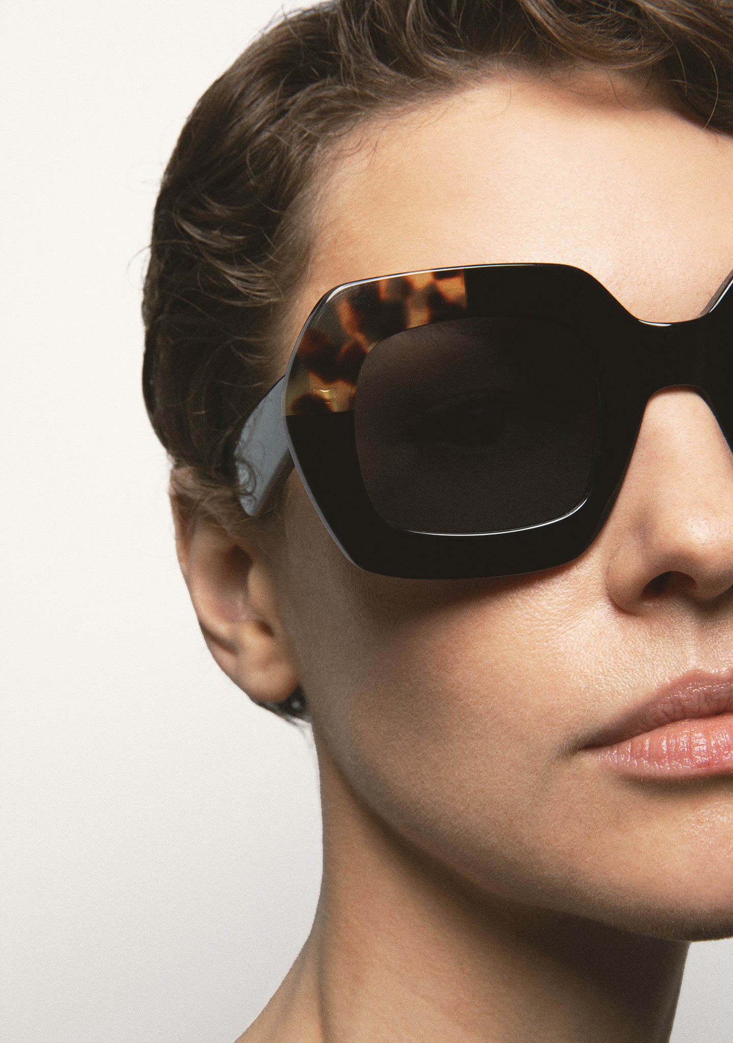 Square-shaped sunglasses. Front made of black acetate with Havana brown laminate. Black acetate temples. Gray gradient lens, base 2, with 100% UV protection and anti-reflective treatment. Category 3 lens. Integrated acetate nose pads. Handmade.