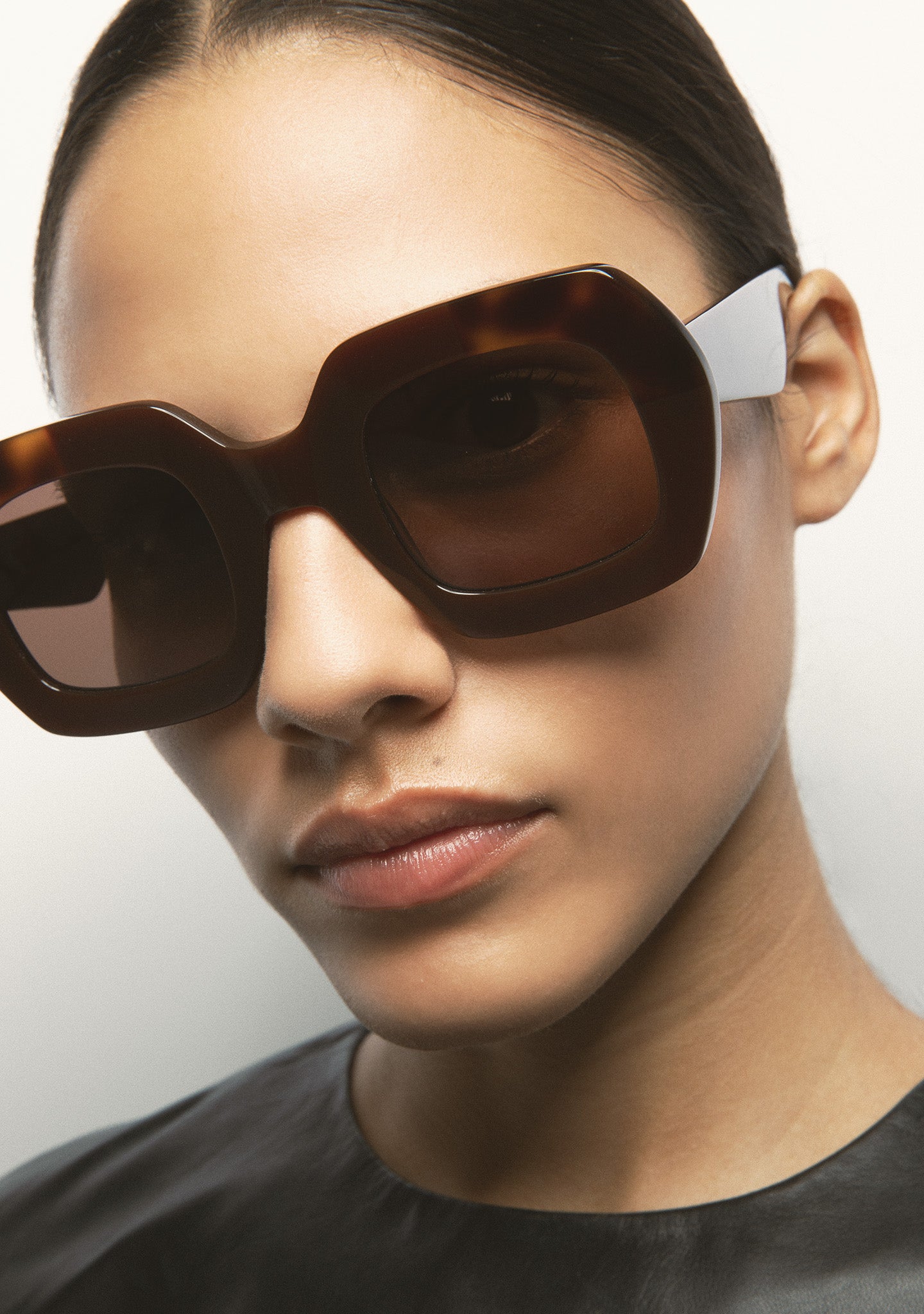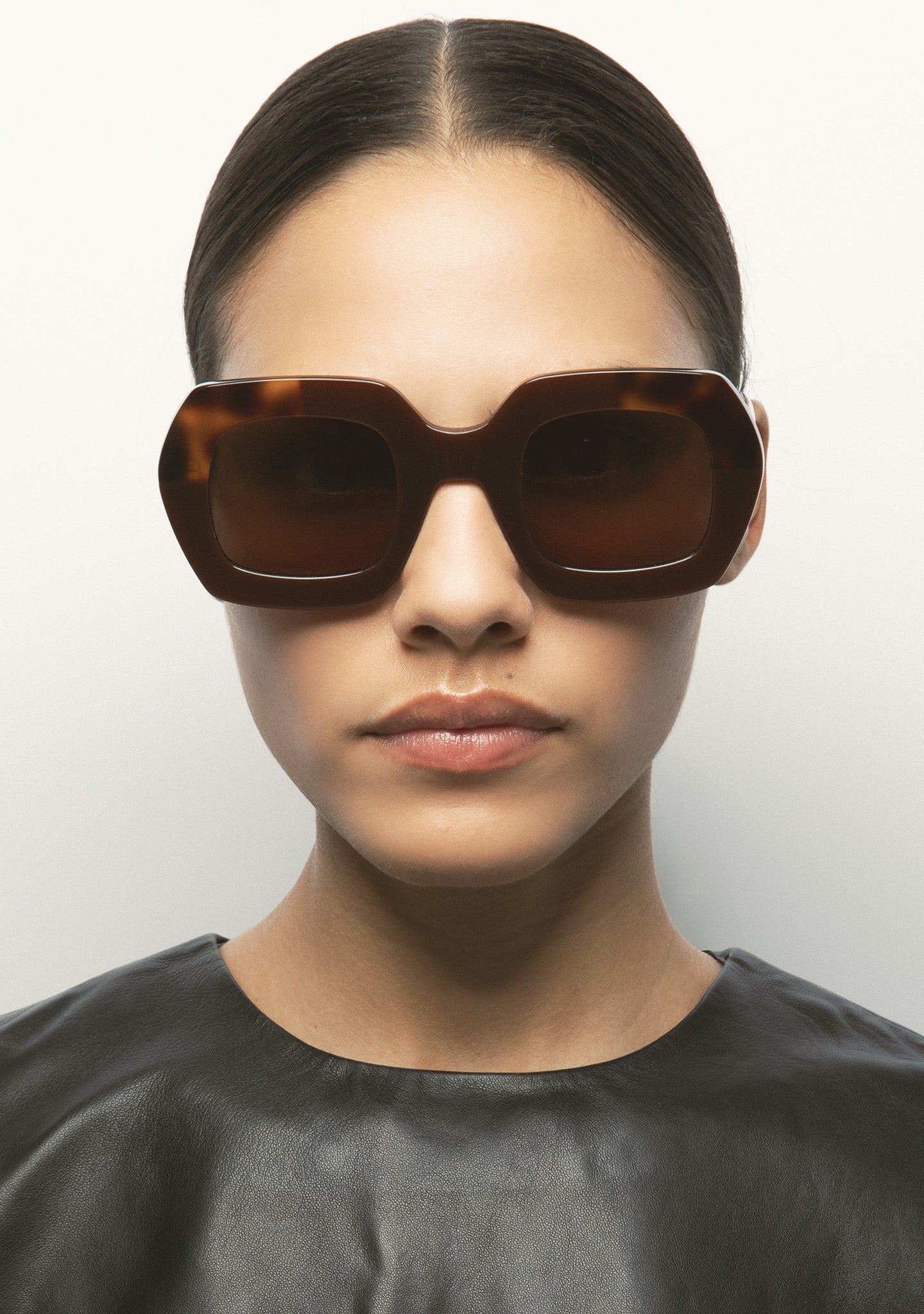 Square-shaped sunglasses. Front made of black acetate with Havana brown laminate. Black acetate temples. Gray gradient lens, base 2, with 100% UV protection and anti-reflective treatment. Category 3 lens. Integrated acetate nose pads. Handmade.