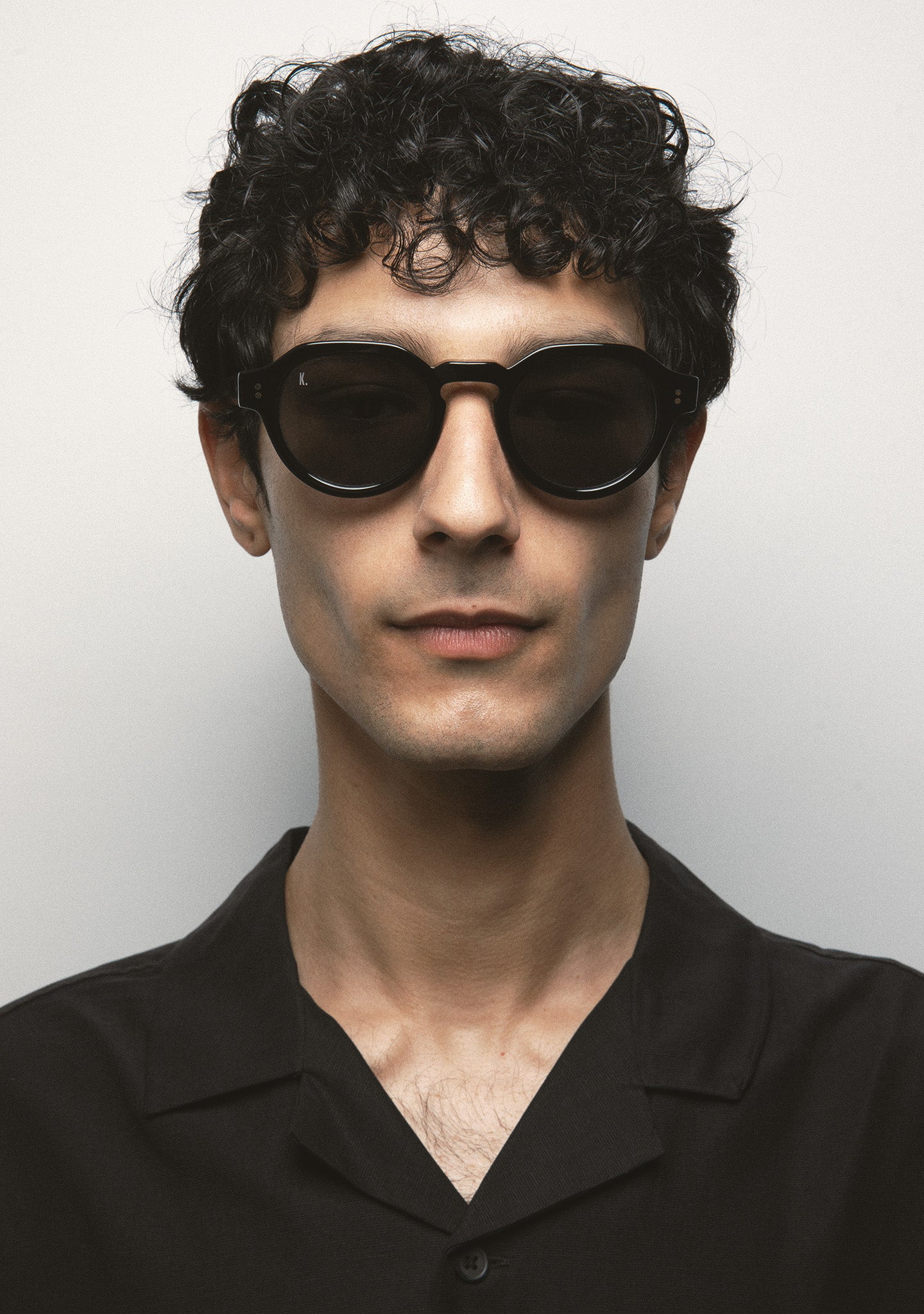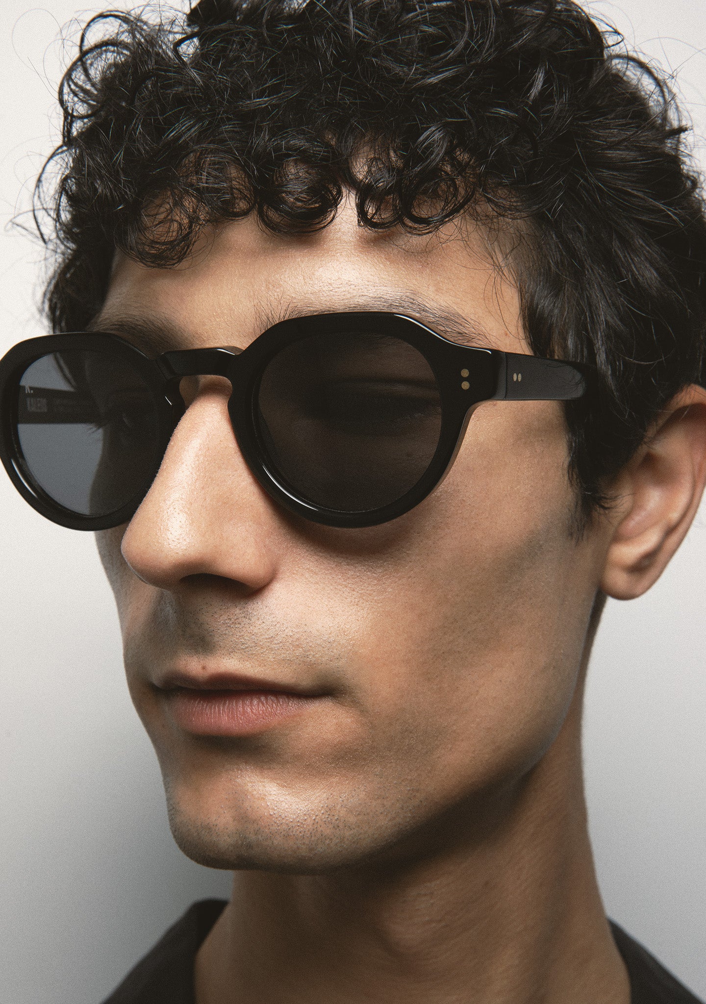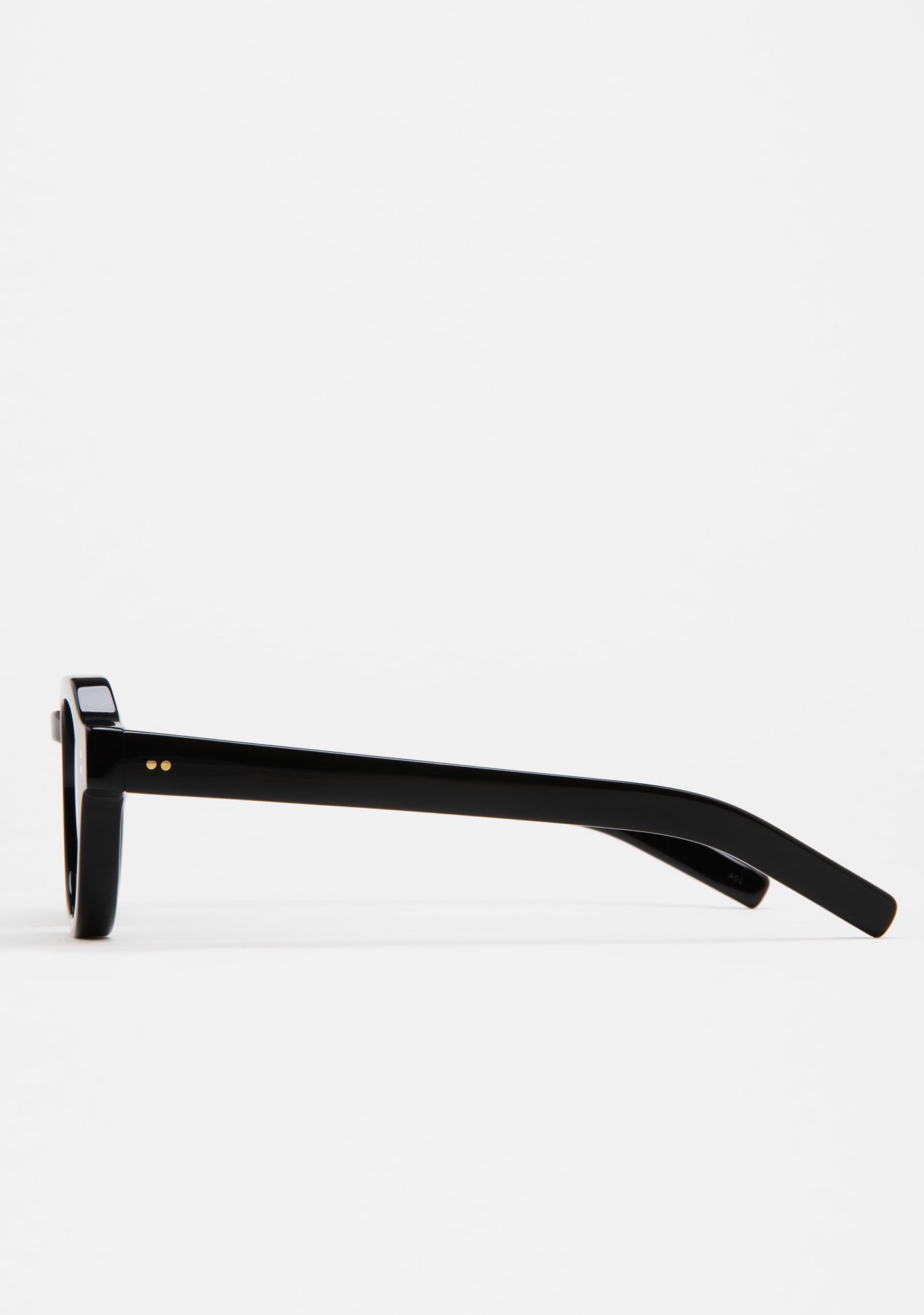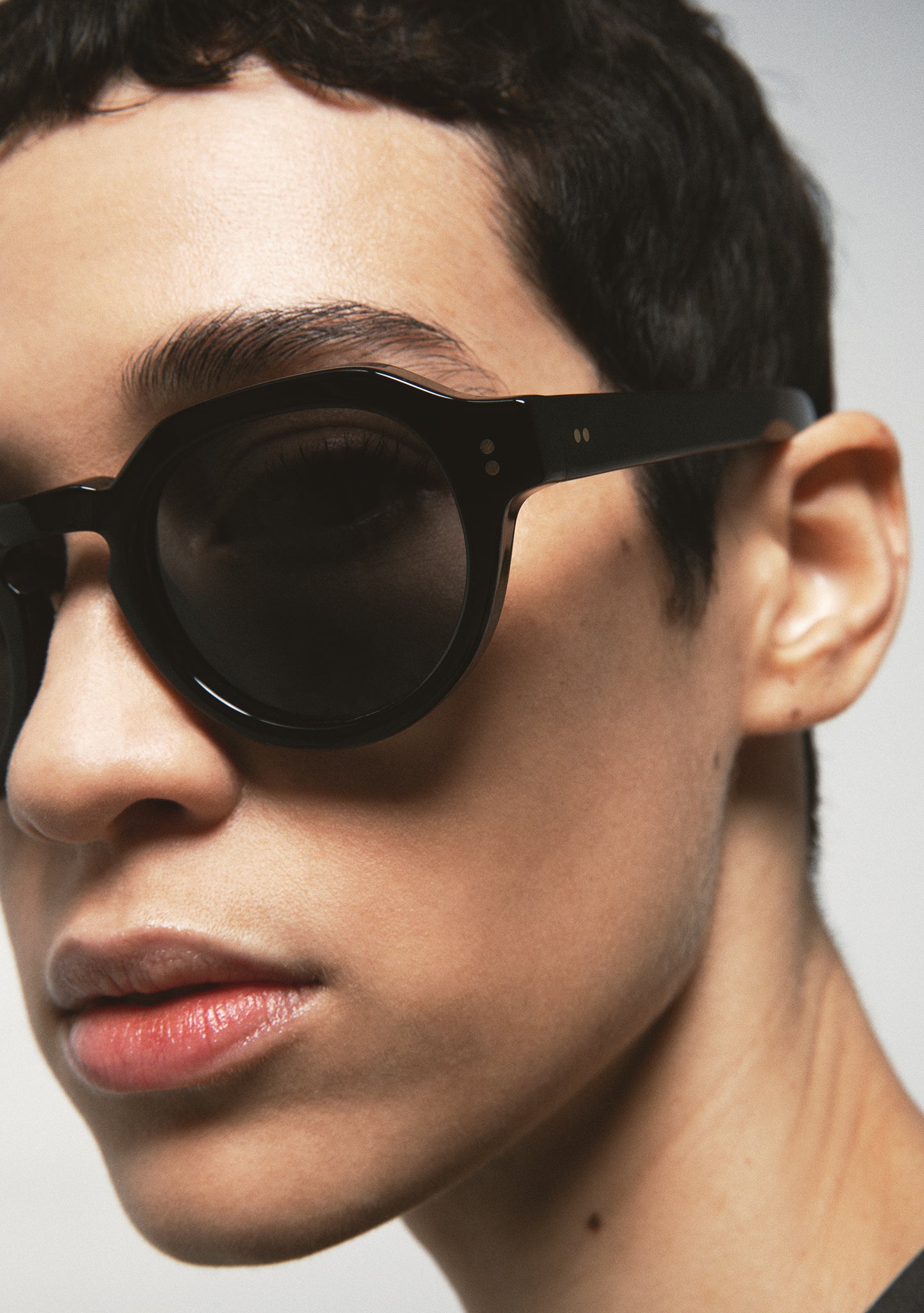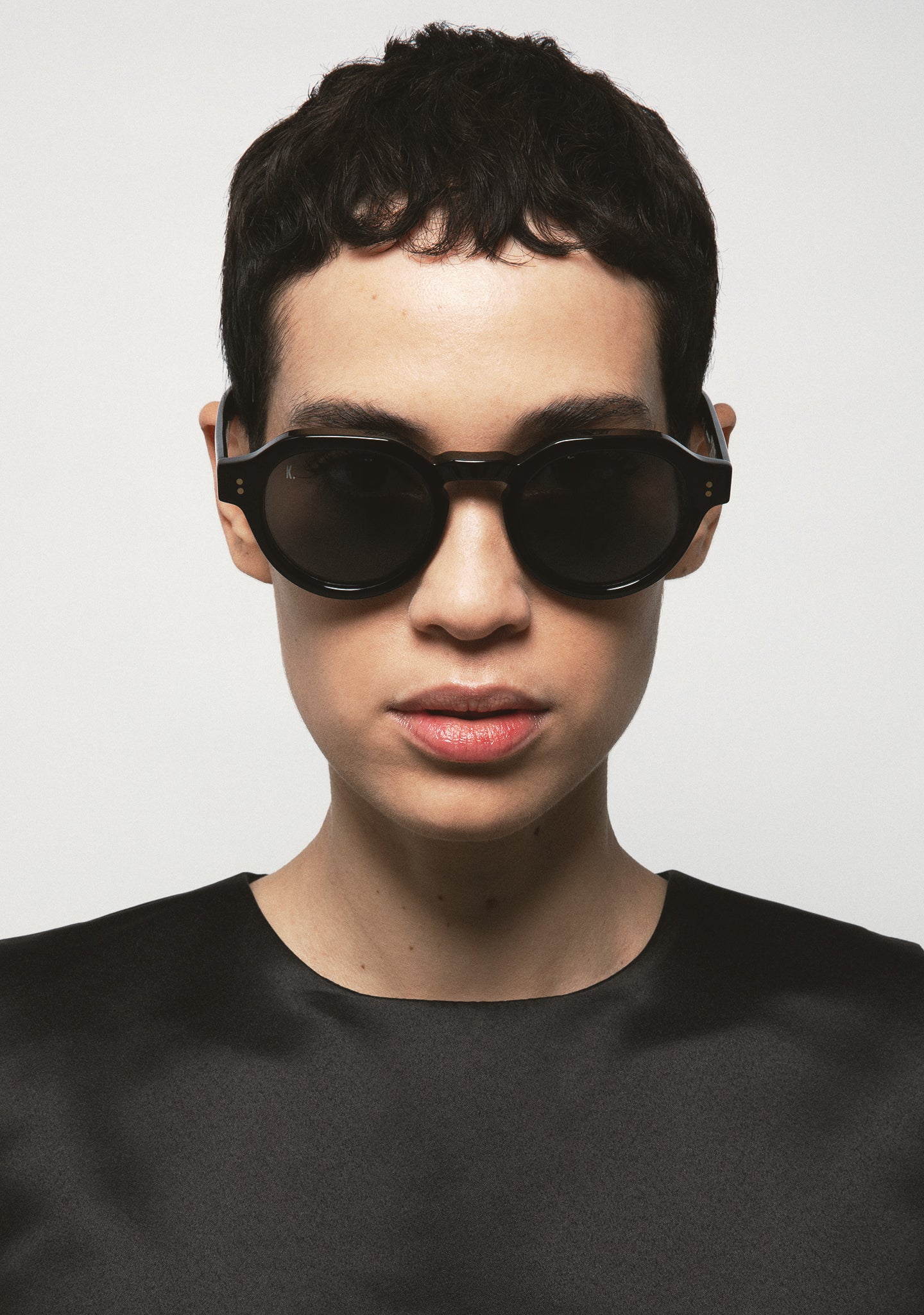 Panto shaped sunglasses with keyhole bridge and flat top bar. Thick acetate frame front in transparent dark grey. Acetate temples in transparent dark grey. Hinges with silver rivets on end elbow pieces and temples. Black gradient tint 2-base lenses with 100% UV protection and anti-reflective treatment. Category 3 lenses. Built-in acetate nose pads. Handmade.