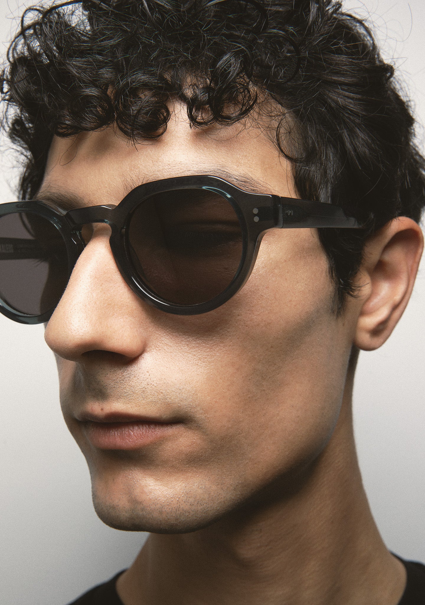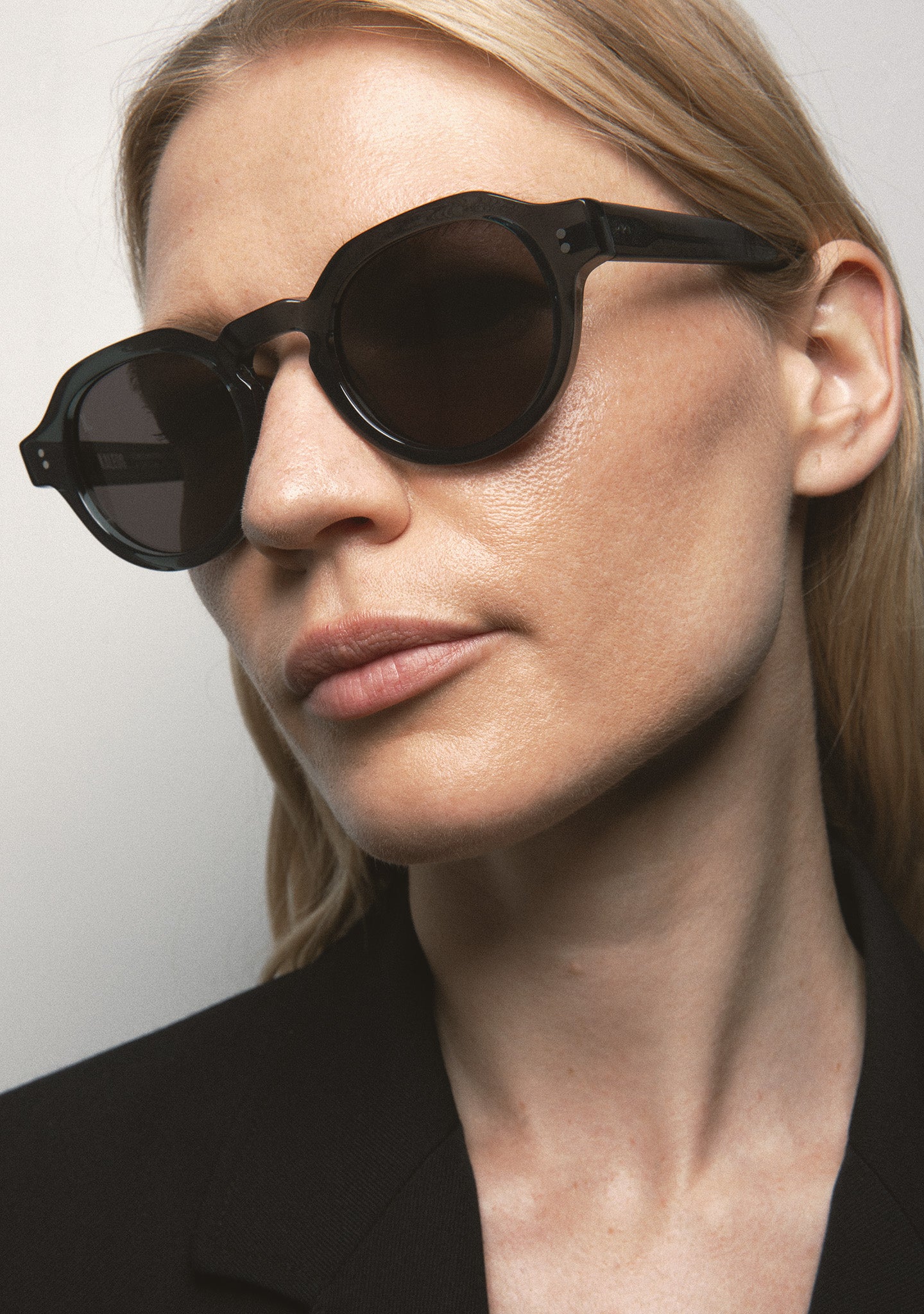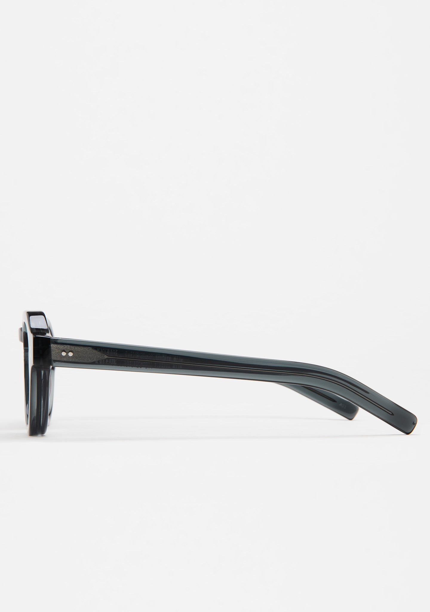 Panto shaped sunglasses with keyhole bridge and flat top bar. Thick acetate frame front in transparent dark grey. Acetate temples in transparent dark grey. Hinges with silver rivets on end elbow pieces and temples. Black gradient tint 2-base lenses with 100% UV protection and anti-reflective treatment. Category 3 lenses. Built-in acetate nose pads. Handmade.