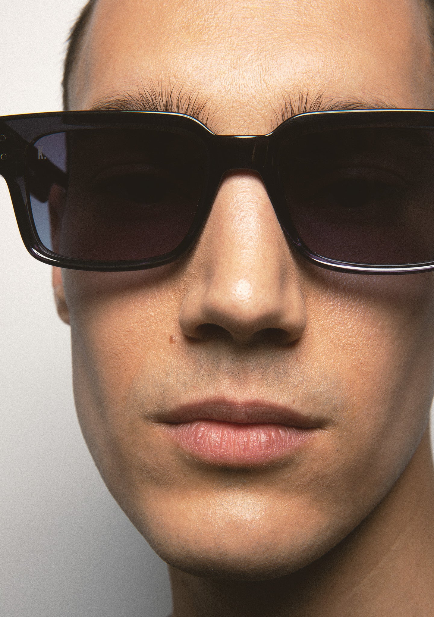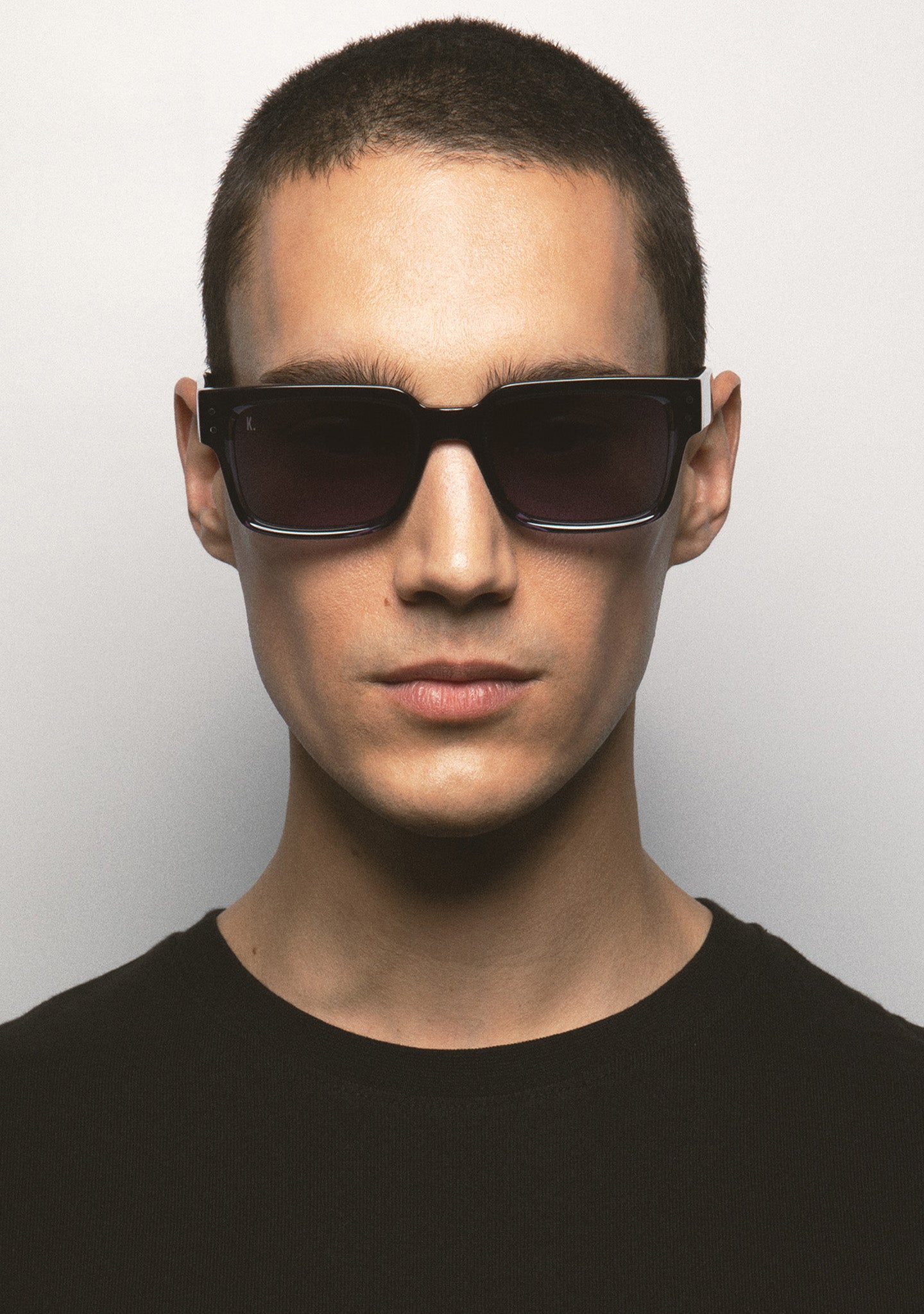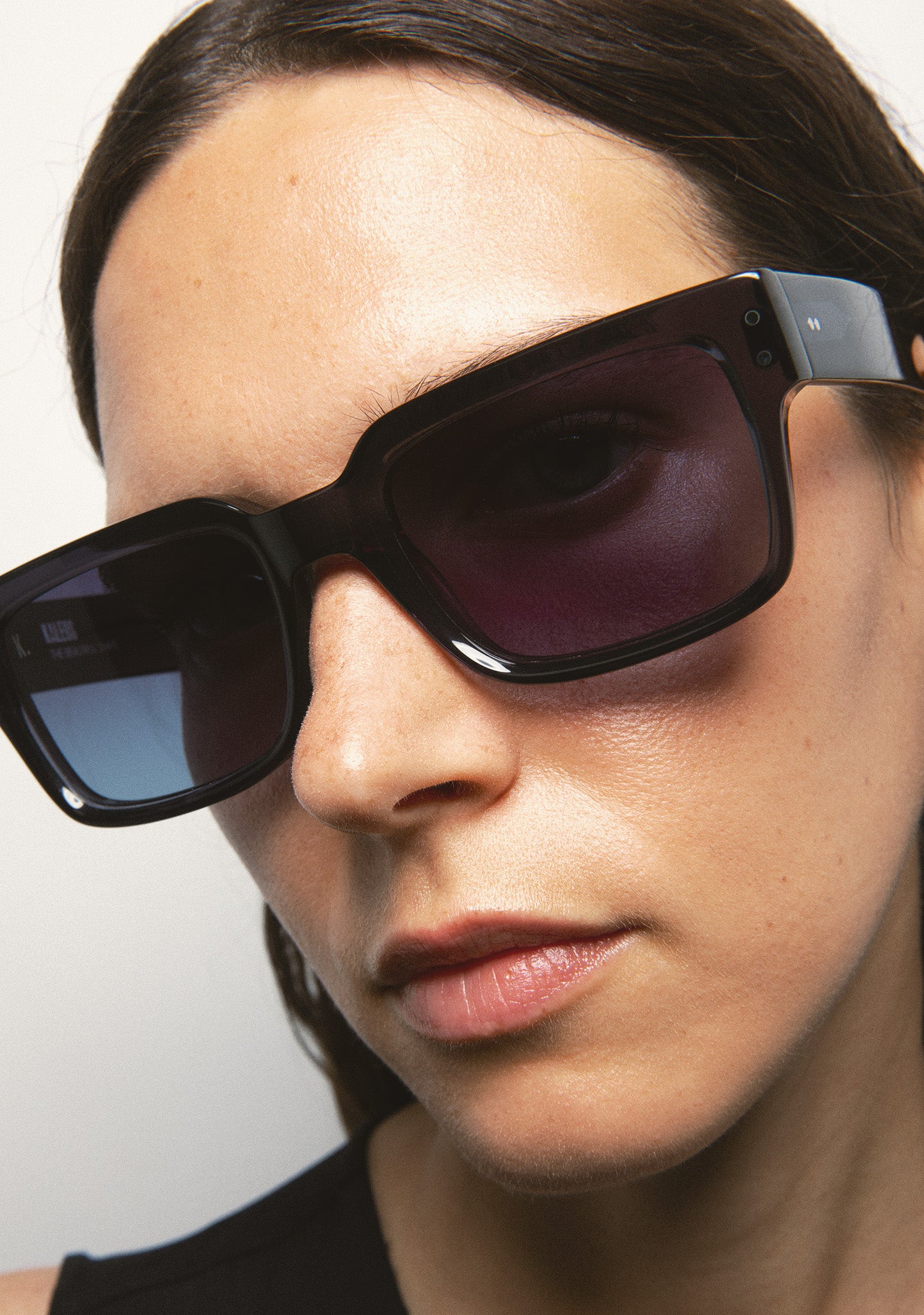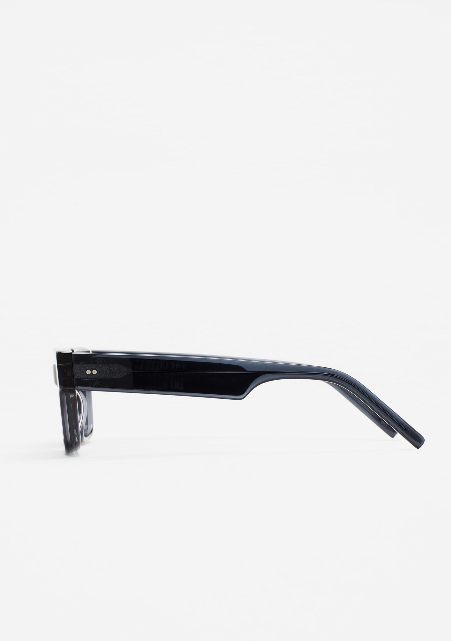 Rectangular-shaped optical glasses. Black acetate front and temples. Silver rivet hinges on the corners and temples. Blue photochromic gradient 2-base lens with UV protection and anti-reflective treatment. Category 1-3 lenses. Built-in acetate nose pads. Handmade.