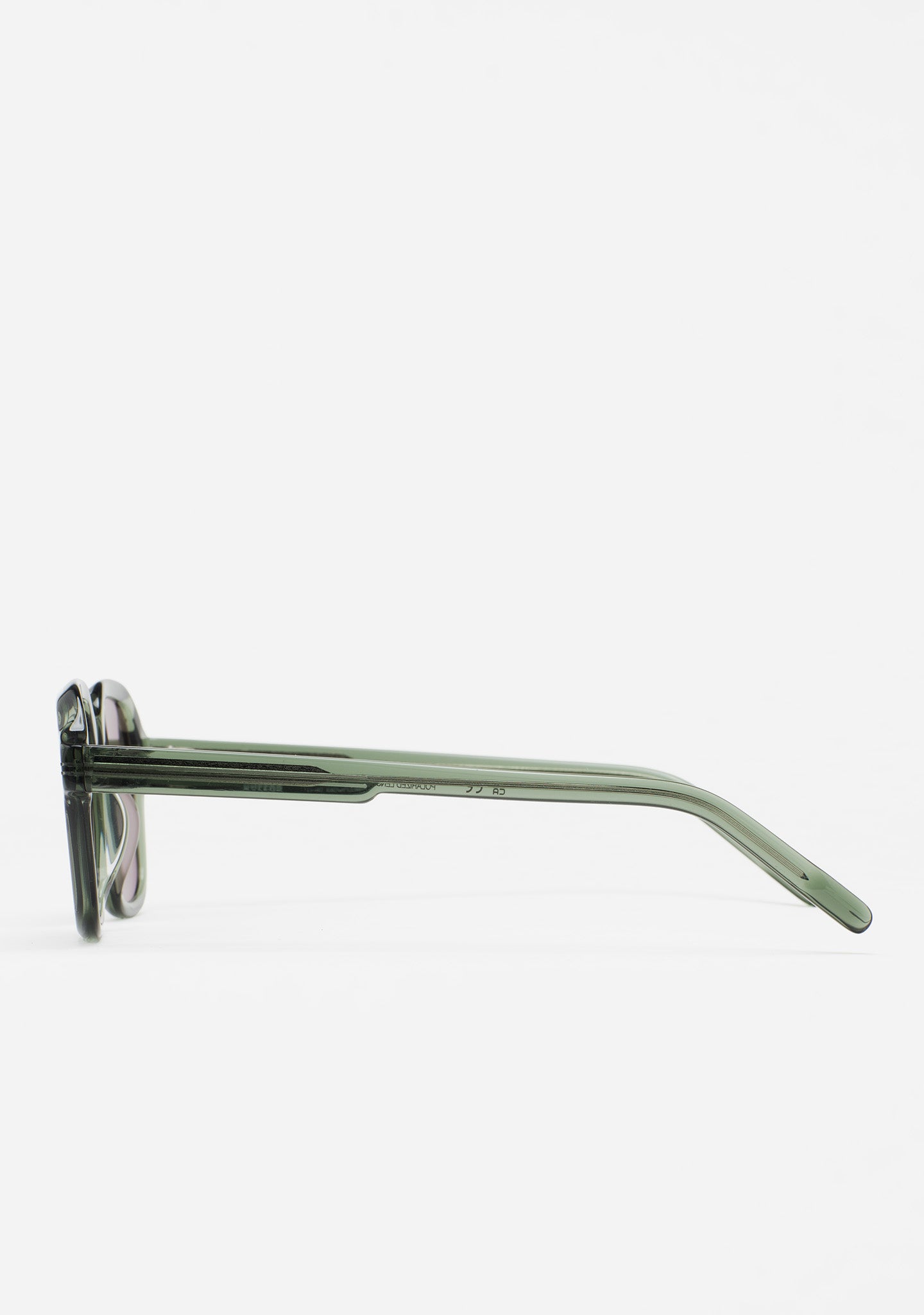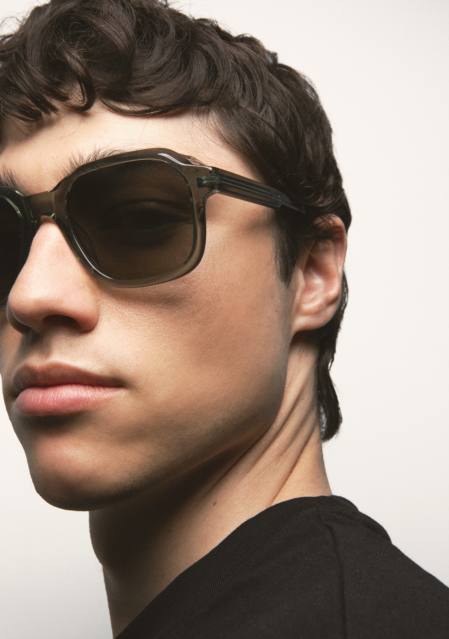 Square-shaped sunglasses with milling around the lenses. Black acetate frame front and temples. Photochromic green lenses, base 2, with UV protection and anti-reflective treatment. Category 1-3 lenses. Built-in acetate nose pads. Handmade.