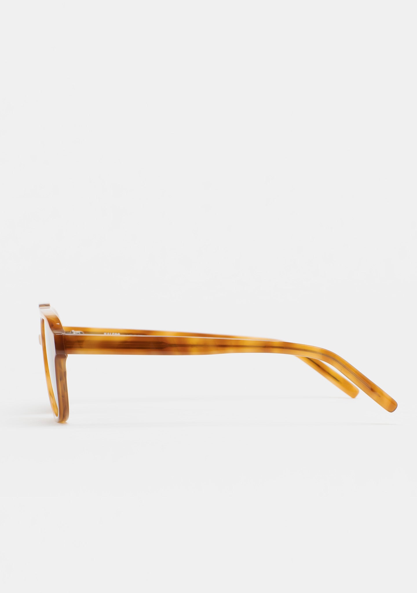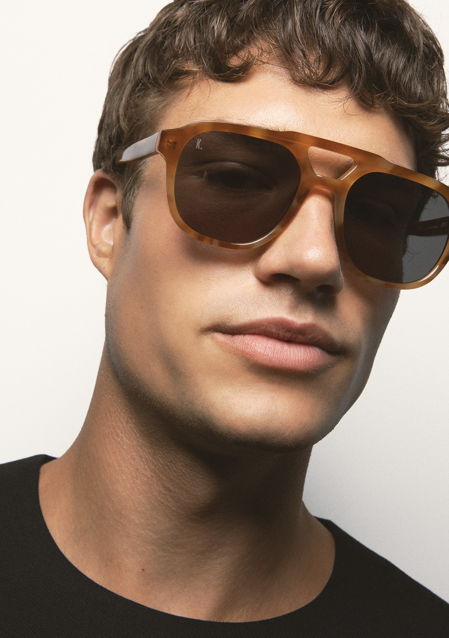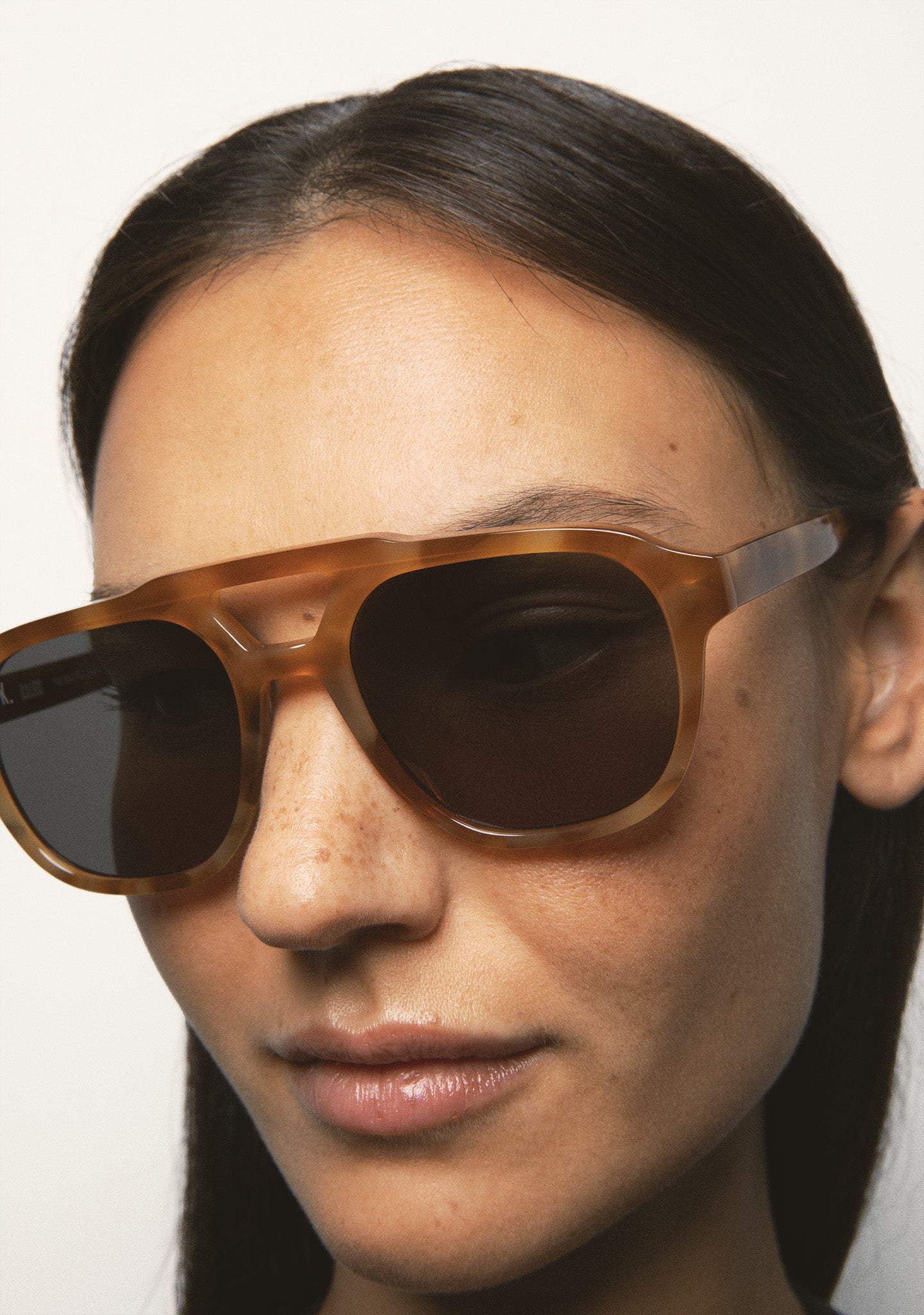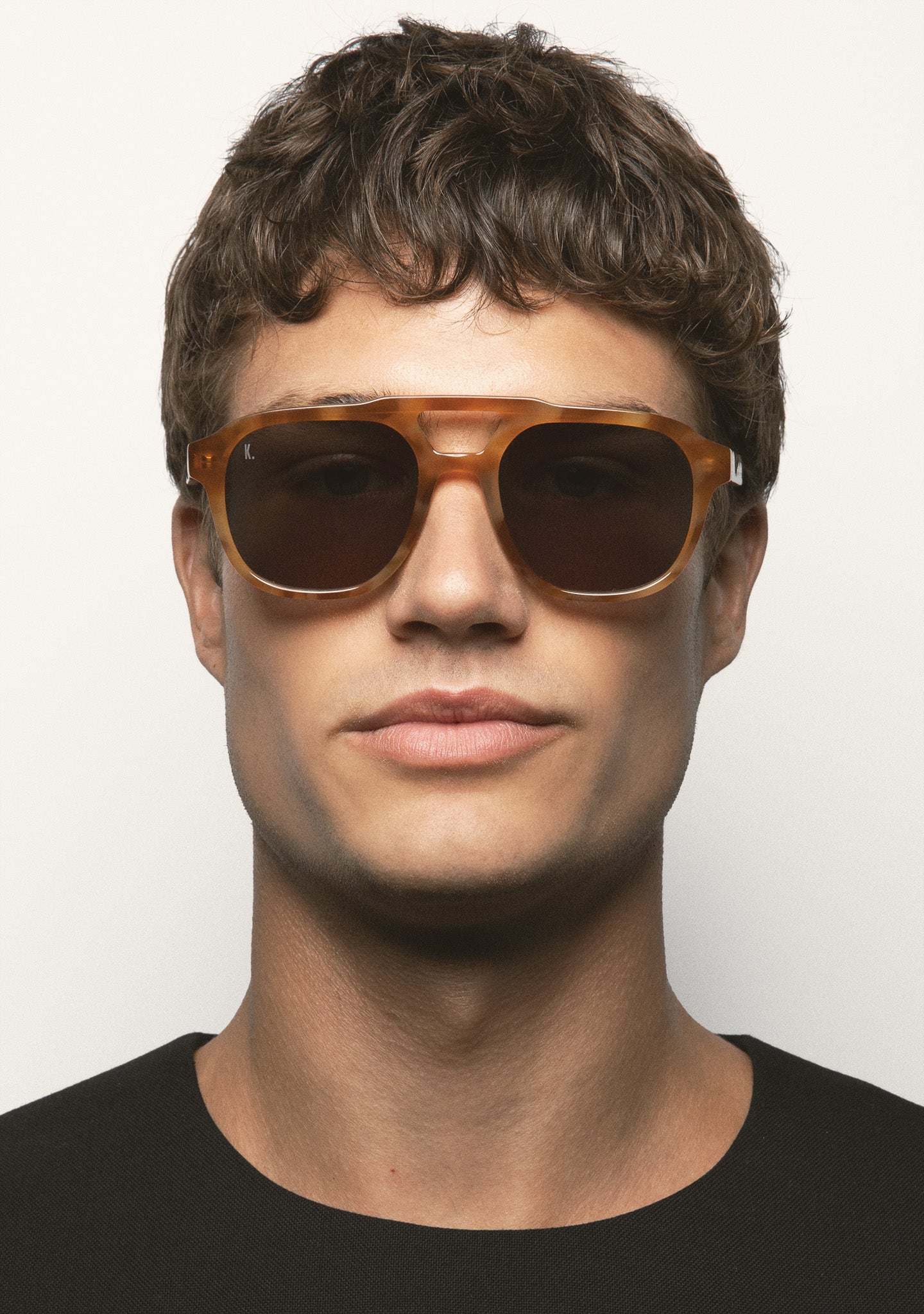 Square sunglasses with double bridge. Honey havana acetate front and temples. Dark green lenses, base 2, with 100% UV protection and anti-reflective coating. Category 3 lenses. Integrated acetate nose pads. Handmade.