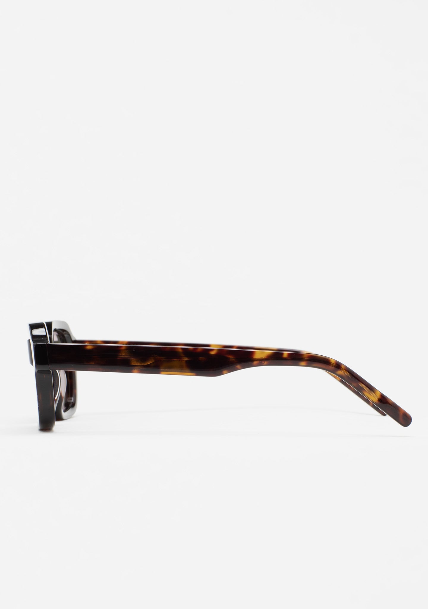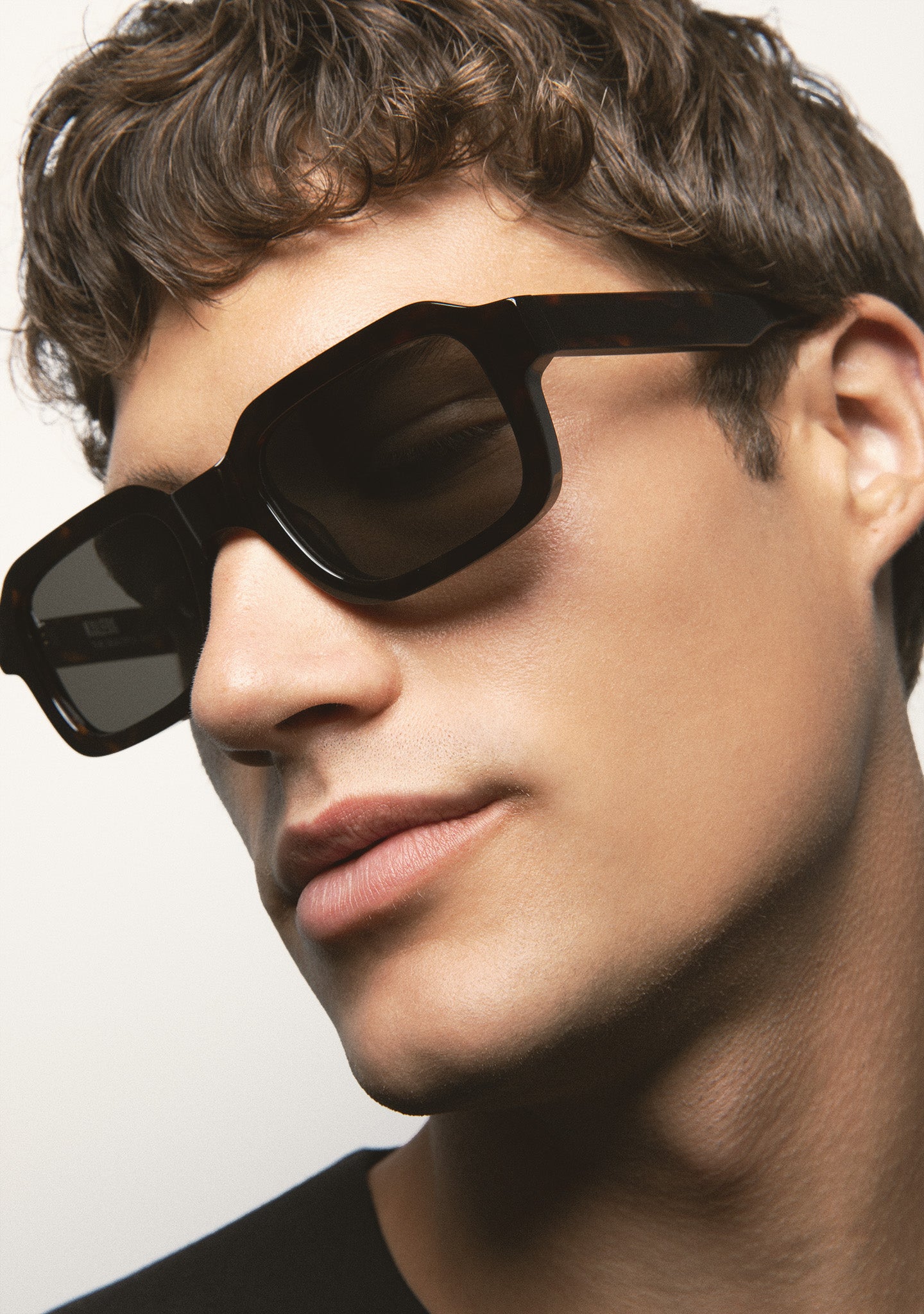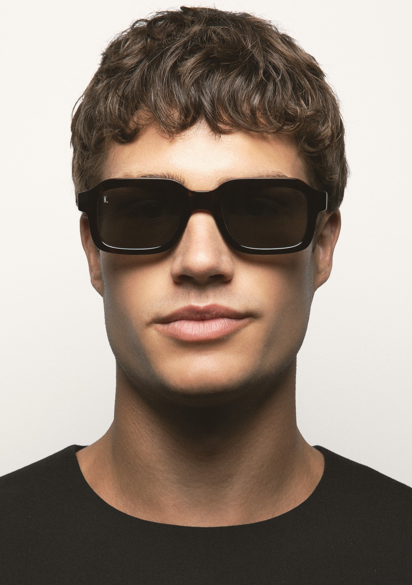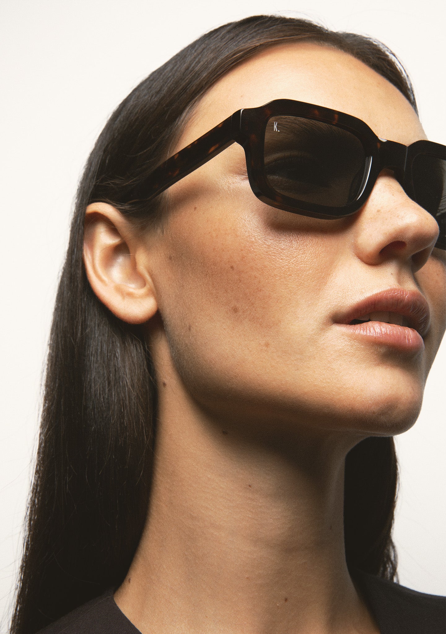 Rectangular sunglasses. Black acetate frame and temples. Photochromic green lens, base 2, with UV protection and anti-reflective treatment. Category 1-3 lens. Integrated acetate nose pads. Handcrafted.