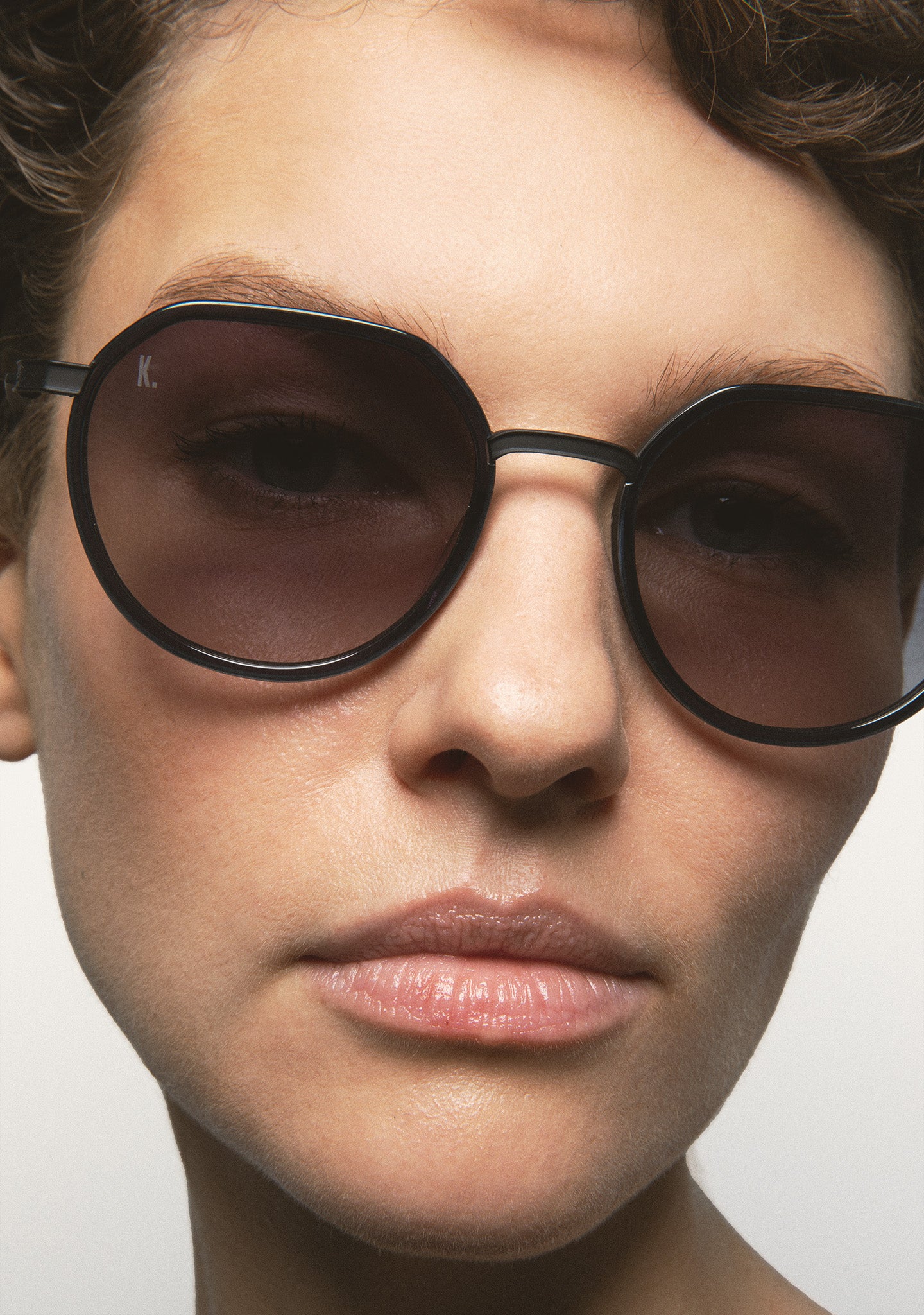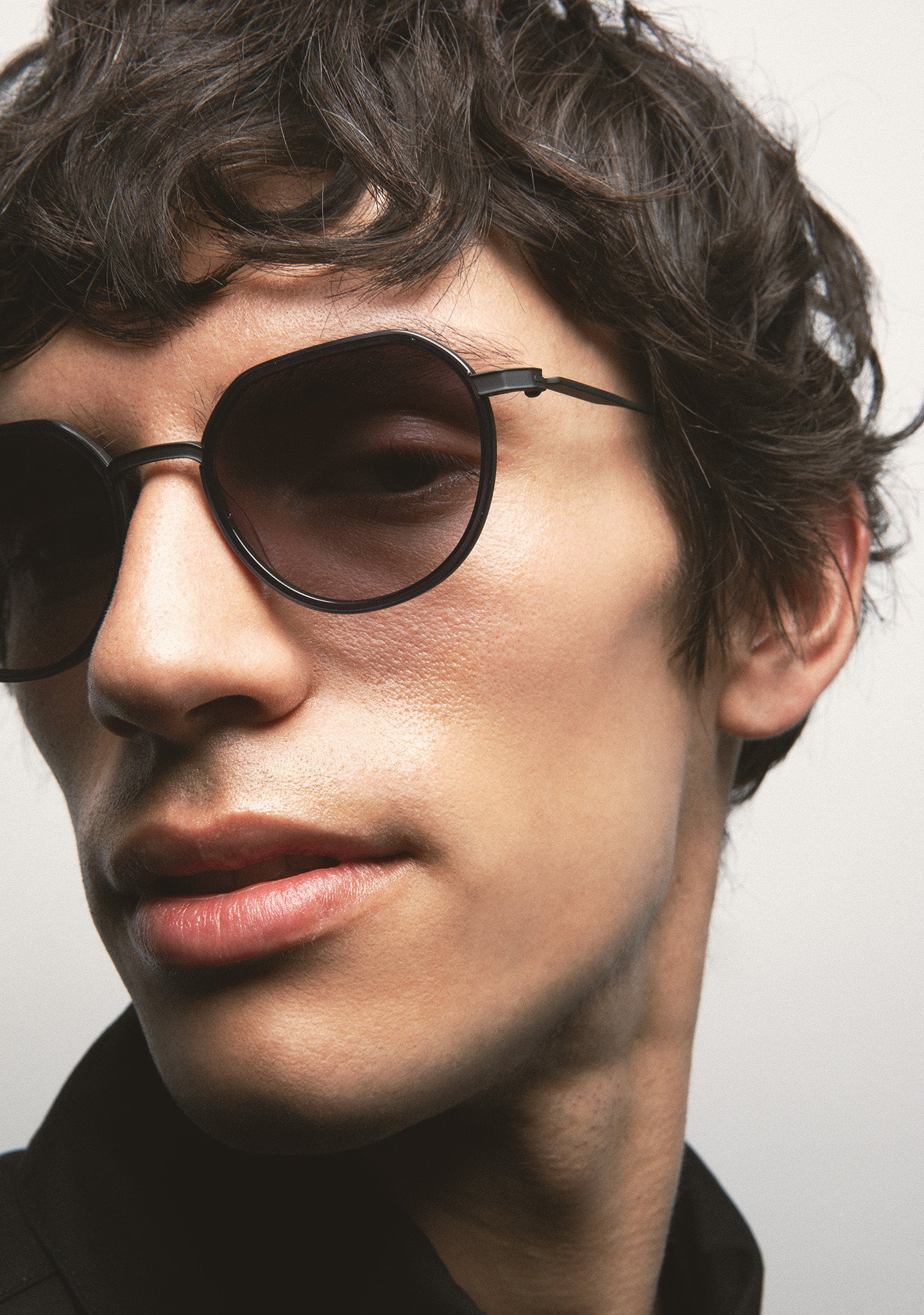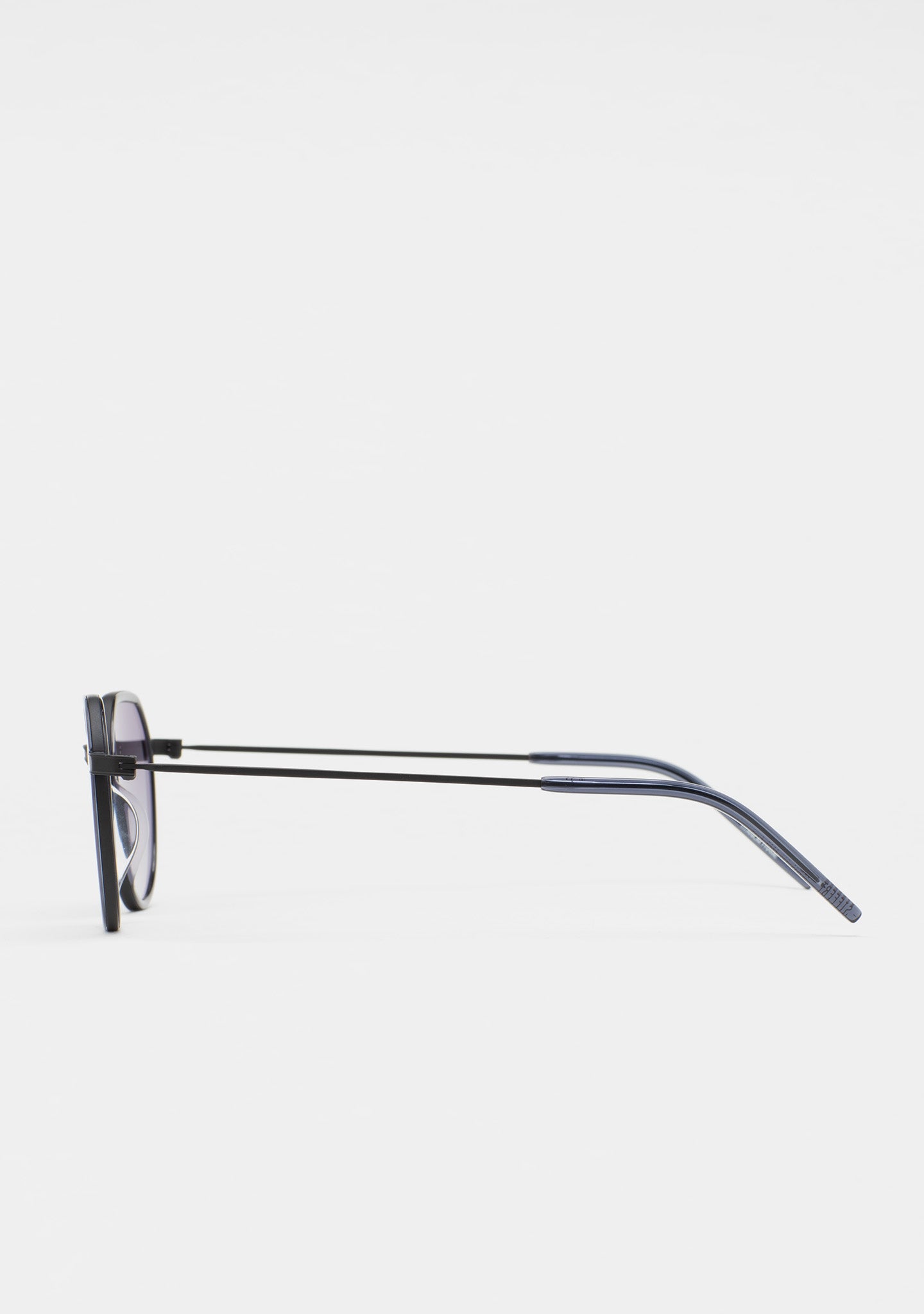 Pantos-shaped sunglasses with a slightly straighter top. Matte dark gray titanium front with black high-density acetate rim. Matte dark gray titanium temples and bridge. Black acetate temple tips. Polarized gray lens, base 2, with 100% UV protection and anti-reflective treatment. Category 3 lens. Integrated acetate nose pads. Handmade.