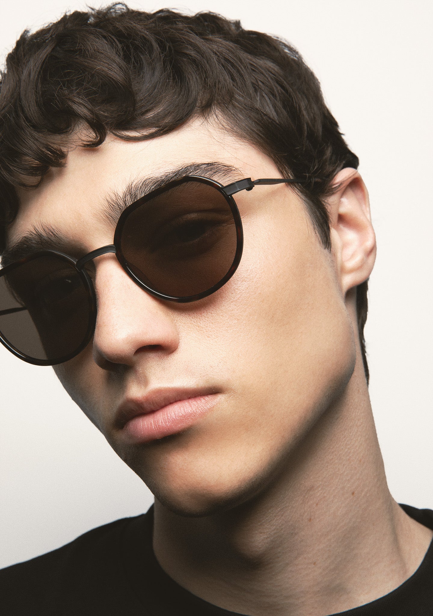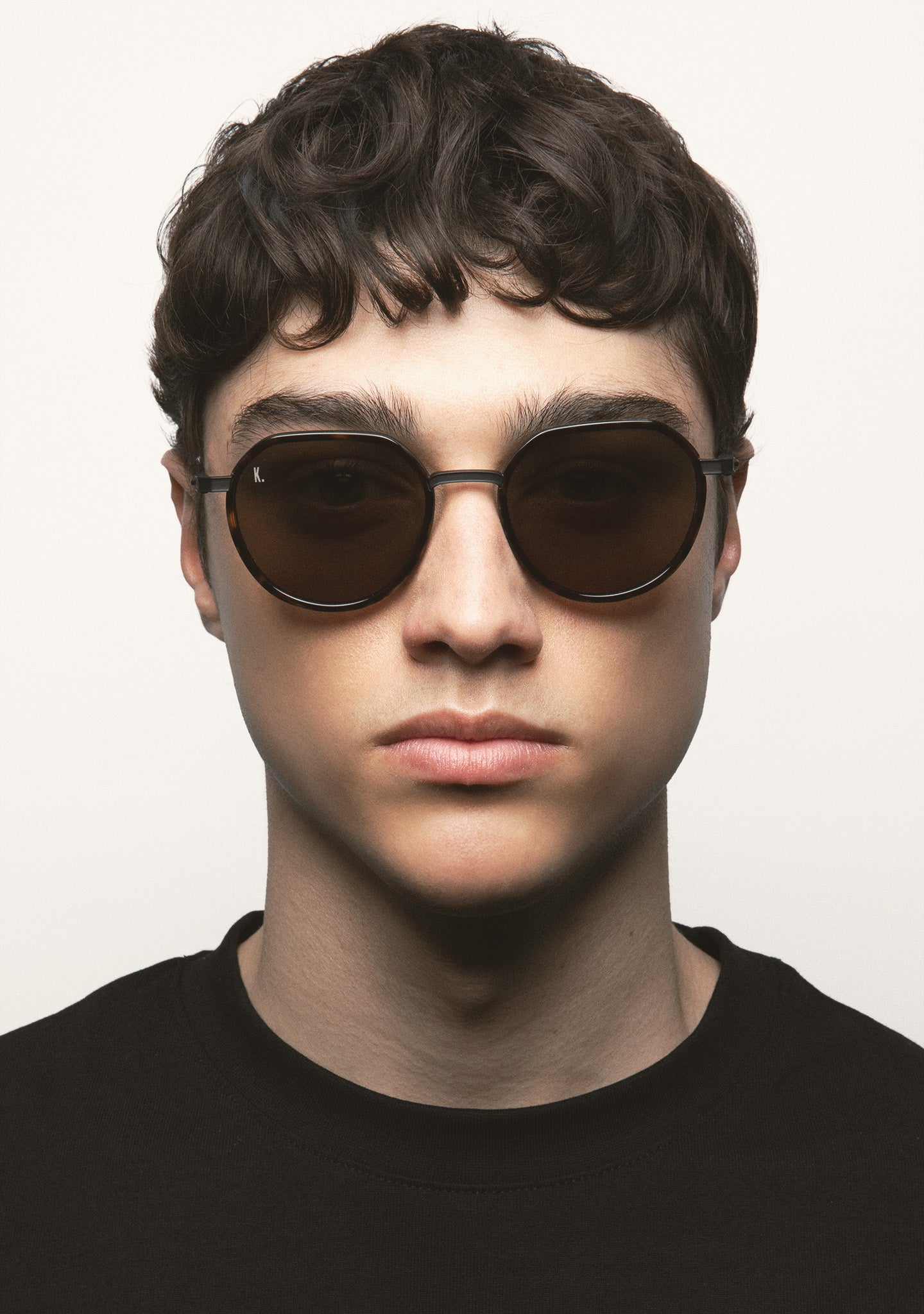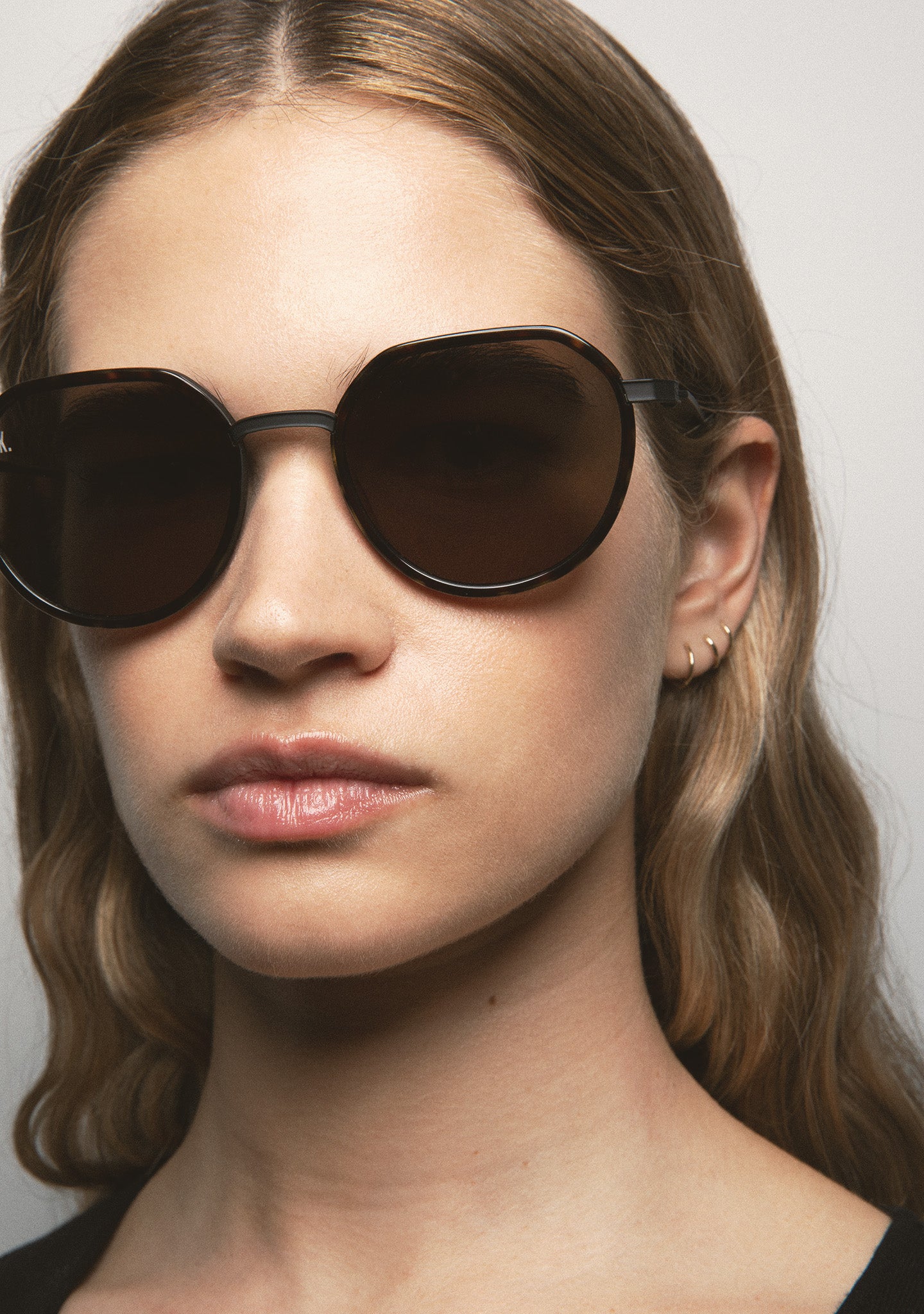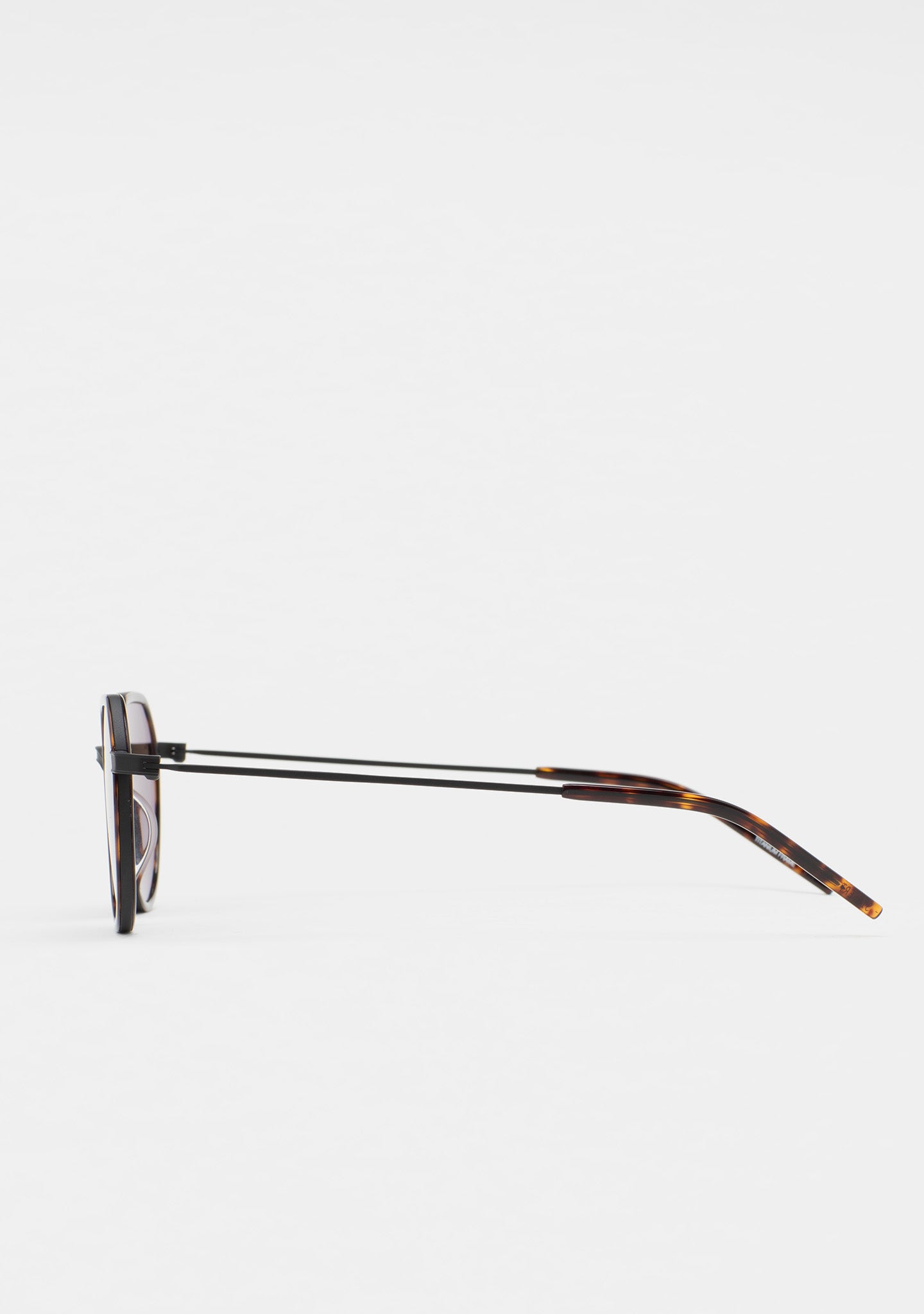 Pantos-shaped sunglasses with a slightly straighter top. Matte dark gray titanium front with black high-density acetate rim. Matte dark gray titanium temples and bridge. Black acetate temple tips. Polarized gray lens, base 2, with 100% UV protection and anti-reflective treatment. Category 3 lens. Integrated acetate nose pads. Handmade.