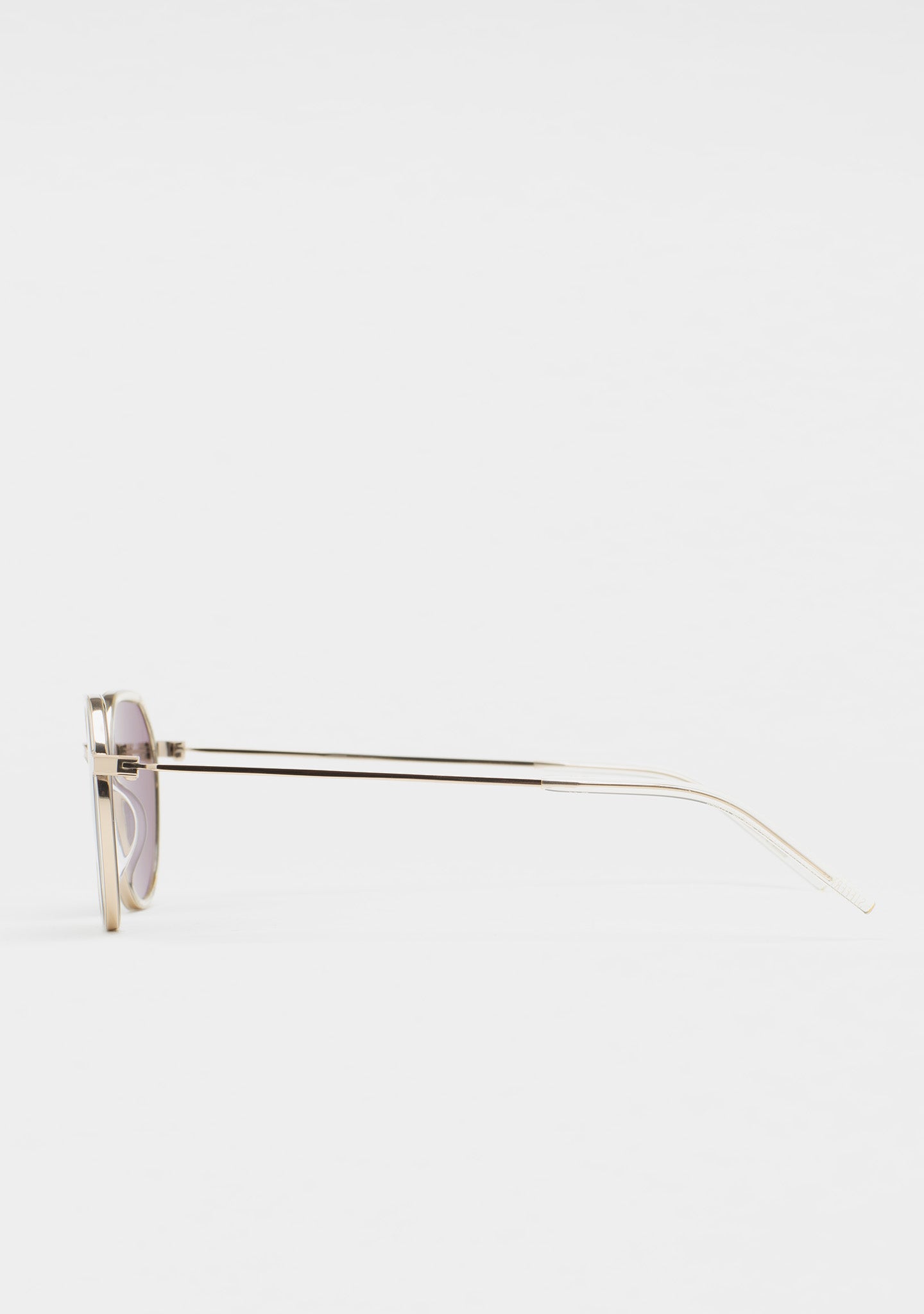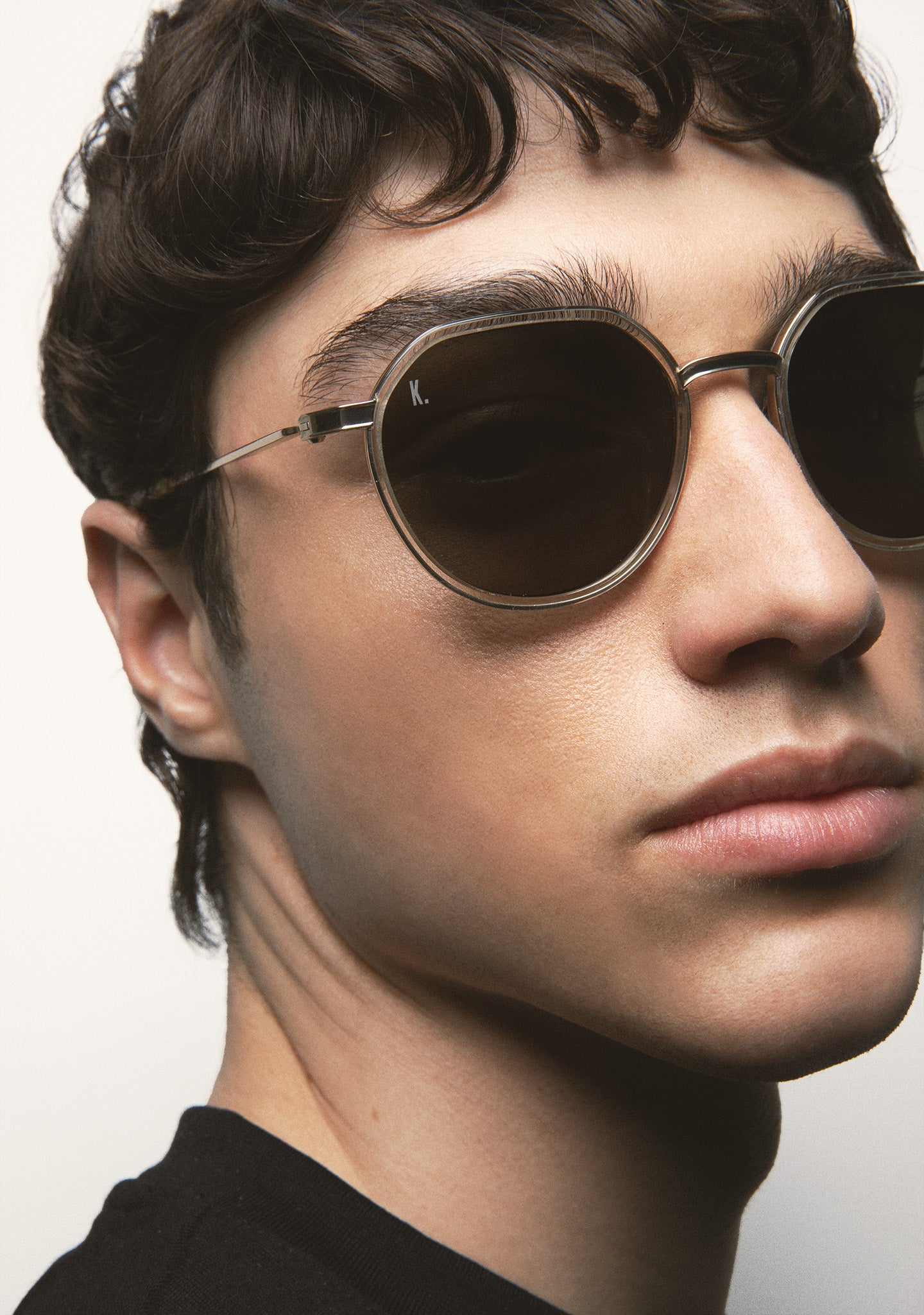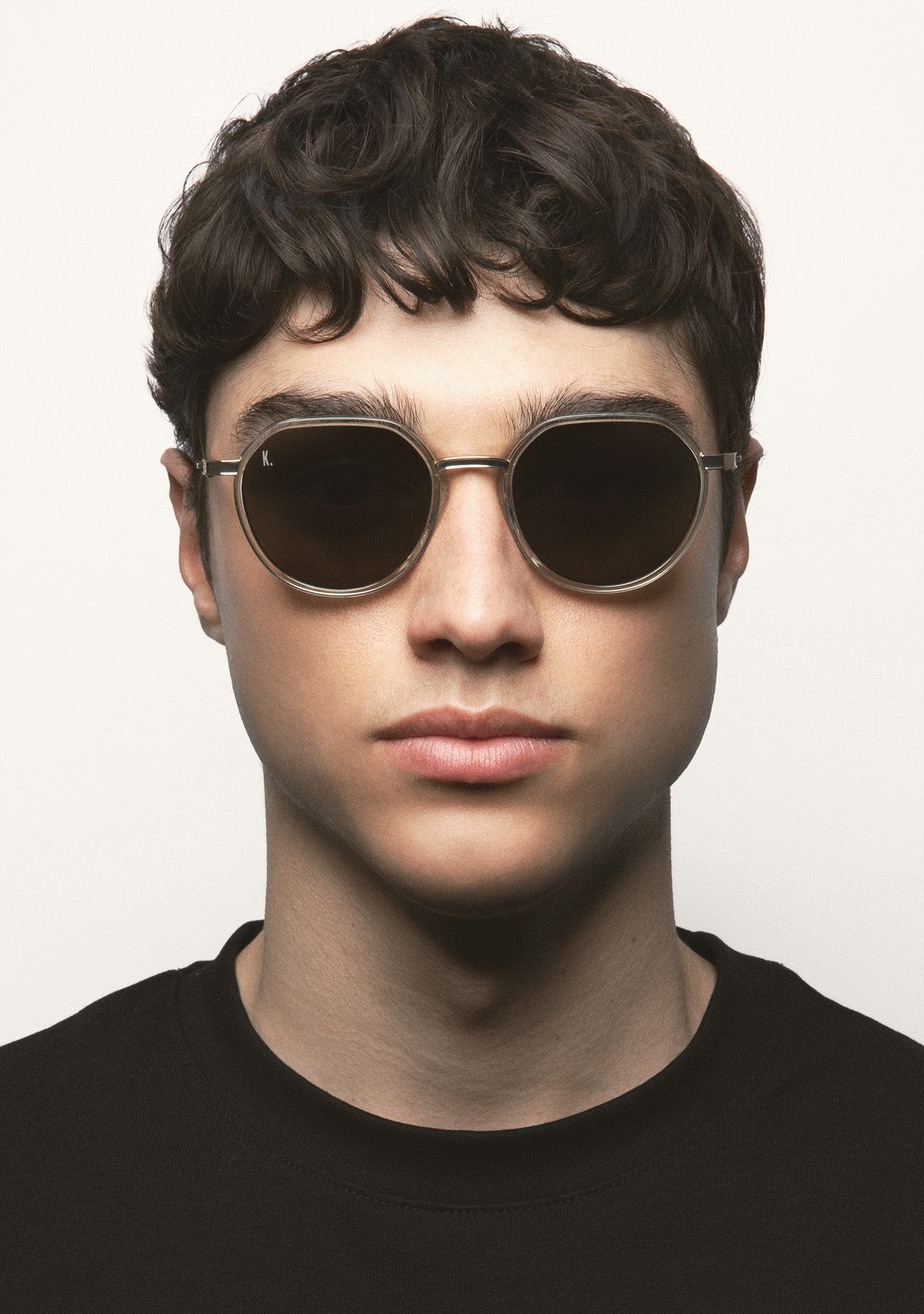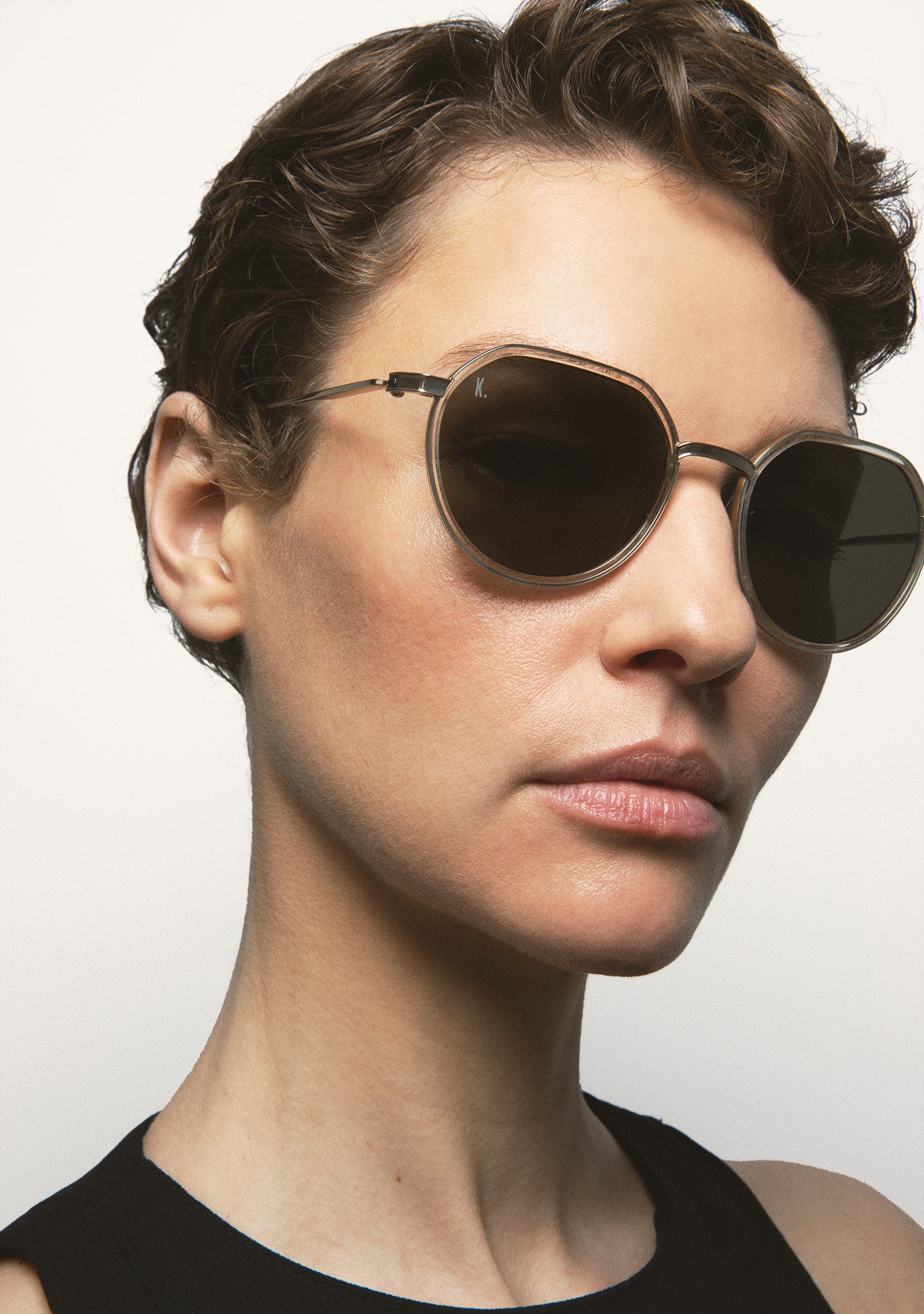 Pantos-shaped sunglasses with a slightly straighter top. Matte dark gray titanium front with black high-density acetate rim. Matte dark gray titanium temples and bridge. Black acetate temple tips. Polarized gray lens, base 2, with 100% UV protection and anti-reflective treatment. Category 3 lens. Integrated acetate nose pads. Handmade.